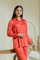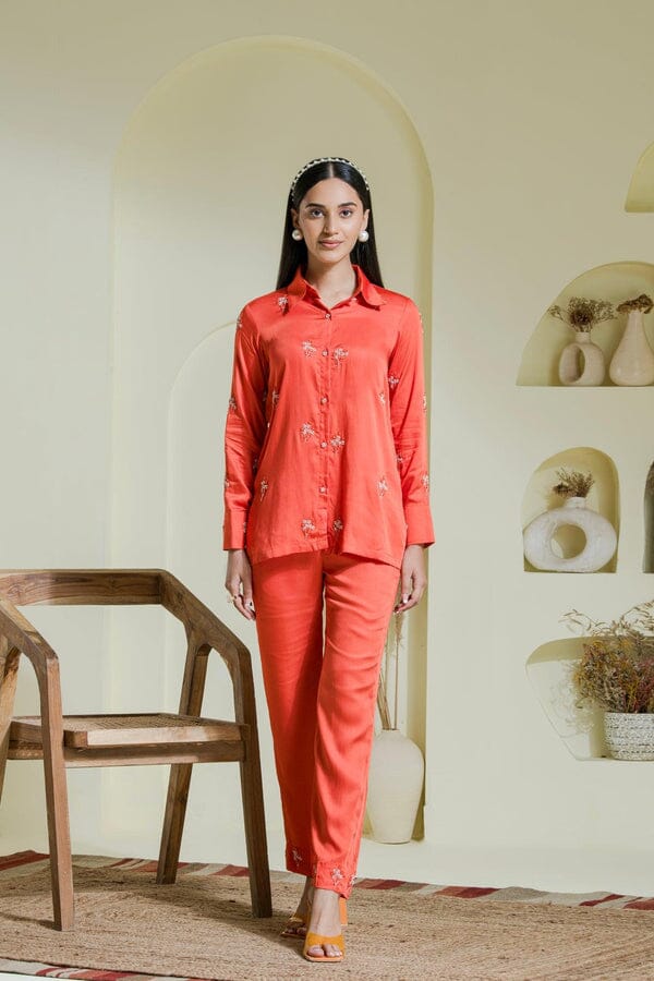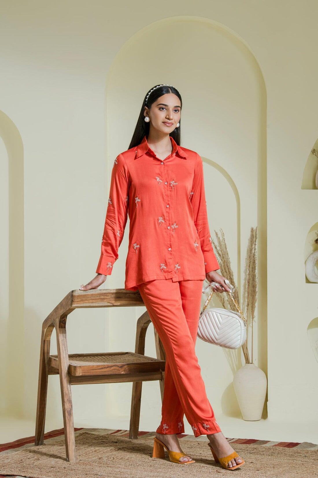 Embrace casual sophistication in our vivid orange satin shirt pants set which is ideal for everyday occasions.Handcrafted with delicate floral motifs on shirt,this beauty is paired with well fitted same coloured pants.The pants are also embellished with embroidered floral motif in the front.