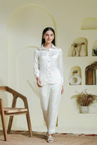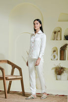 You can never go wrong with white! Step out in style in our silky white shirt set handcrafted with multi coloured sequins on collar and front paired with straight white pants also hand embroidered with multi coloured scattered sequins. Dont forget to check out the sexy back !