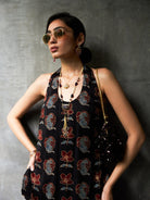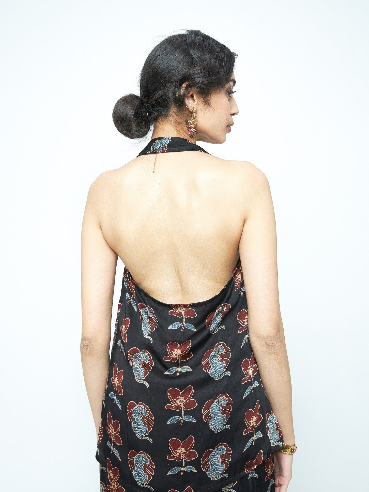 A sleek halter neck top in modal with the Blooming Beast print. Designed with side slits and a side zipper, it’s a bold yet versatile piece that pairs effortlessly with skirts, trousers, or layers.