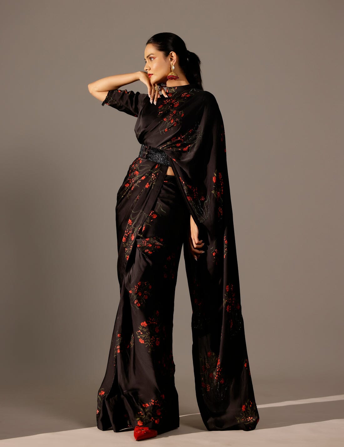 This draped saree gown gives you the best of both worlds—effortless ease and striking glamour. Hand-embellished with sequins and beads, the collared palla flows with elegance, while the embroidered belt cinches the waist for a regal finish. Paired with a blouse, it’s a head-turning ensemble that radiates sophistication.