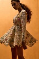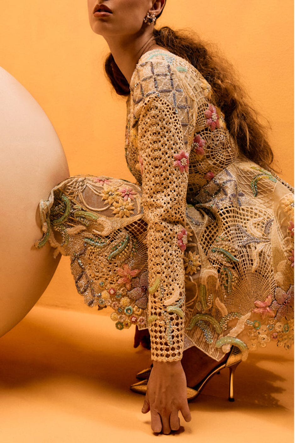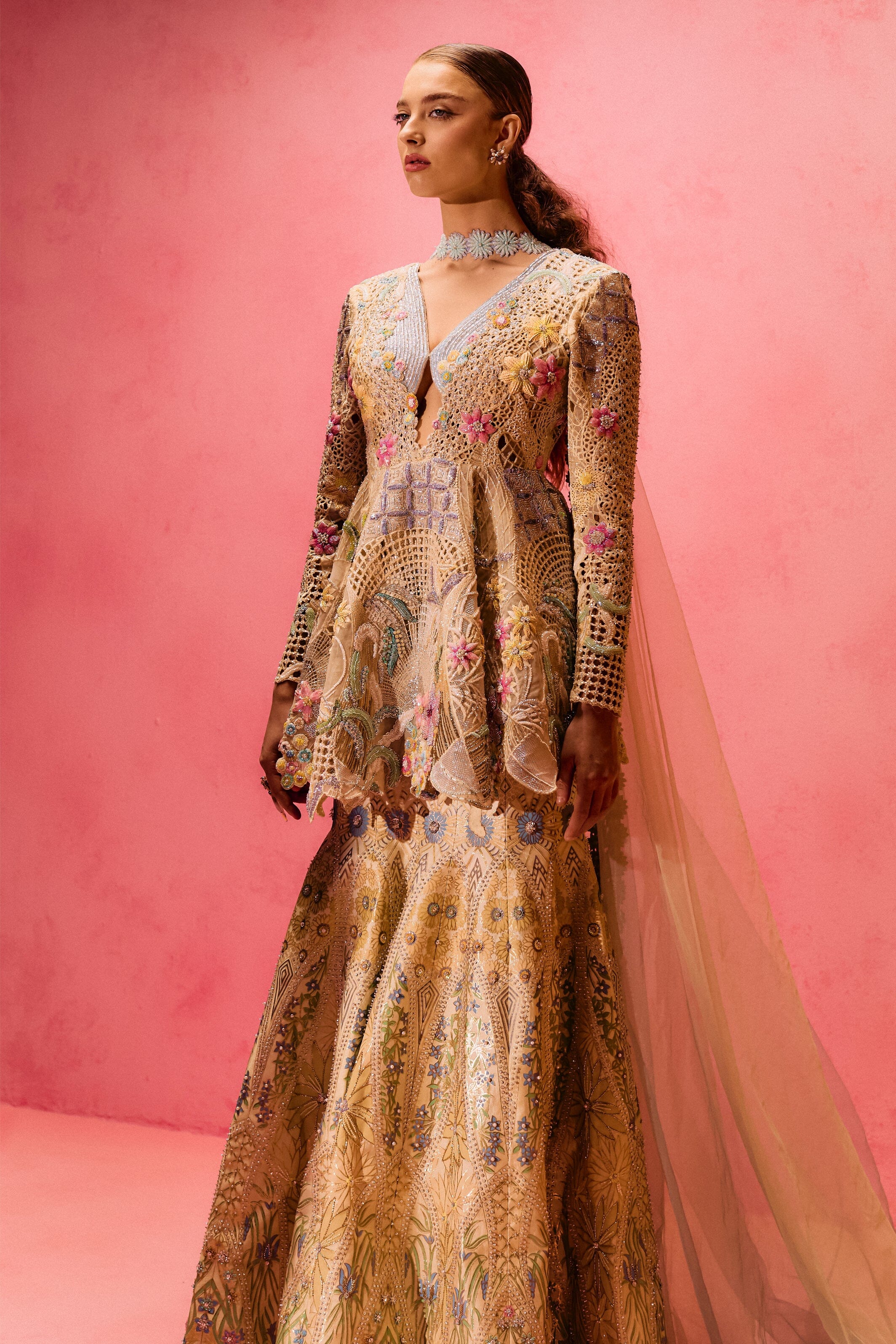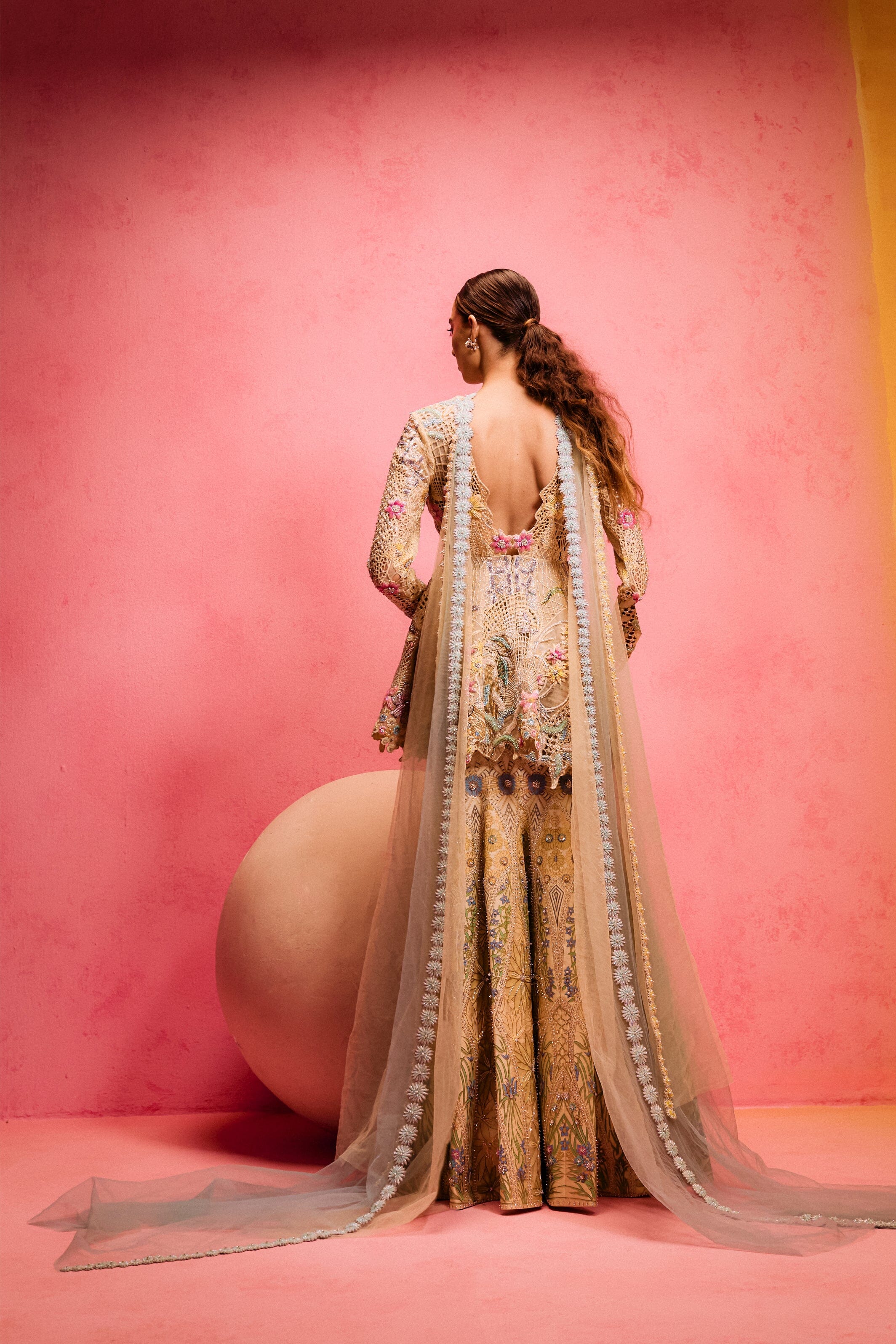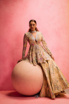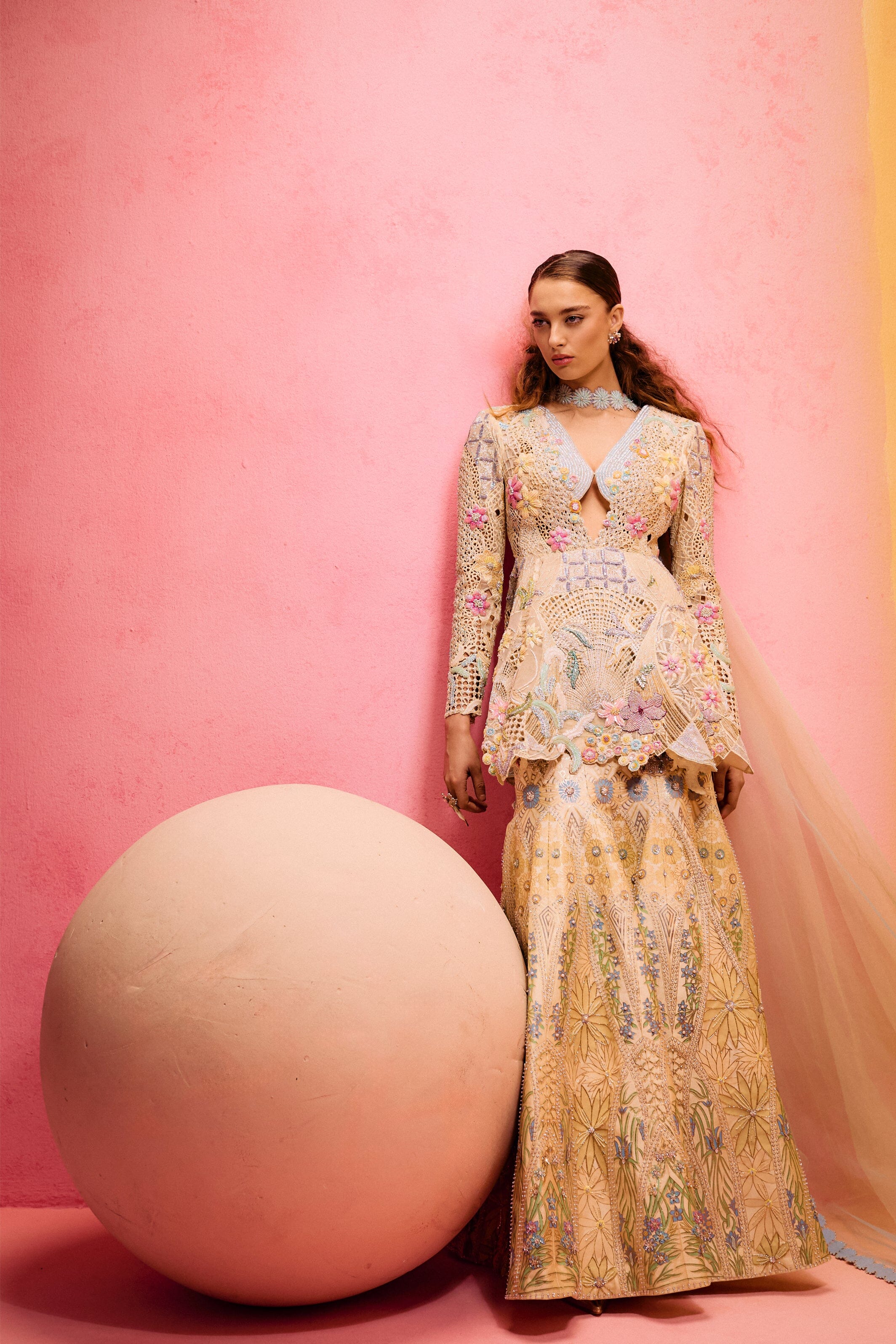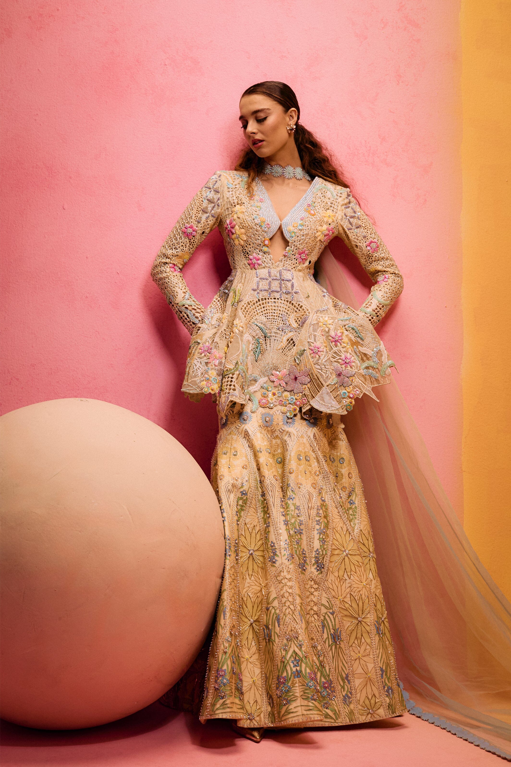 Canary Peplum Set, is a stunning amalgamation of embroidered forgotten flowers and modern silhouettes. The soft-yellow peplum dress is adorned with intricate latticework and 3D embroidery, all hand-embellished taking over 600 hours. A bejewelled double neckline, with delicate floral accents, adds a touch of charm, while realistic embellishments in pink, yellow, mint, and lilac bring the reimagined garden to life. The craftsmanship, featuring ‘freeshia jaali’ in zardosi, adds a rich, timeless detail.