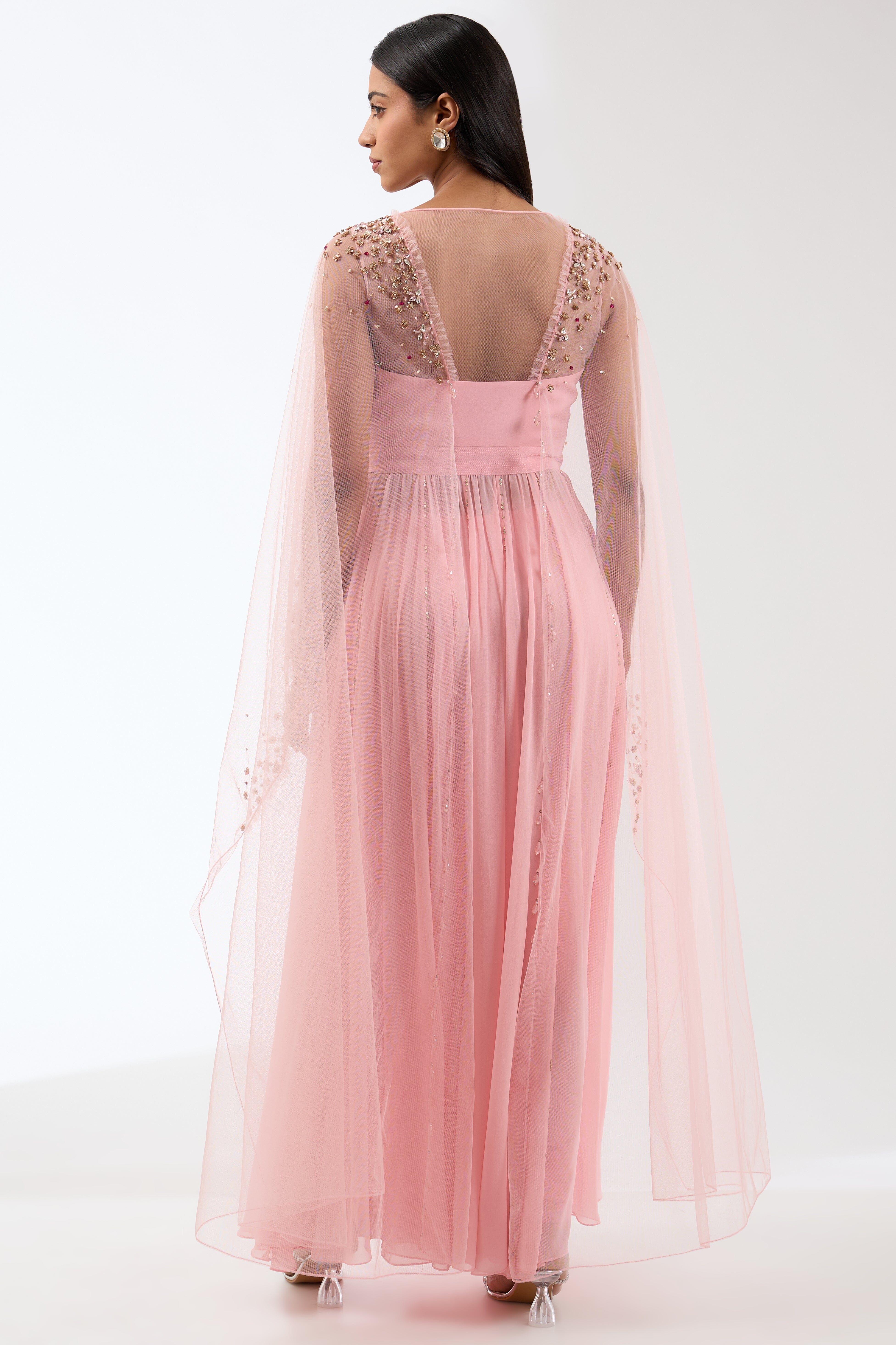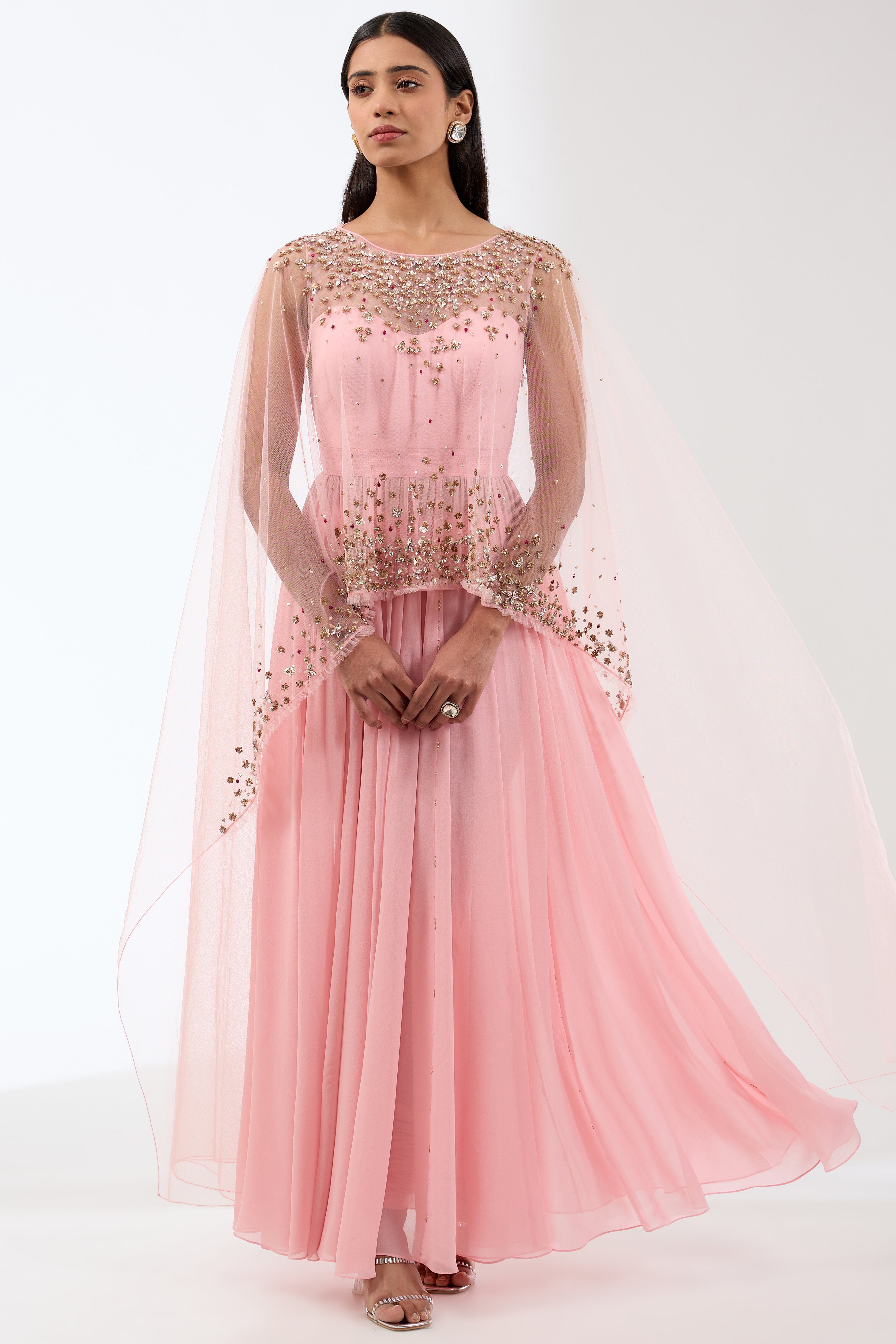 A gorgeous flowing kurta with an attached tulle cape intricately embroidered with sequins and crystals, paired with churidar pants.