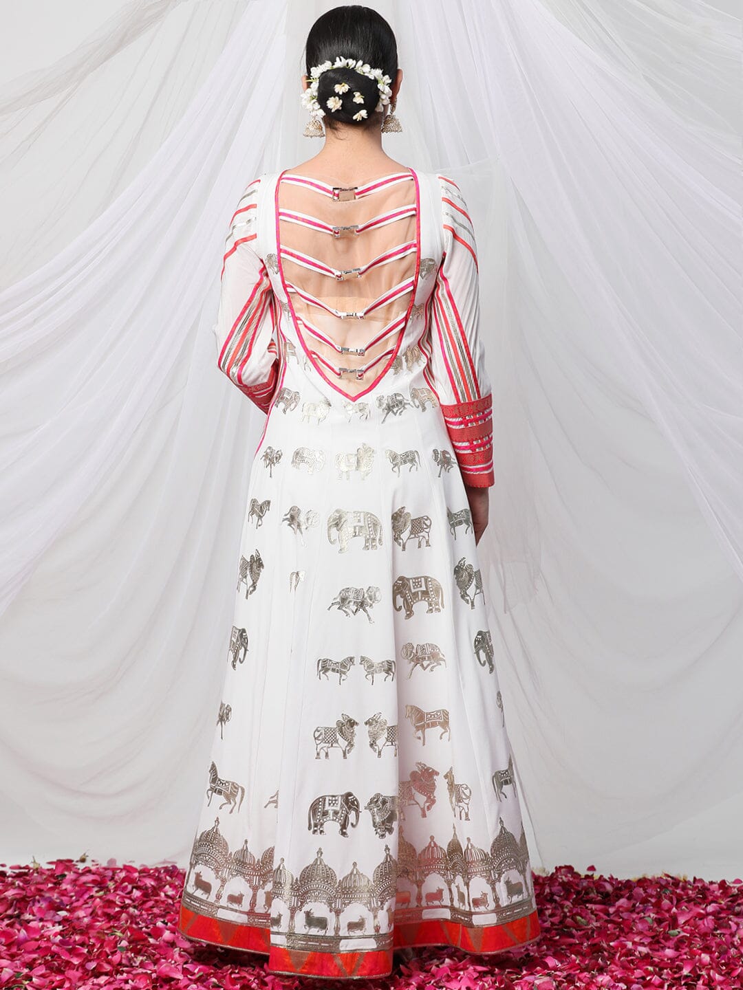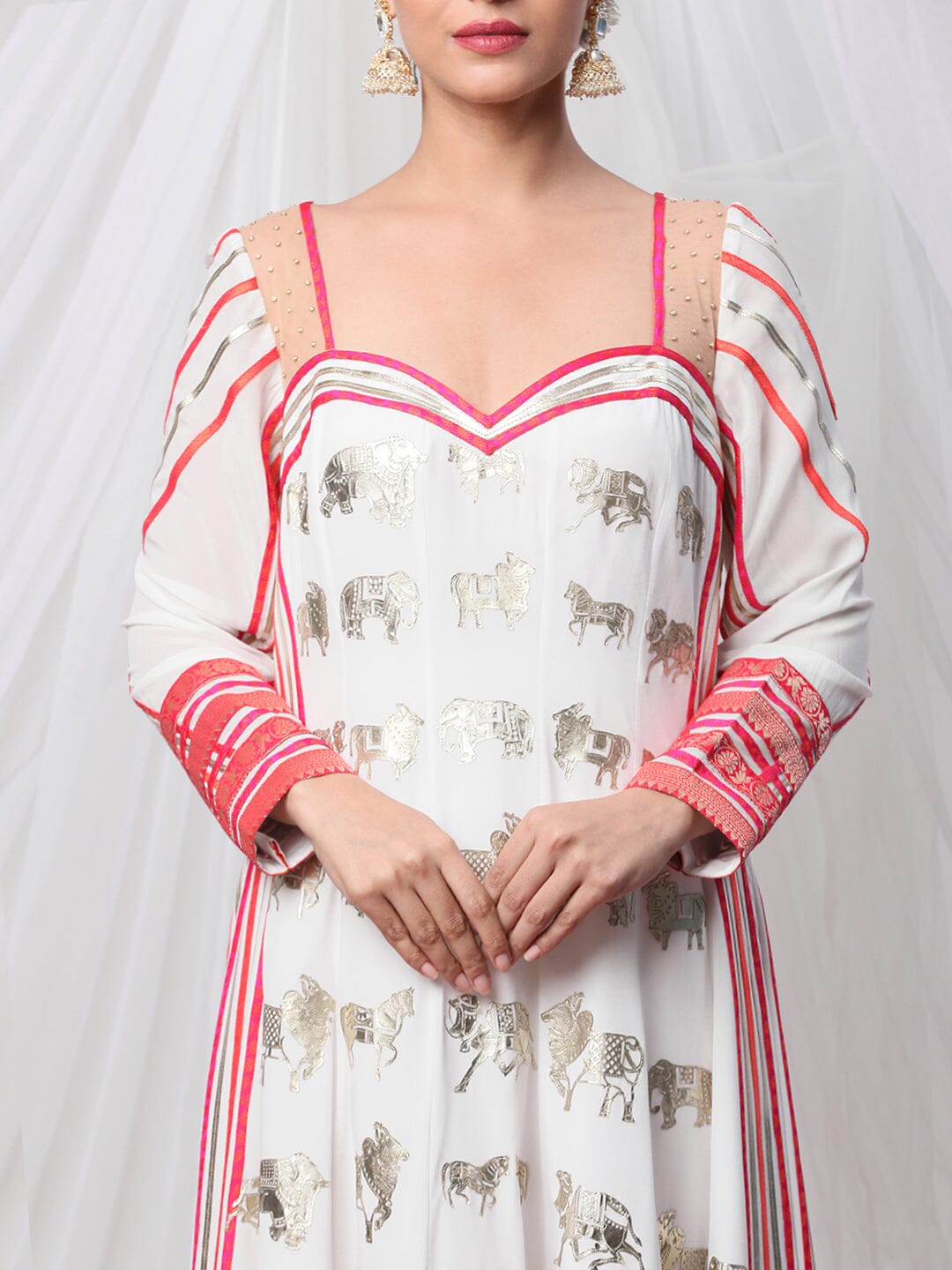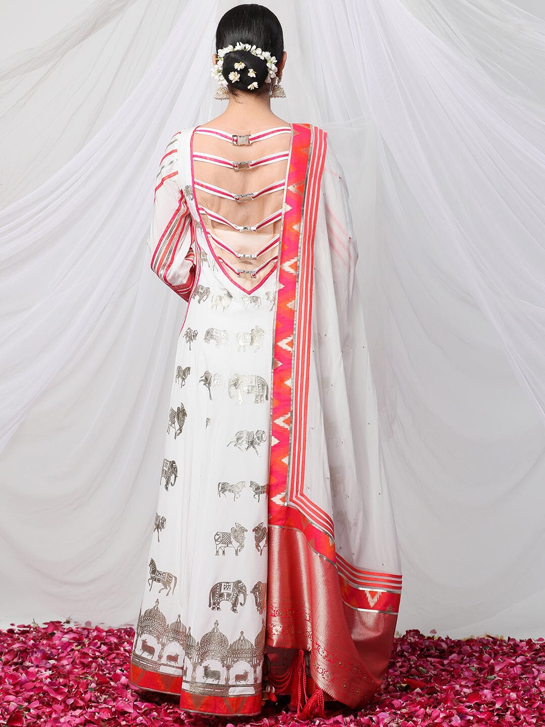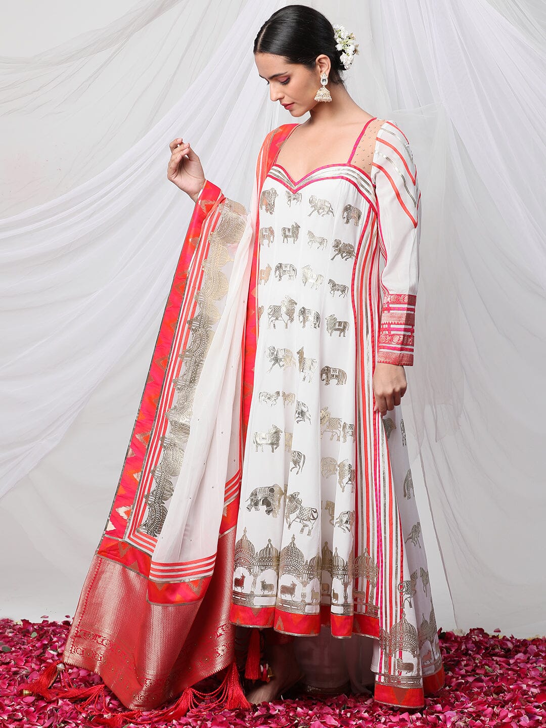 White A-line suit with churidar and dupatta. It's intricate gold cut-work patches and crepe suit with its sleek lines, provides a striking contrast - a pure statement of luxury and refinement. Experience the elegance of Chitrakala Kamdhenu in this gorgeous anarkali piece.