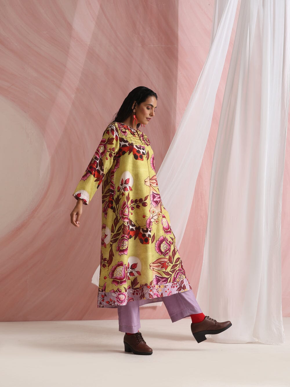 A serene green Chanderi tunic with delicate yoke pleats paired with contrast pants—an effortlessly graceful ensemble that feels as timeless as it looks.