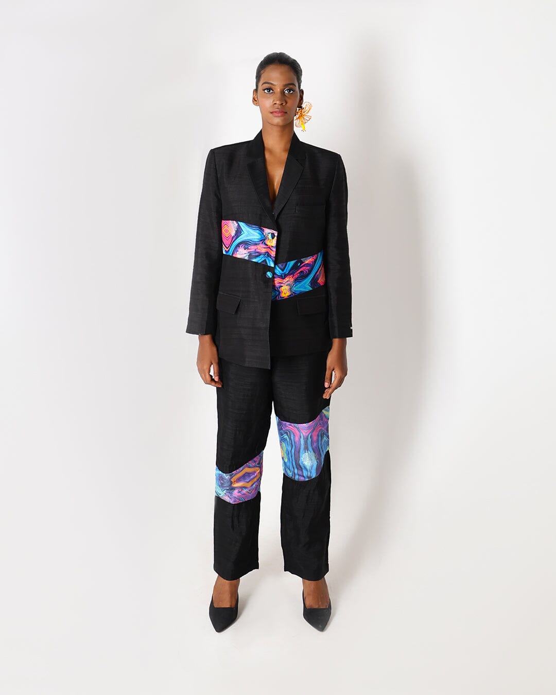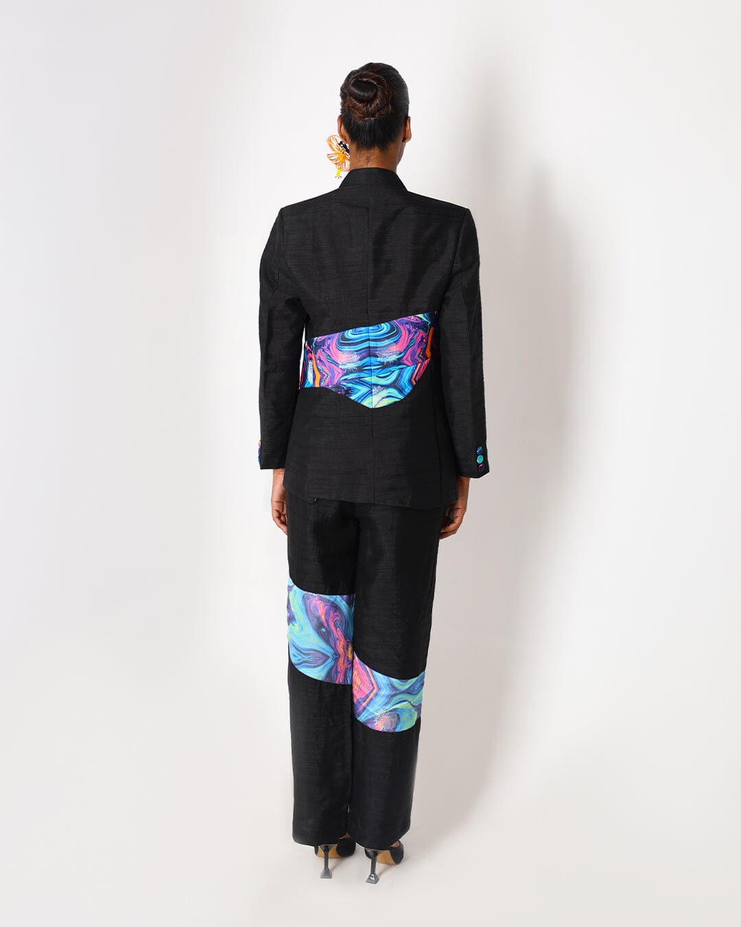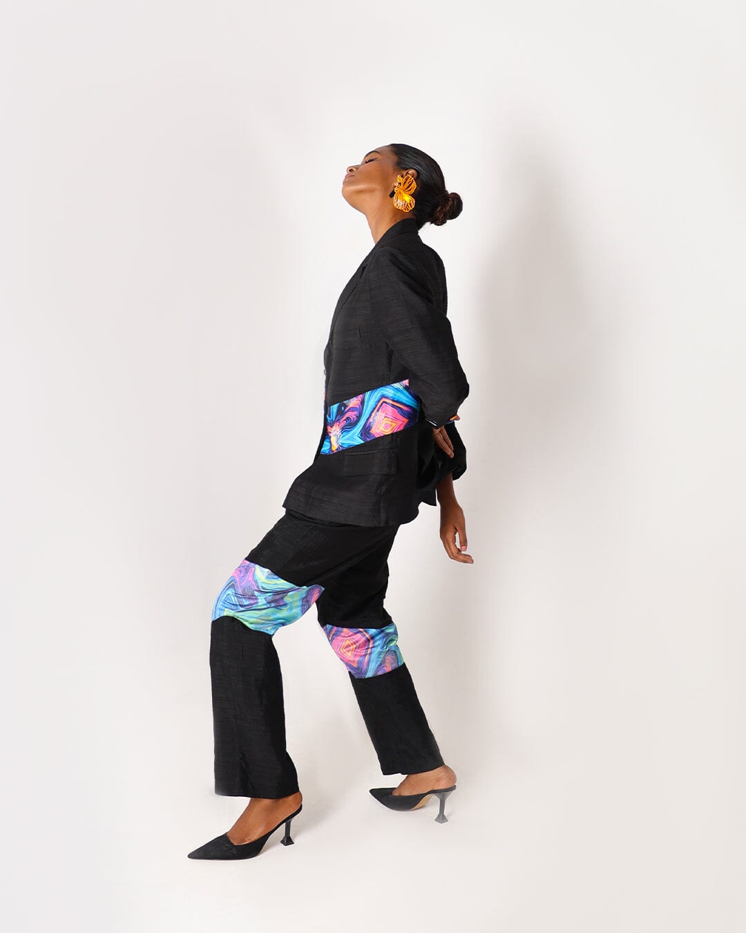 Exude sophistication and modernity with our Black and Holographic Print Pant Suit. Made from luxurious silk fabric, this suit showcases a captivating holographic print and a high low front design, blending classic black with futuristic charm for a stylish and confident ensemble. The Pant comes with back elastic for that added comfort.