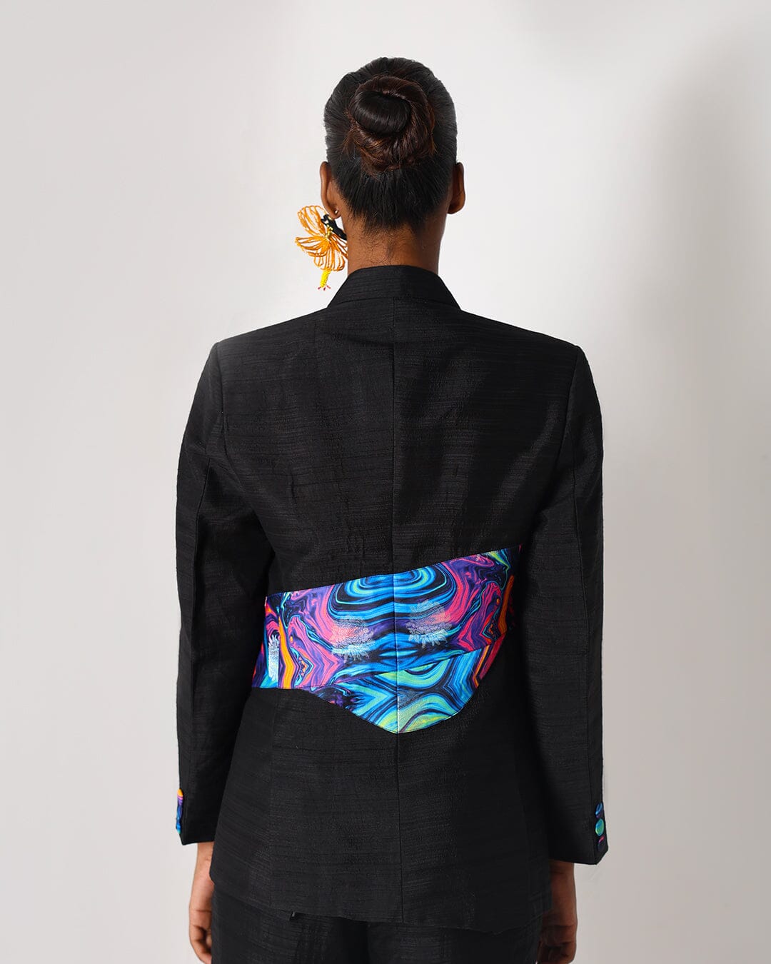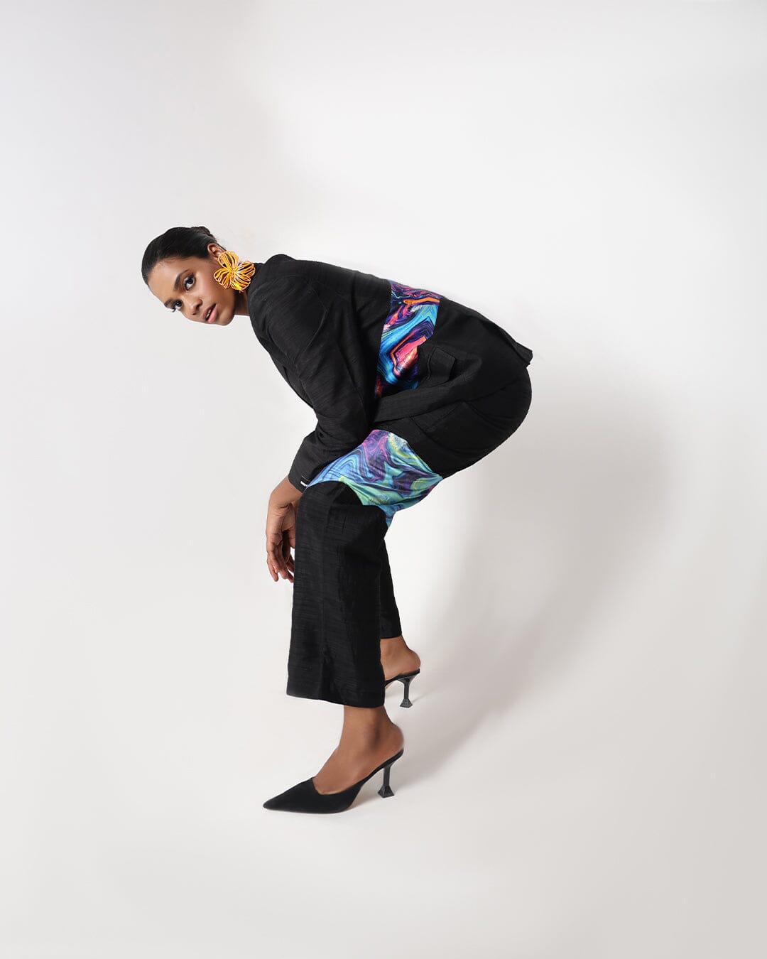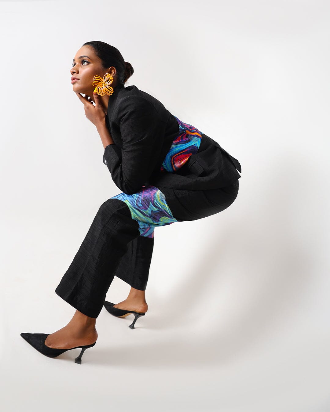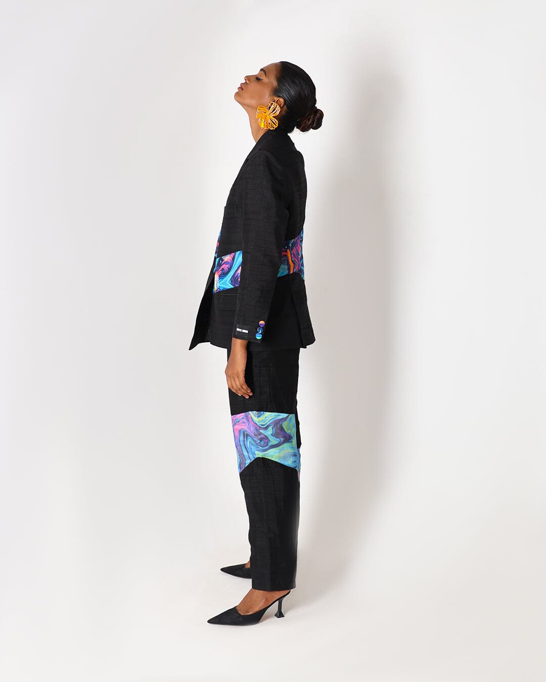 Exude sophistication and modernity with our Black and Holographic Print Pant Suit. Made from luxurious silk fabric, this suit showcases a captivating holographic print and a high low front design, blending classic black with futuristic charm for a stylish and confident ensemble. The Pant comes with back elastic for that added comfort.