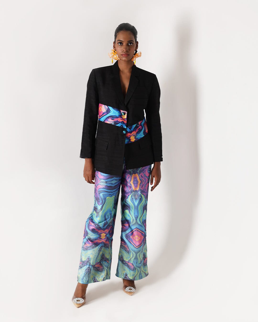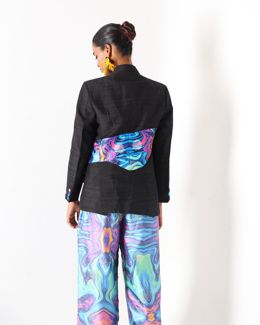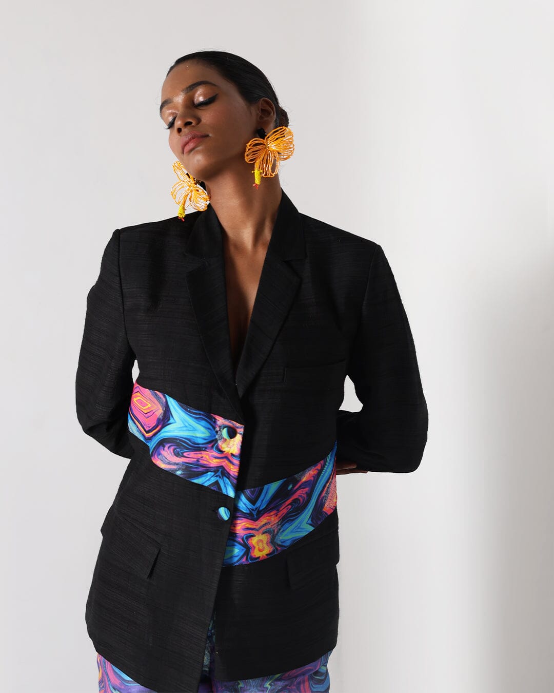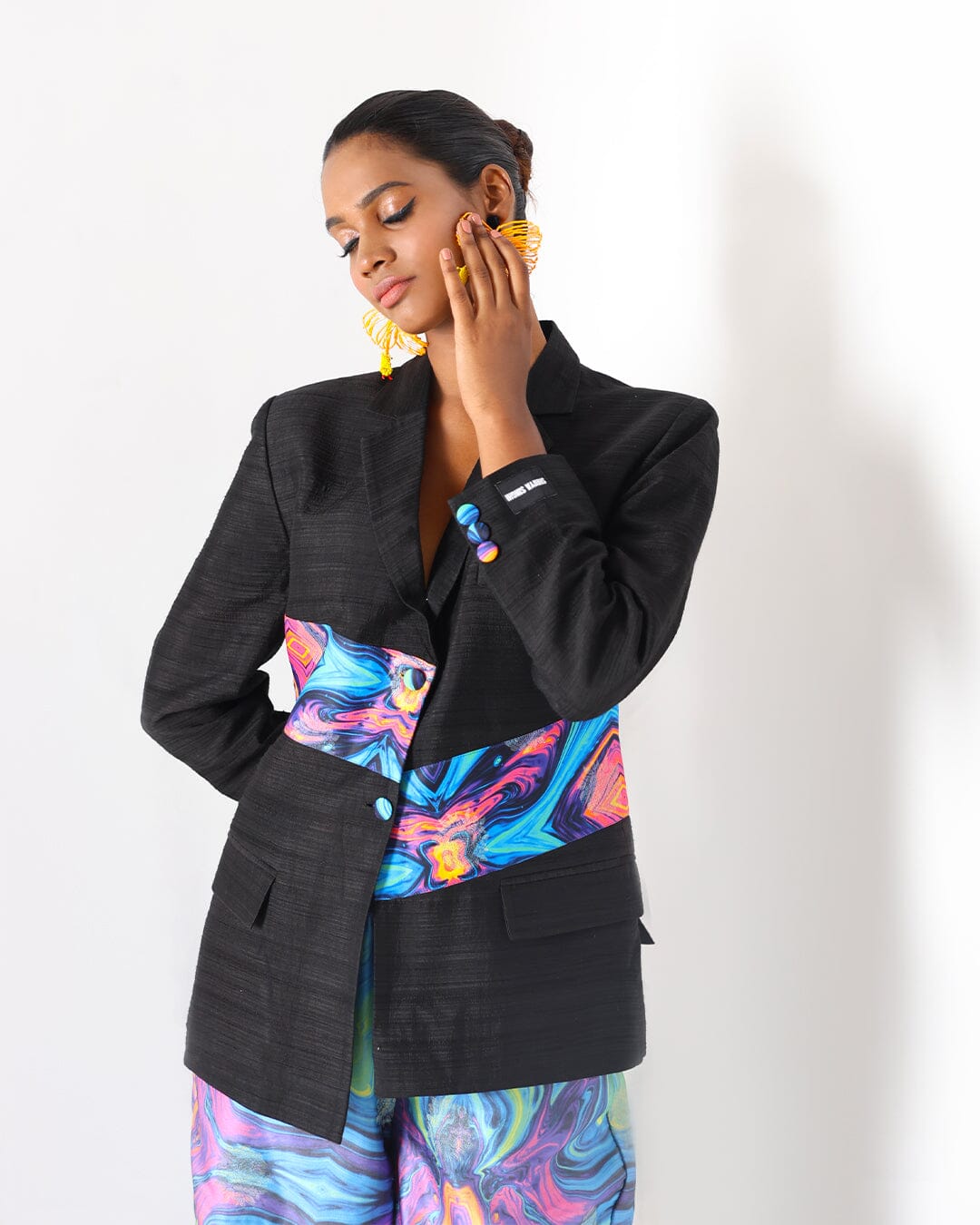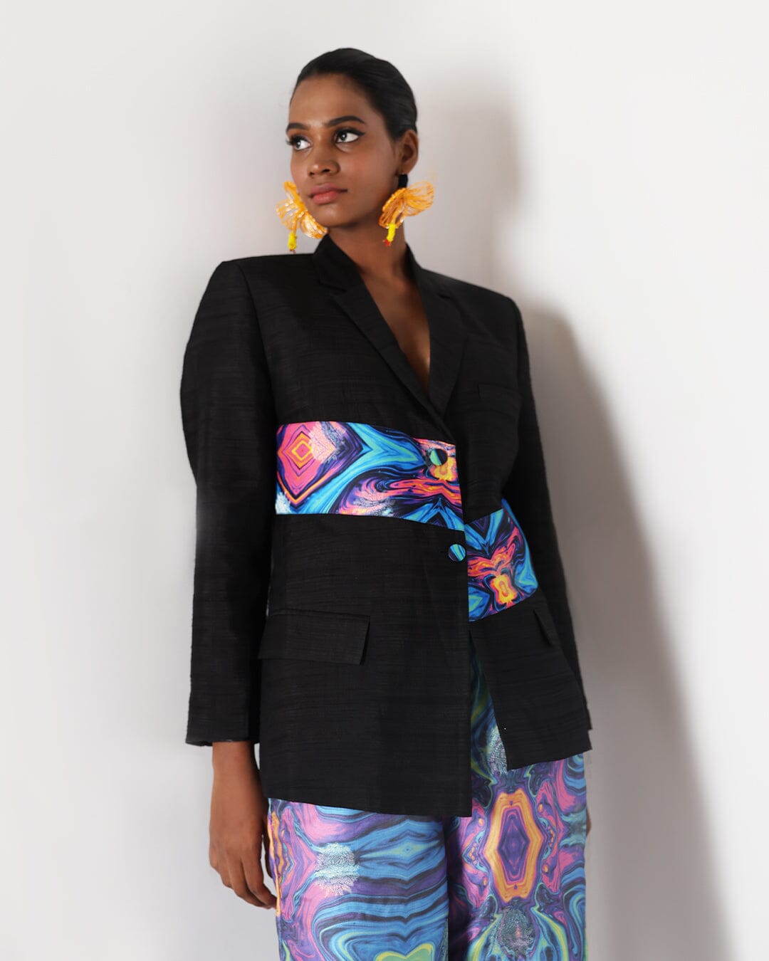 Make a bold fashion statement with our Black and Holographic Print Blazer. Crafted from silk fabric, this blazer features a high low front design, combining the timeless elegance of black with a futuristic holographic print for a captivating and unique look.