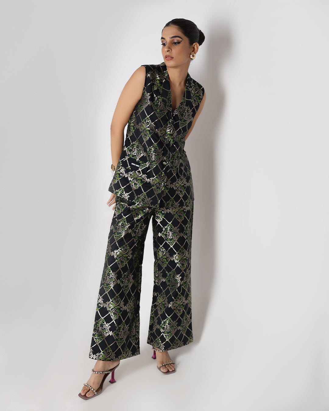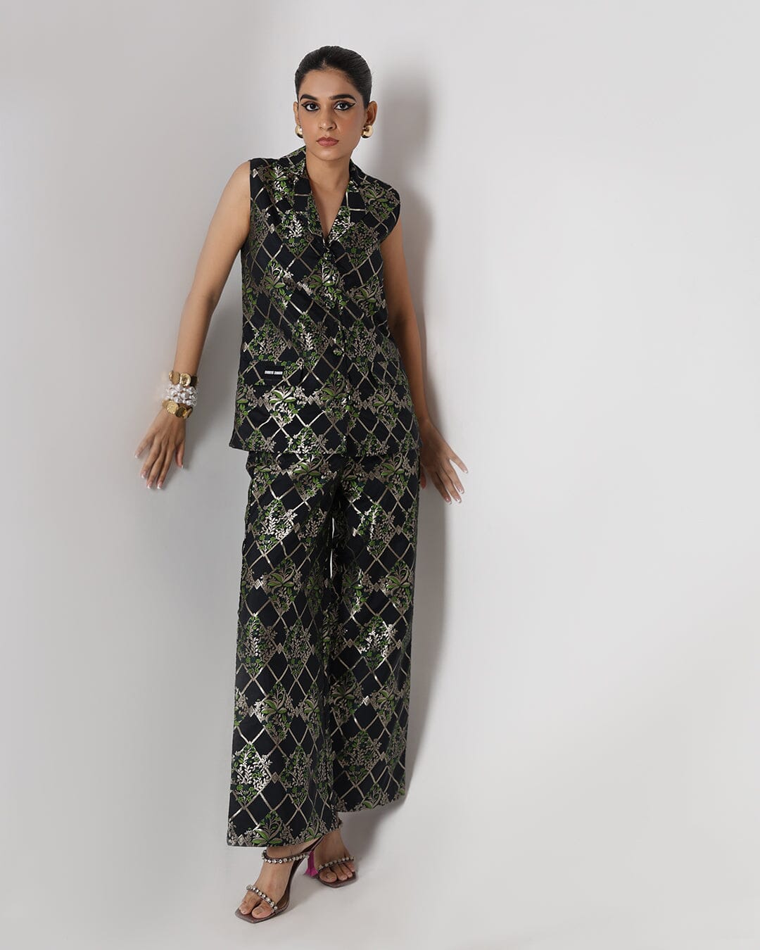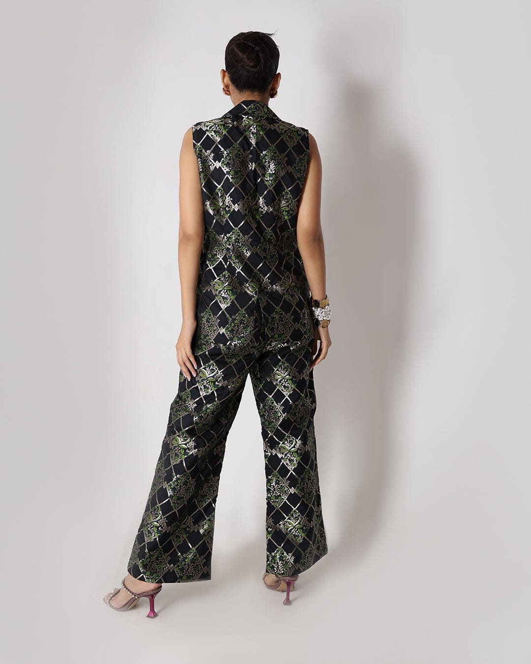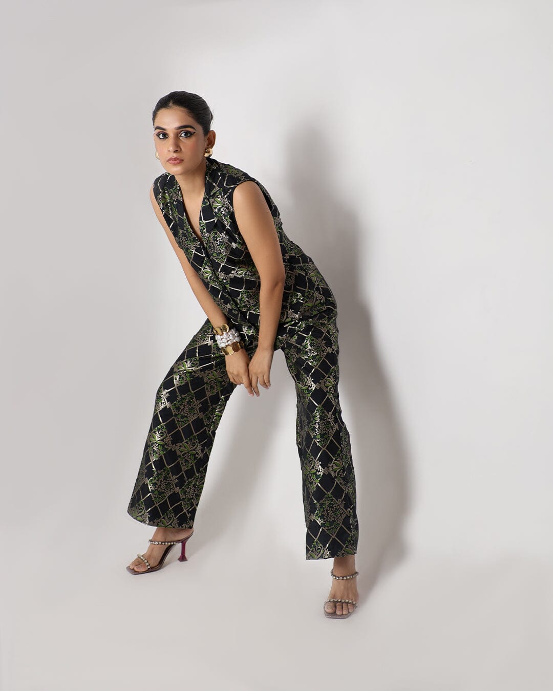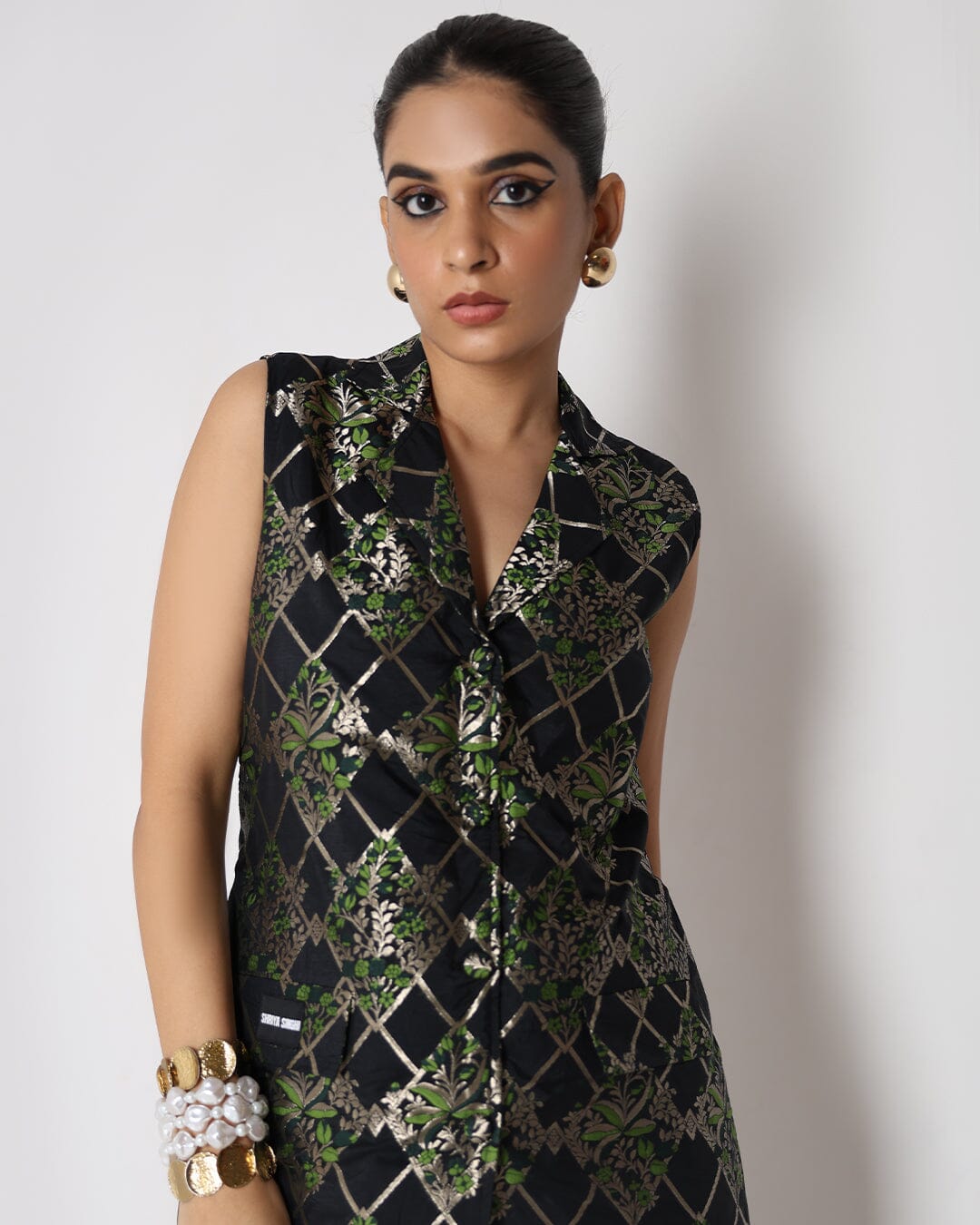Make a striking impression with our Black Sleeveless Button-Down Silk Pant Suit. Crafted from luxurious banarasi silk fabric, this suit showcases intricate Meena and gold zari weaving, adding a touch of opulence and sophistication to your ensemble. The pant come with back elastic for that added comfort.