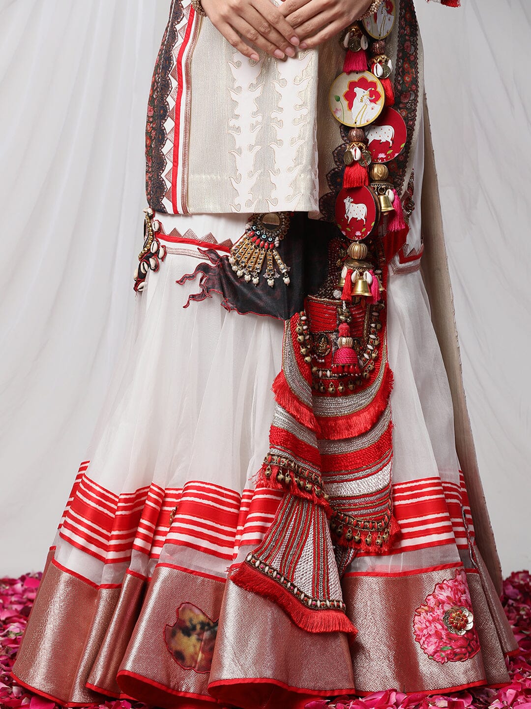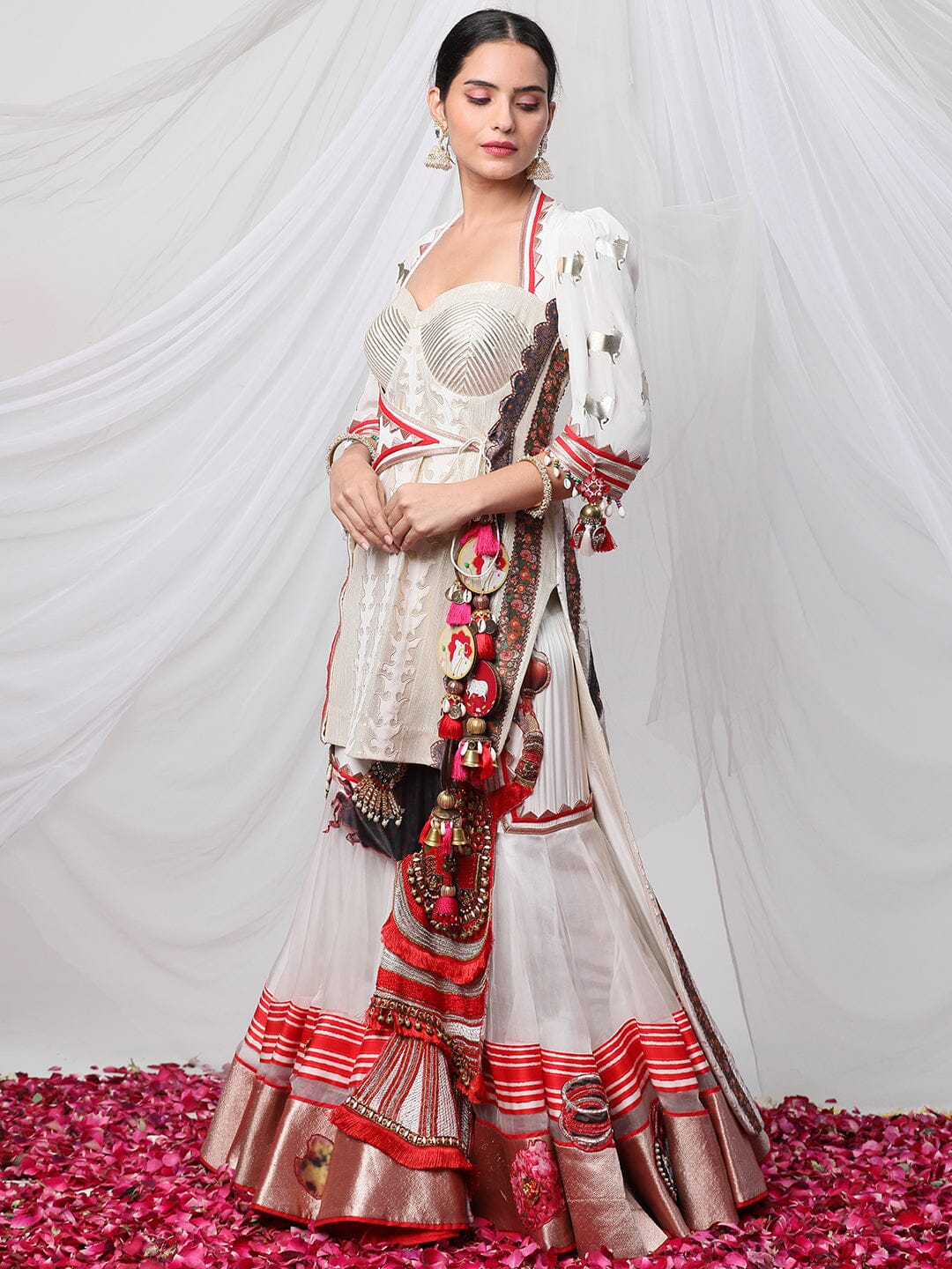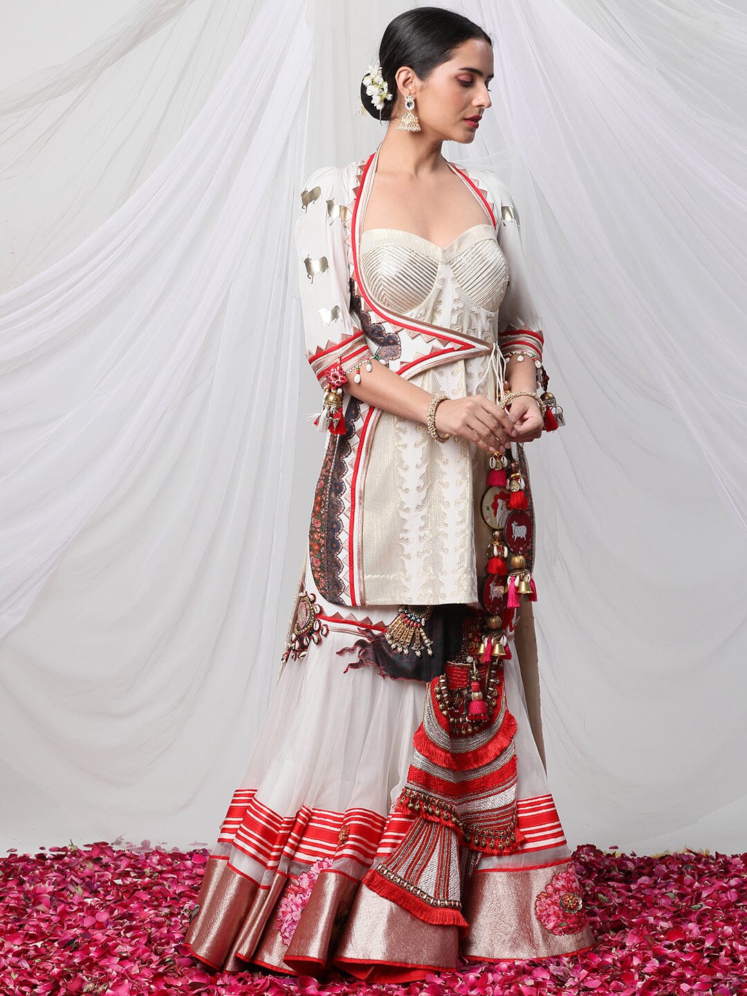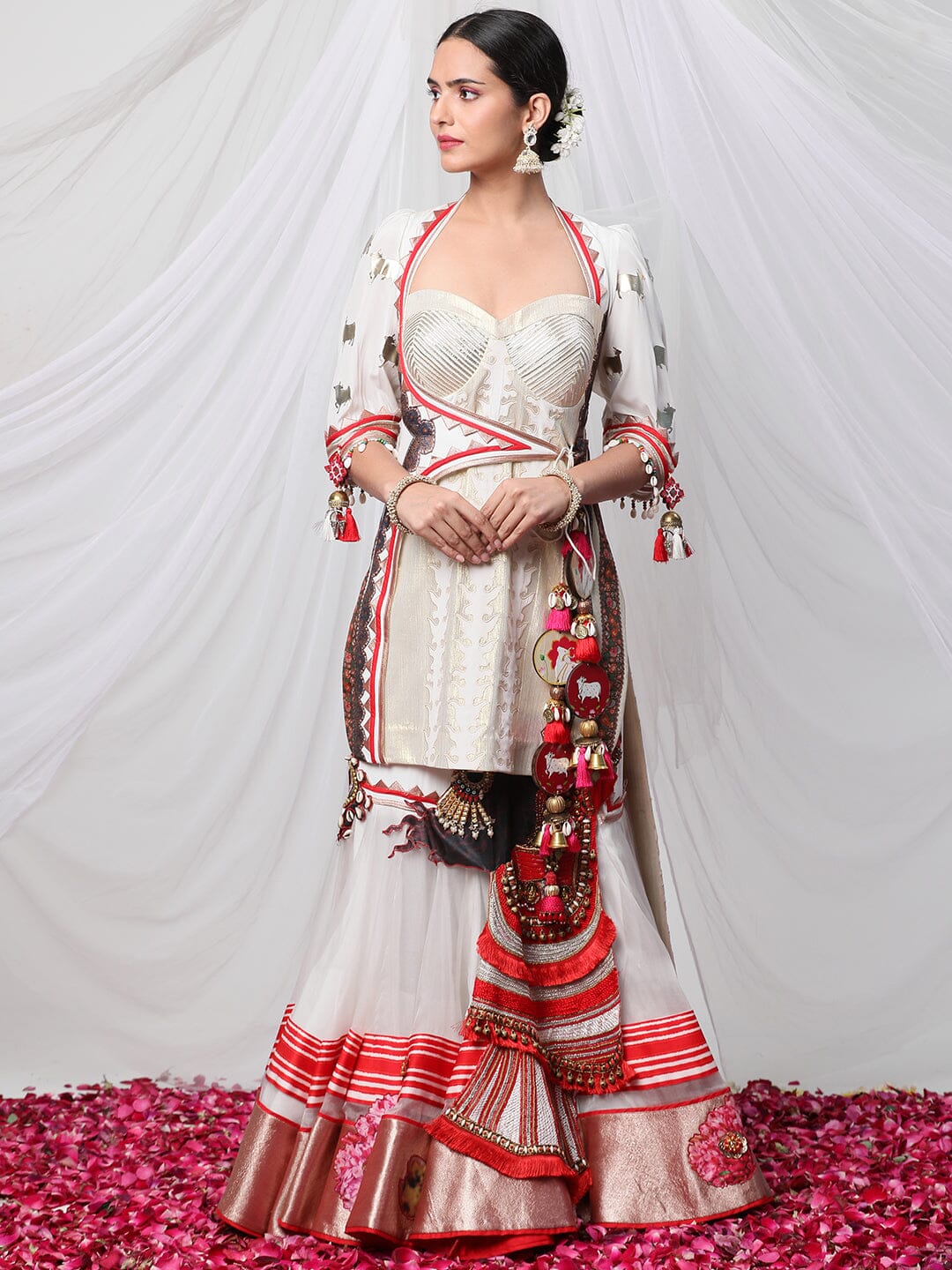Garad Angrakha Lehenga - Inspired by gauri(durga), this lehanga set brings elements of akalbodhan, translating to the untimely awakening of Durga. The set features a gota bralette, an angrakha jacket and a full-pleated skirt, making it a perfect royal garment for your special occasions.