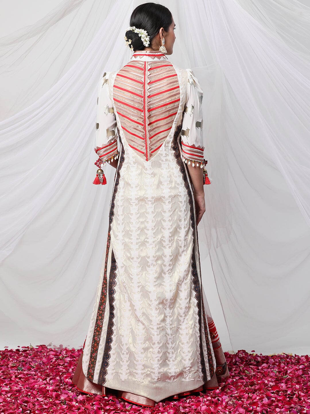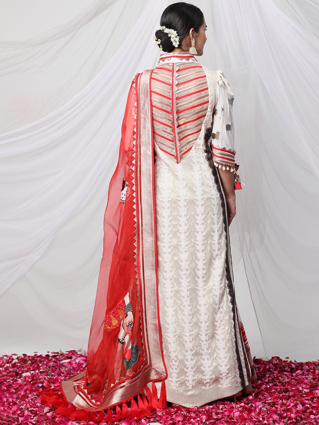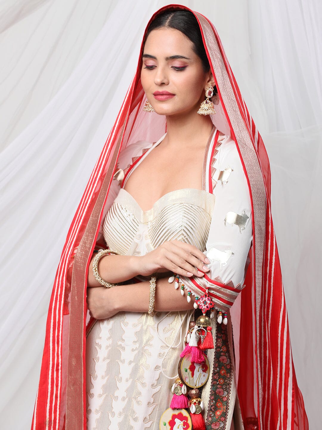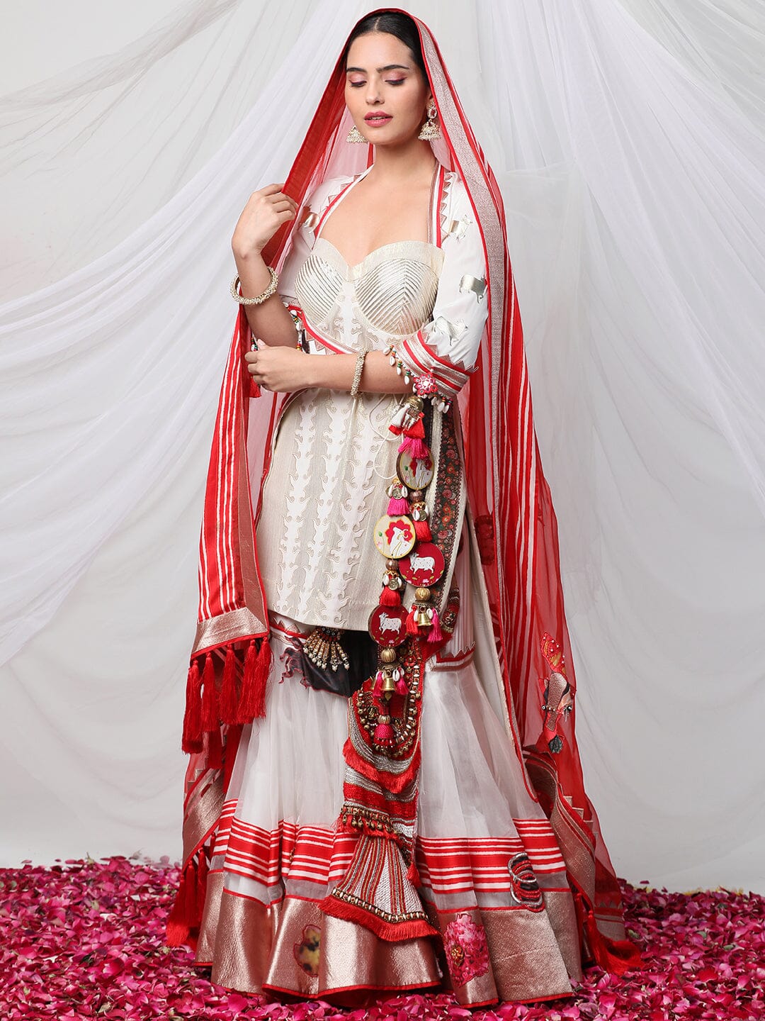 Garad Angrakha Lehenga - Inspired by gauri(durga), this lehanga set brings elements of akalbodhan, translating to the untimely awakening of Durga. The set features a gota bralette, an angrakha jacket and a full-pleated skirt, making it a perfect royal garment for your special occasions.