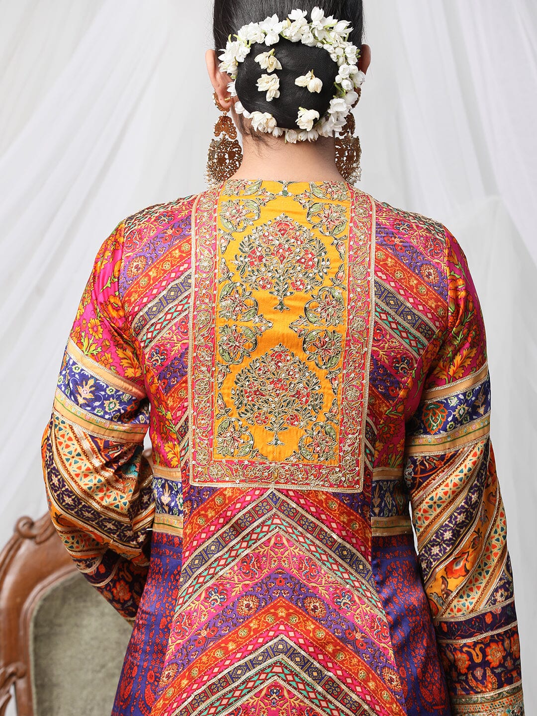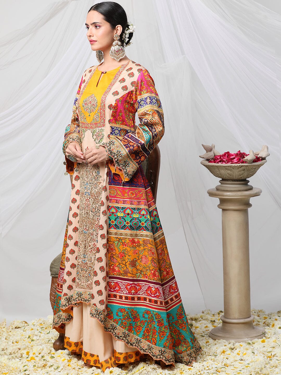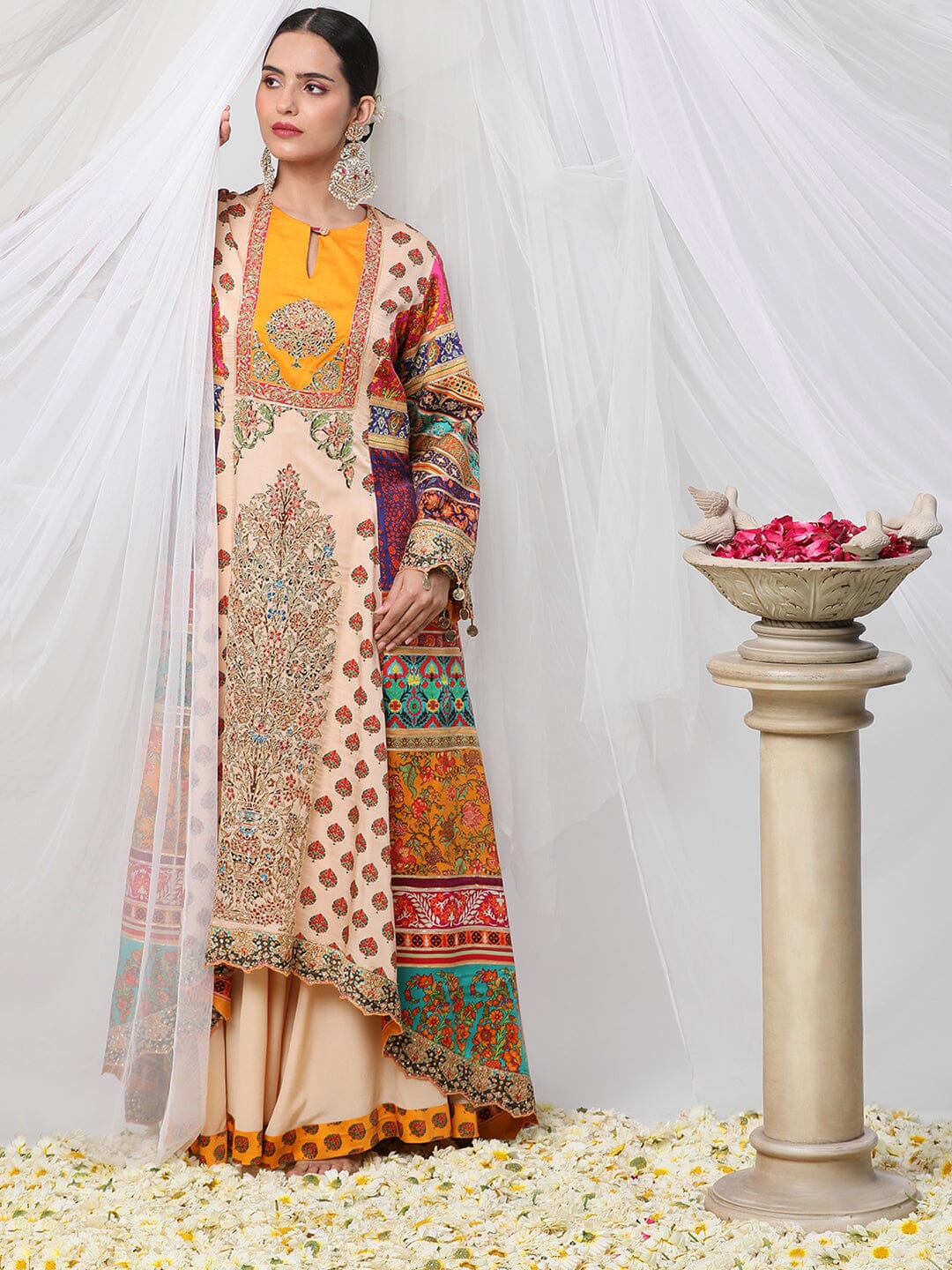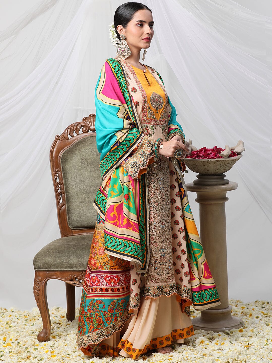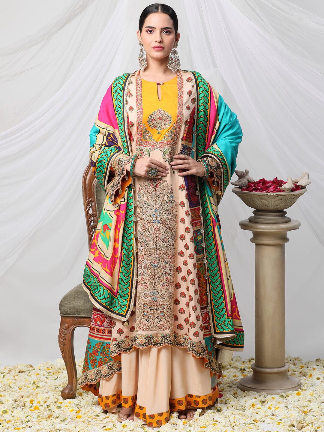 Gayatri Ameeran suit set - a multicoloured dori work suit with palazzo and contrasting dupatta. Crafted with exceptional attention to detail and quality, this opulent suit is sure to make you shine on special occasions. Show off your style and make a statement with this stunning piece.