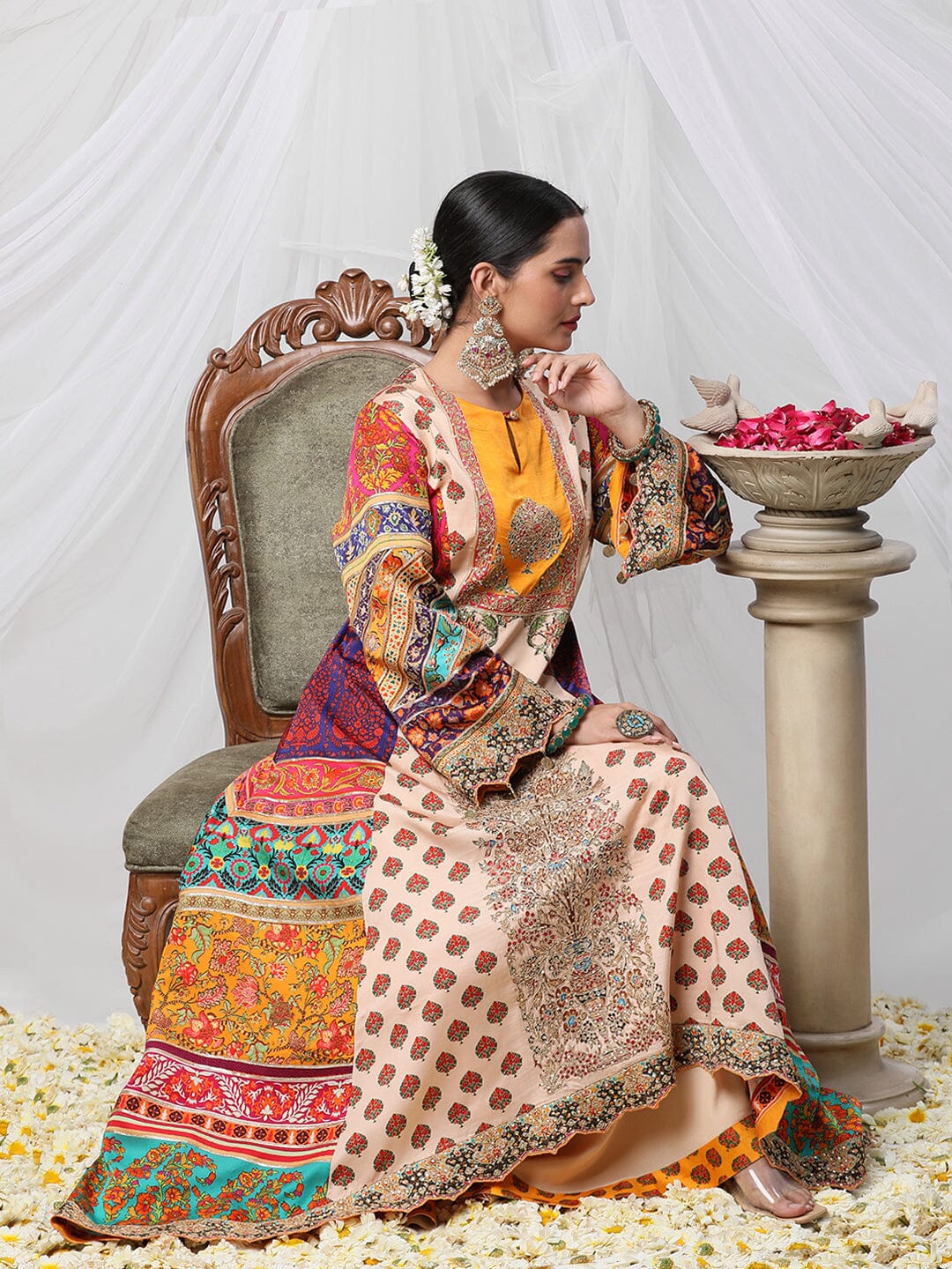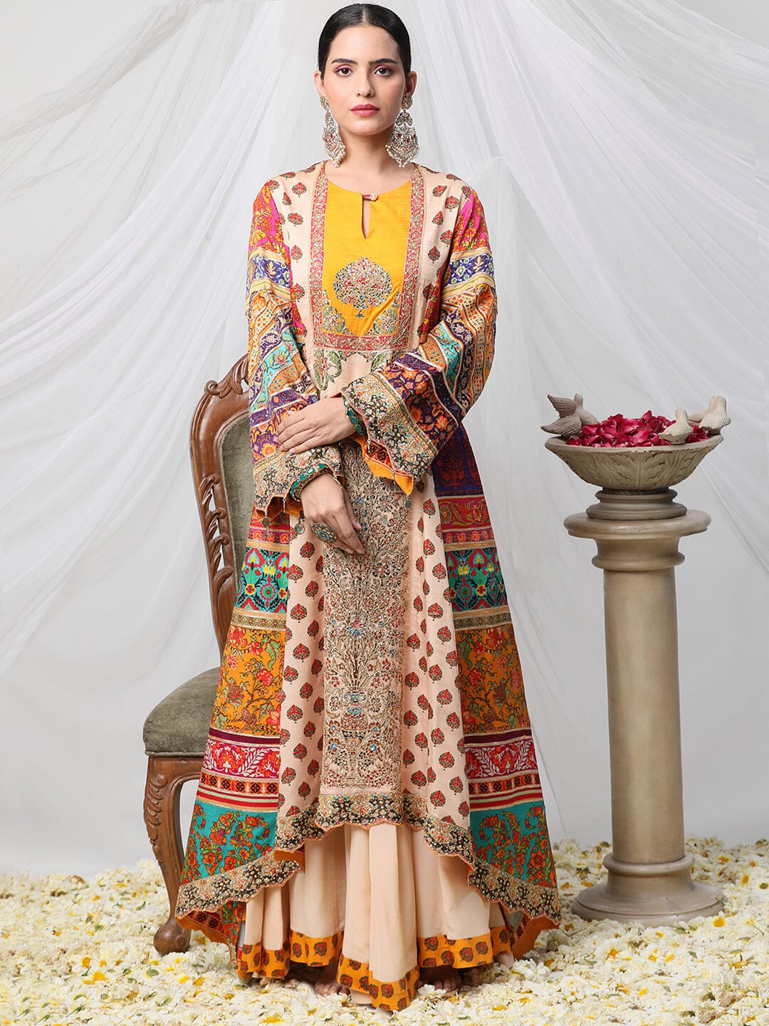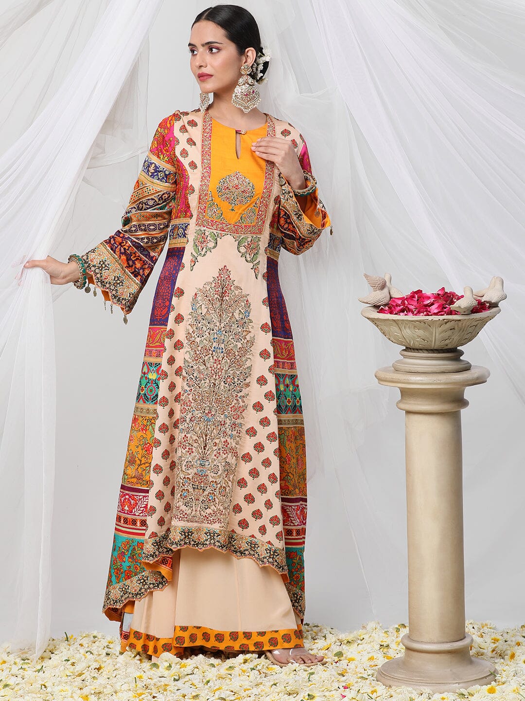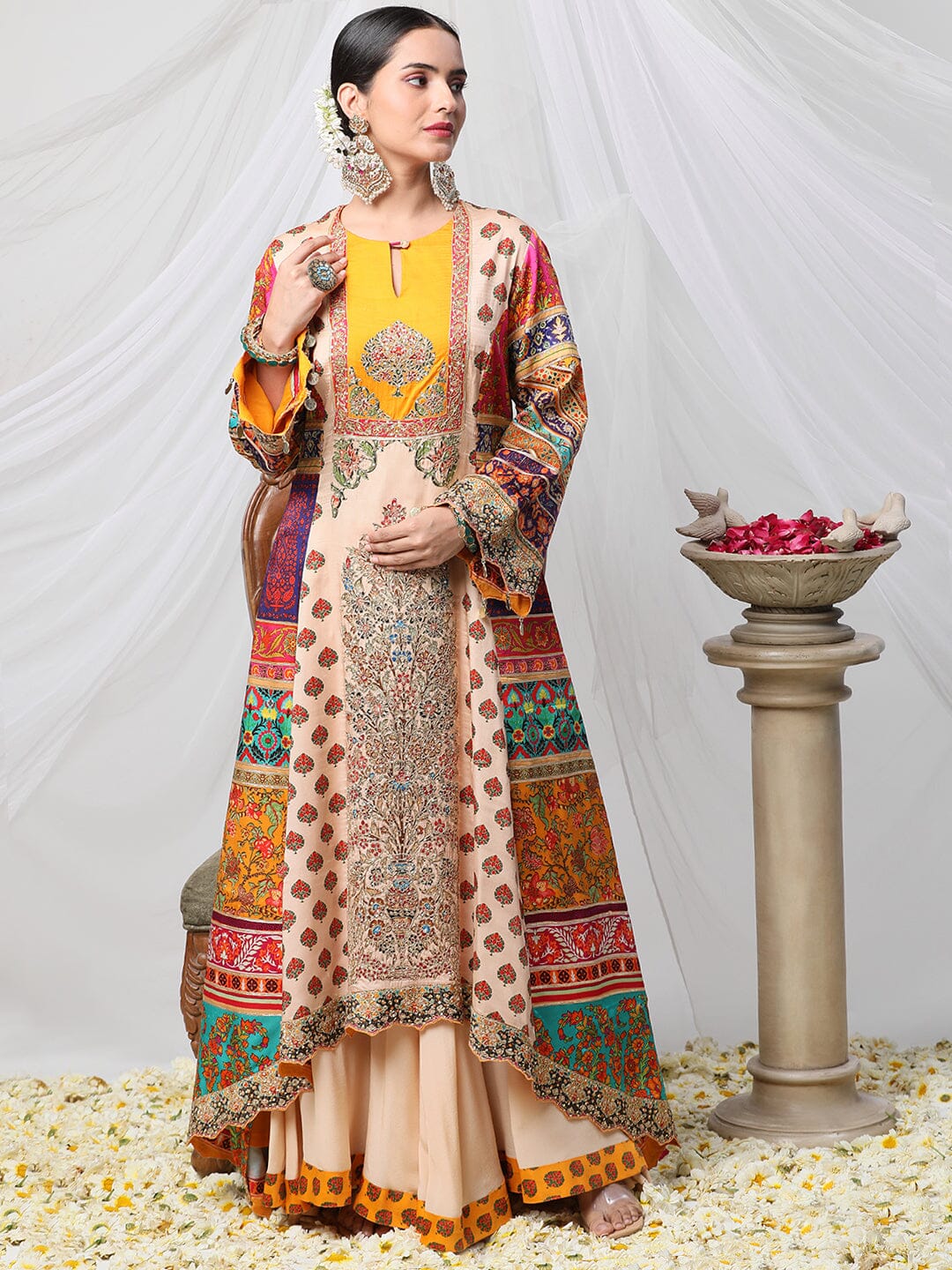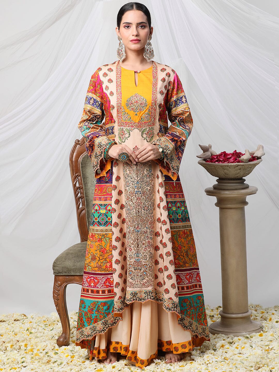 Gayatri Ameeran suit set - a multicoloured dori work suit with palazzo and contrasting dupatta. Crafted with exceptional attention to detail and quality, this opulent suit is sure to make you shine on special occasions. Show off your style and make a statement with this stunning piece.