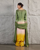 Green ocher ombre organza long kurta featuring hand embroidery on V neck and sleeves, paired with ocher straight plazzo and organza duppatta.