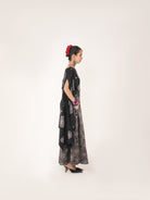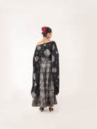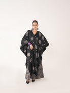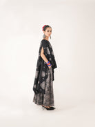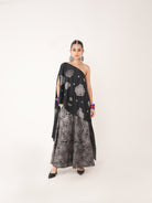Kaizen Black Silk Lehenga With Drape Top features a free size silk top that can be styled in multiple ways paired with Silk floral jaal weave lehenga skirt. The skirt has pockets on each side with a side zip closure.