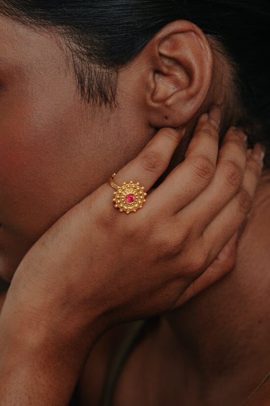 Intricate round stud ring with Ruby gemstone. This ring is adjustable to fit all sizes