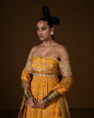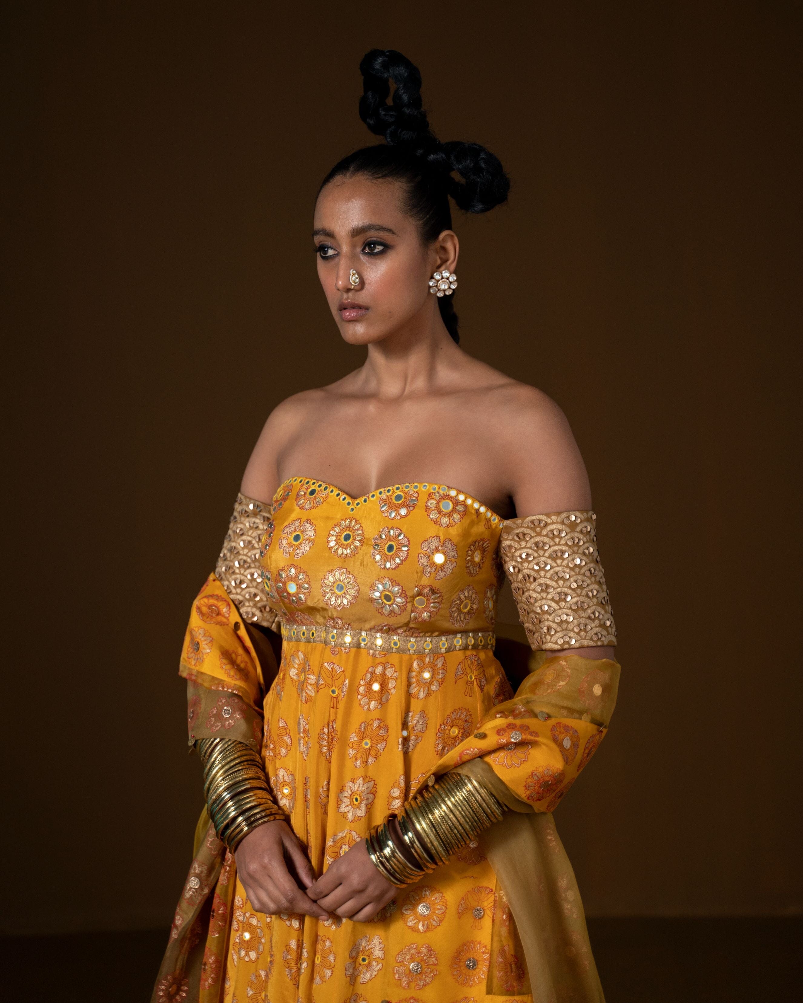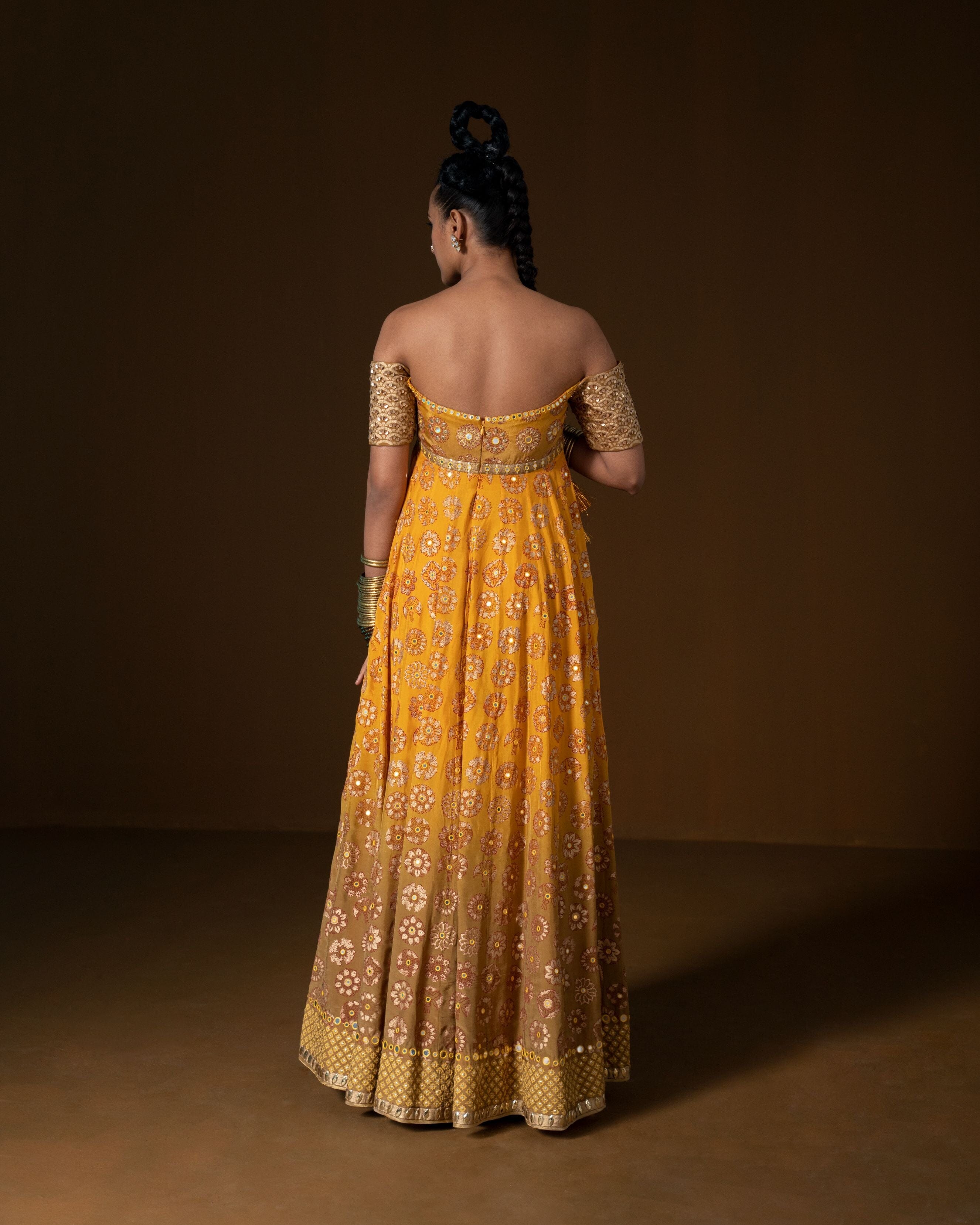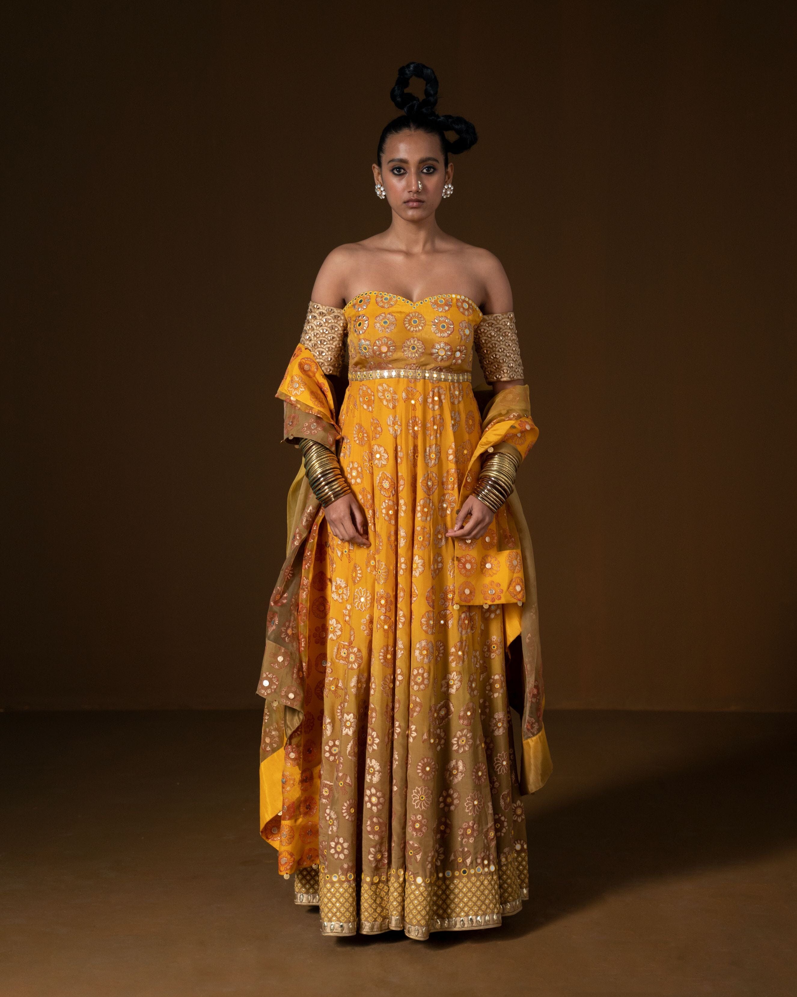 KASUNDI ANARKALI : this anarkali is made in a plush summer silk with 12 kind of flowers printed all over the base, placed in a geometric manner, and is bound with an intricate geometric border. Its hand embroidered in small mirror and sequin embroidery . The Ombre Dupatta is printed and embroidered on borders and has metal coin hanging detail.