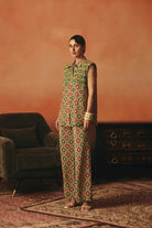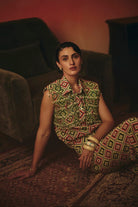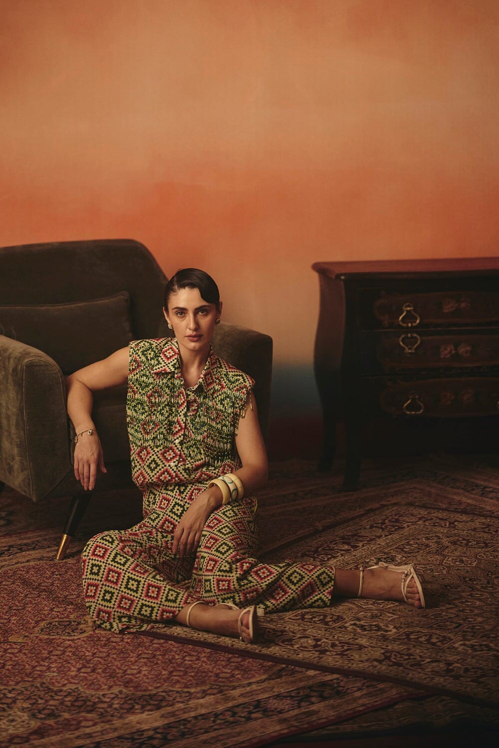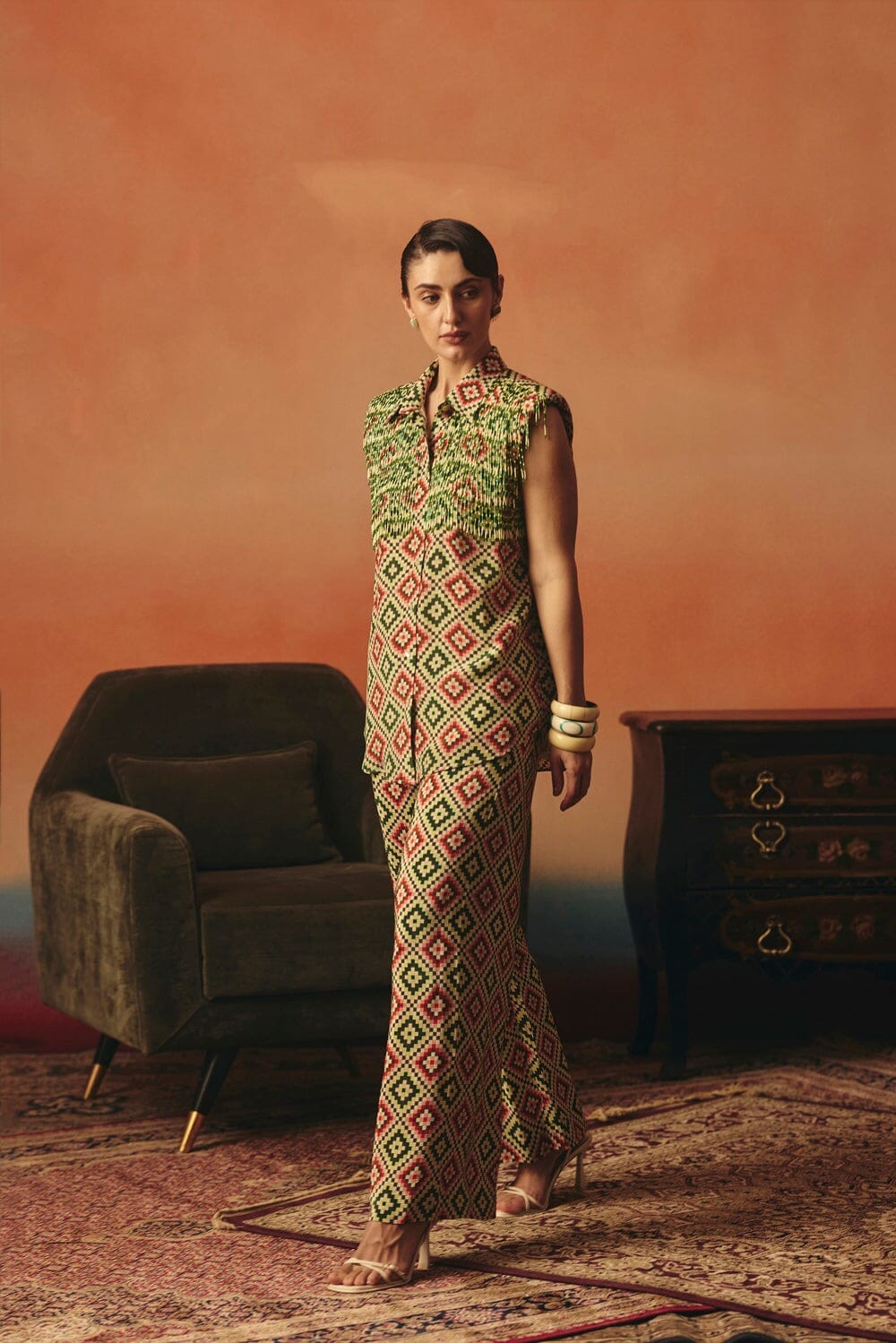 The Mayuri Co-ord Set is made in pure crepe and comes in digitally printed traditional Ikat-inspired pattern. Its has numeroused tassels hand emboidered with tiny crystals and beads on the top area. It also has a power shoulder detail .