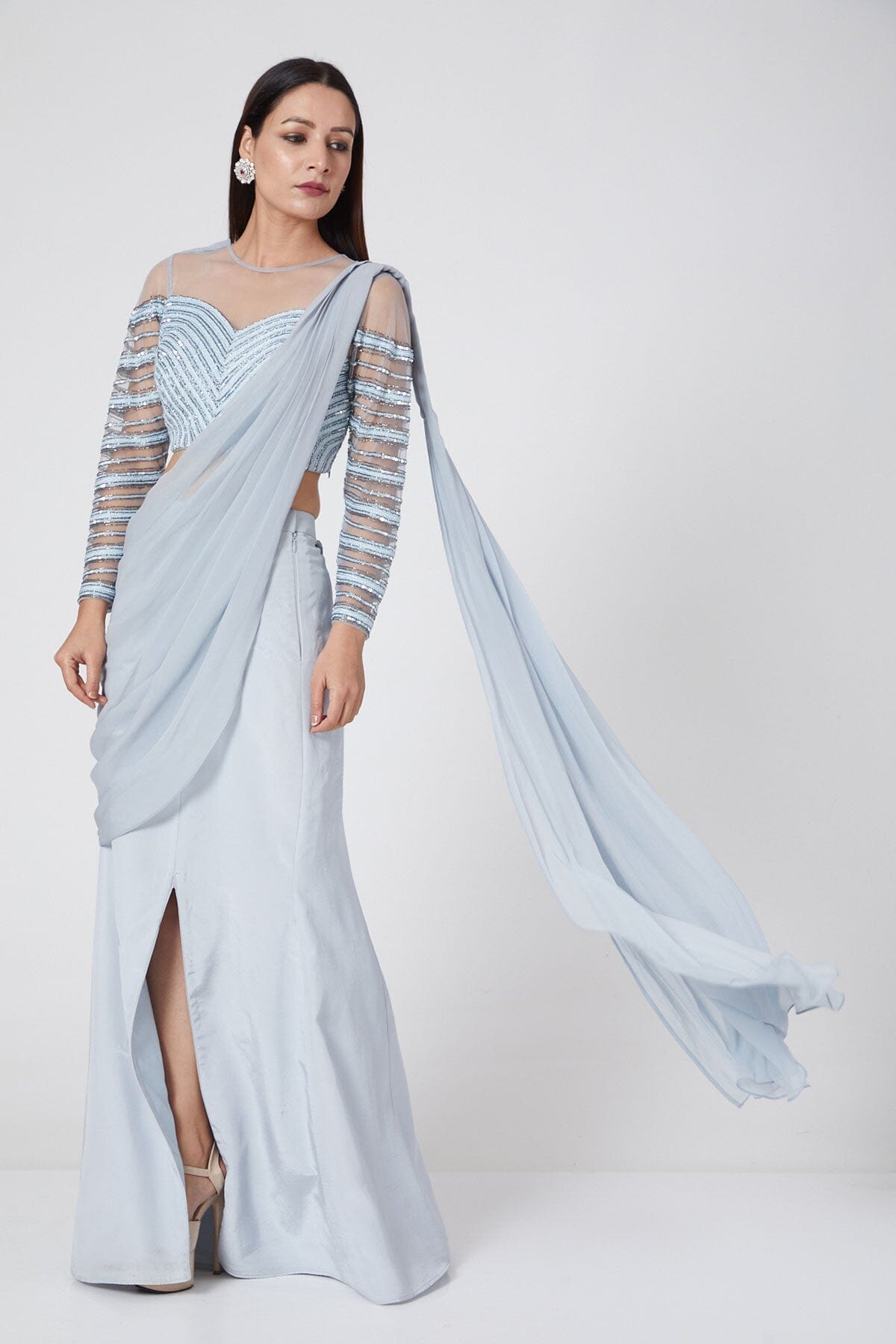 Medium Slit Ice-Blue Skirt Along With Blouse Forms The Attire That Is Vibrant And Full Of Flamboyance. Fine Detailing Over The Blouse Makes It Look, Majestic. Fabrics Used Include Silk And Crepe