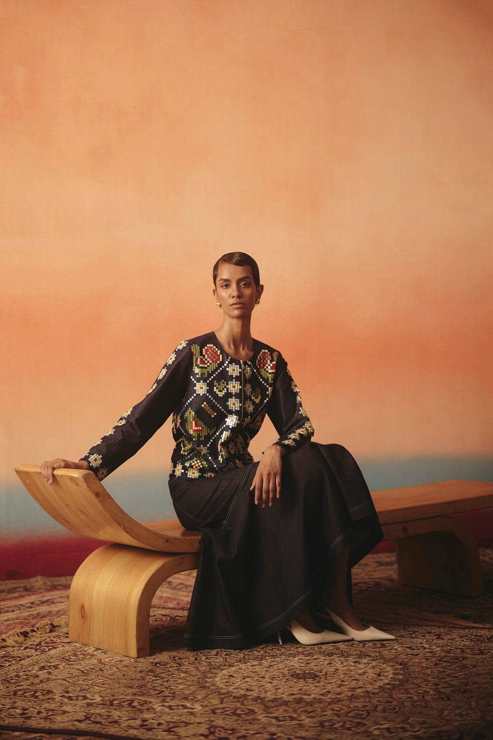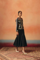The Mithu Jacket is crafted from soft stretch denim in the classic Ikat-inspired pattern and comes finished with sequins hand work and metal zips