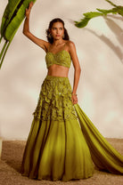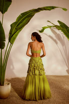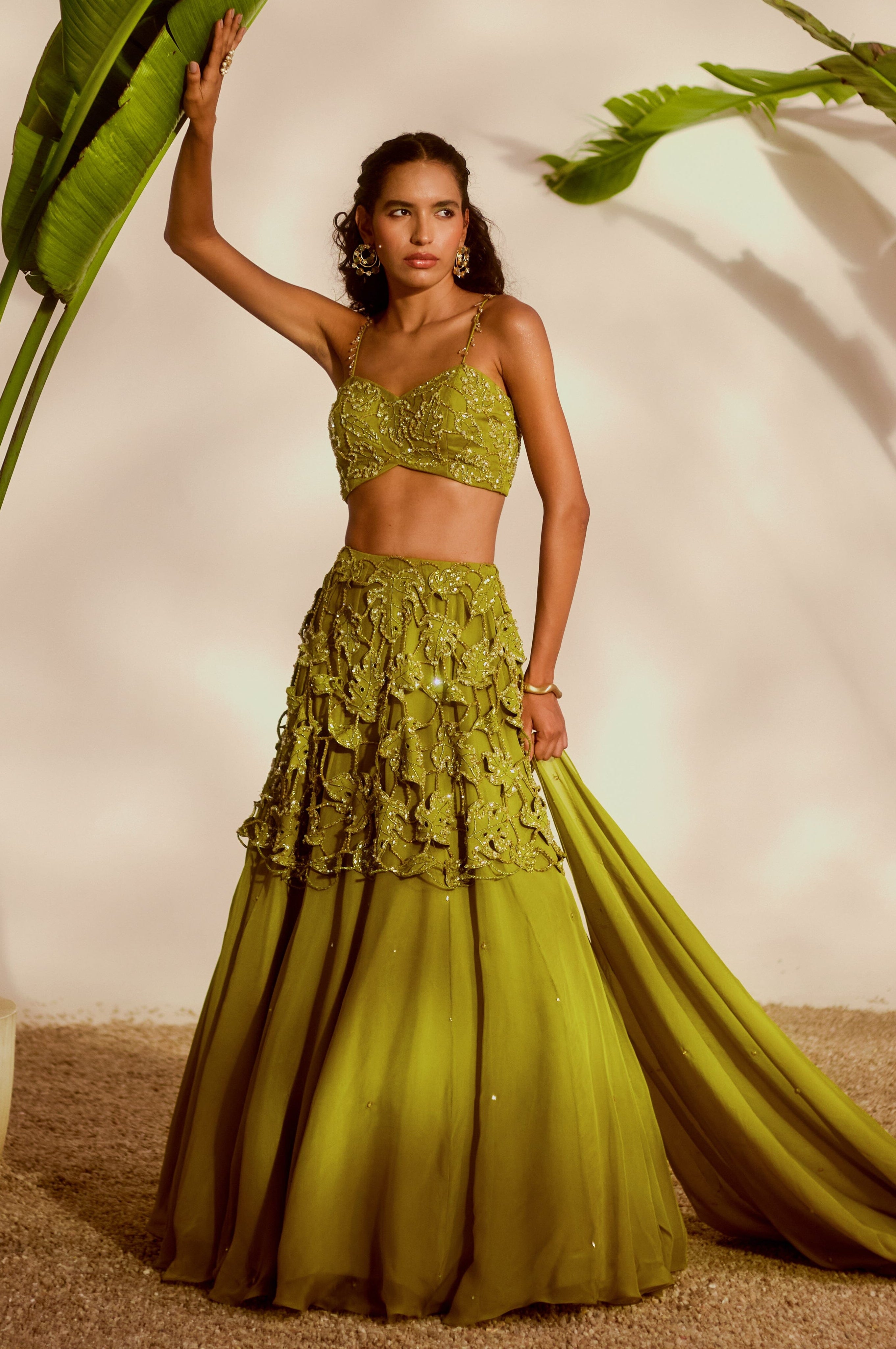 MONSTERA LEHENGA SET - V HEM EMBROIDERED BUSTIER WITH MONSTERA LEAF CUTWORK LEHENGA AND DUPATTA