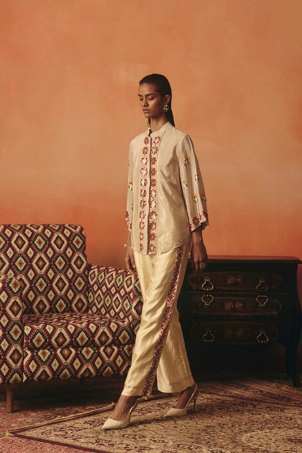 The Neerja Co-ord Set is soft beige Co-ord Set crafted from pure crepe featuring the traditional Ikat-inspired patterns and our signature sequins detailing.