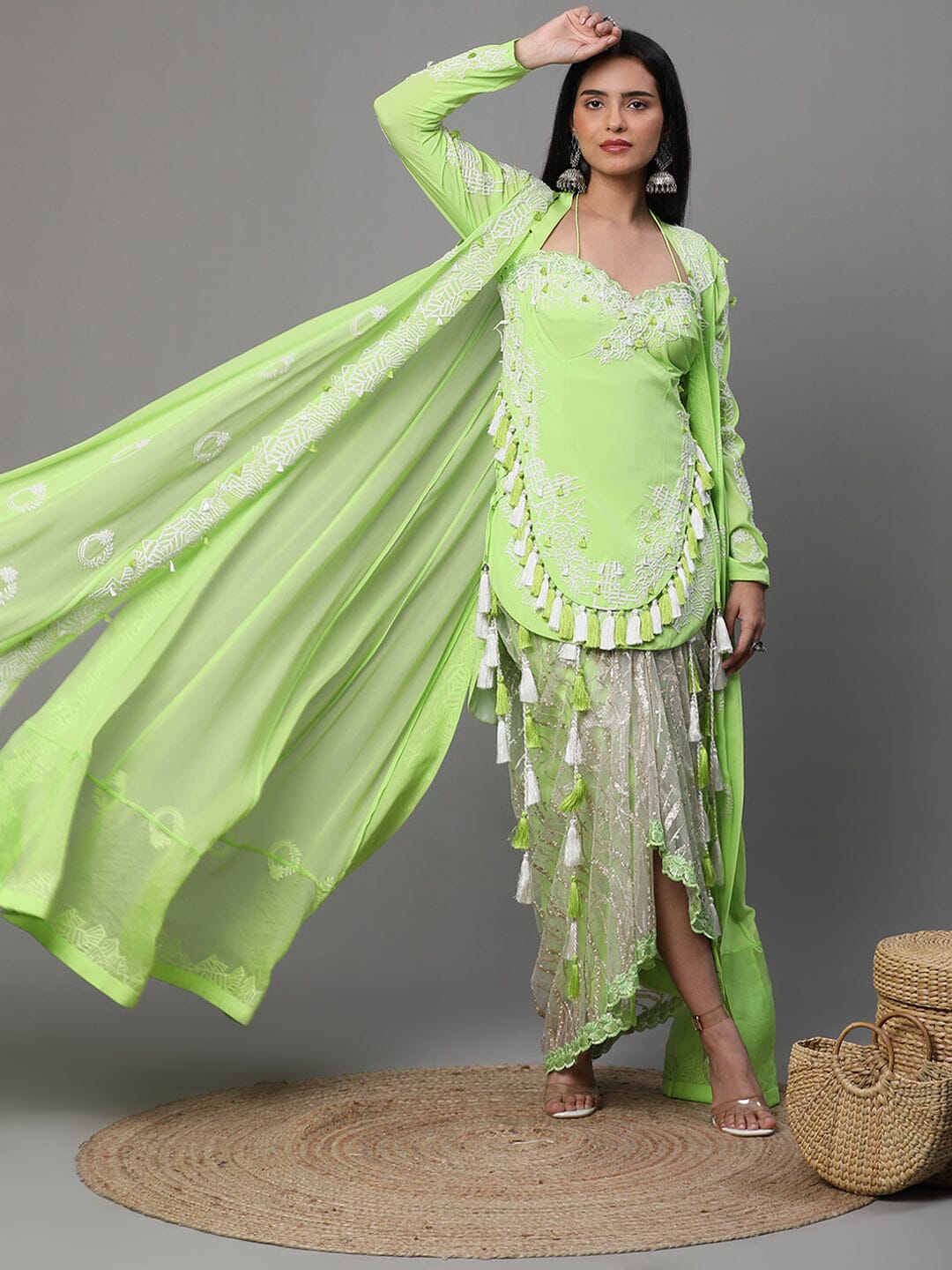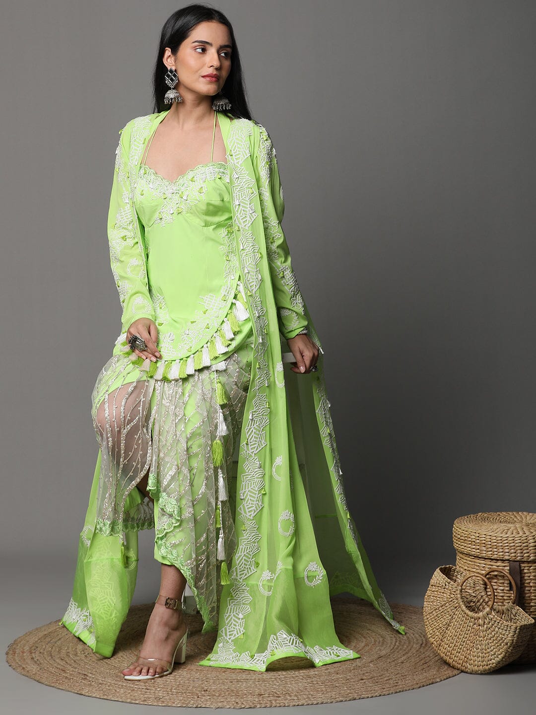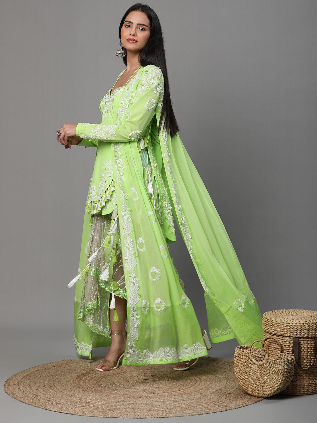 Neon Green Colour Suit, High Low Pattern White Cutwork, Dhoti and Jacket