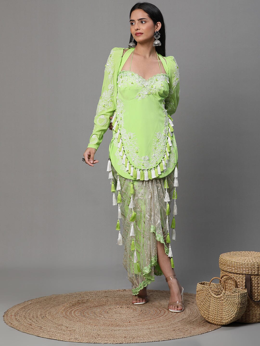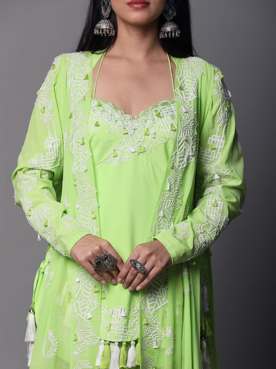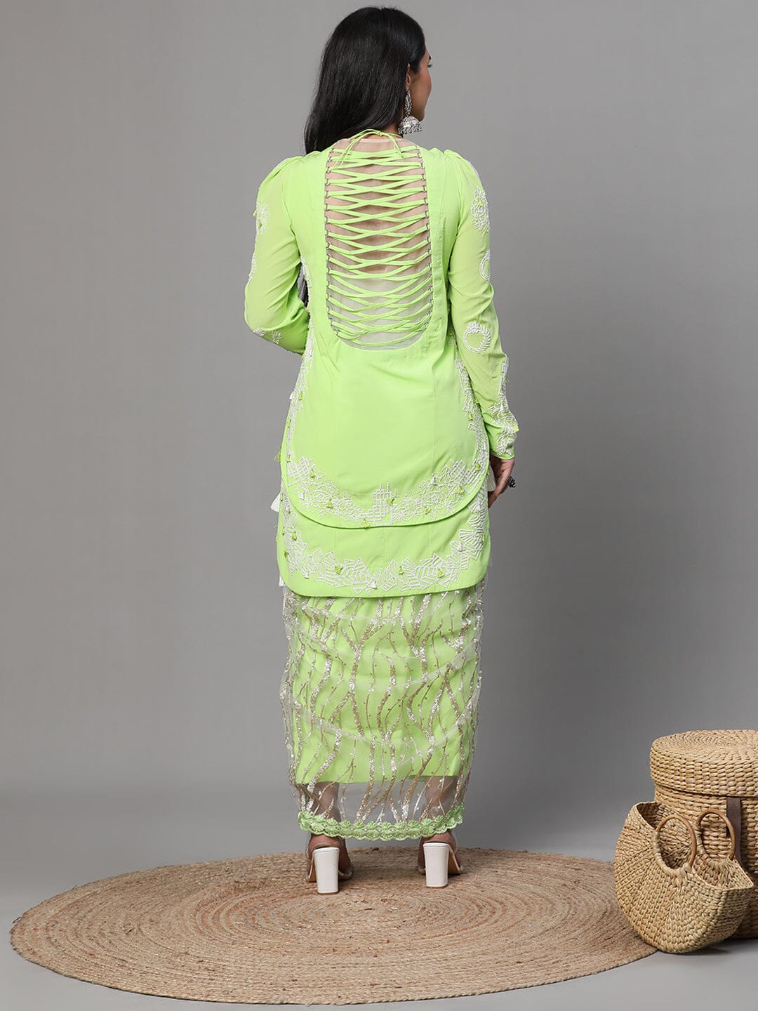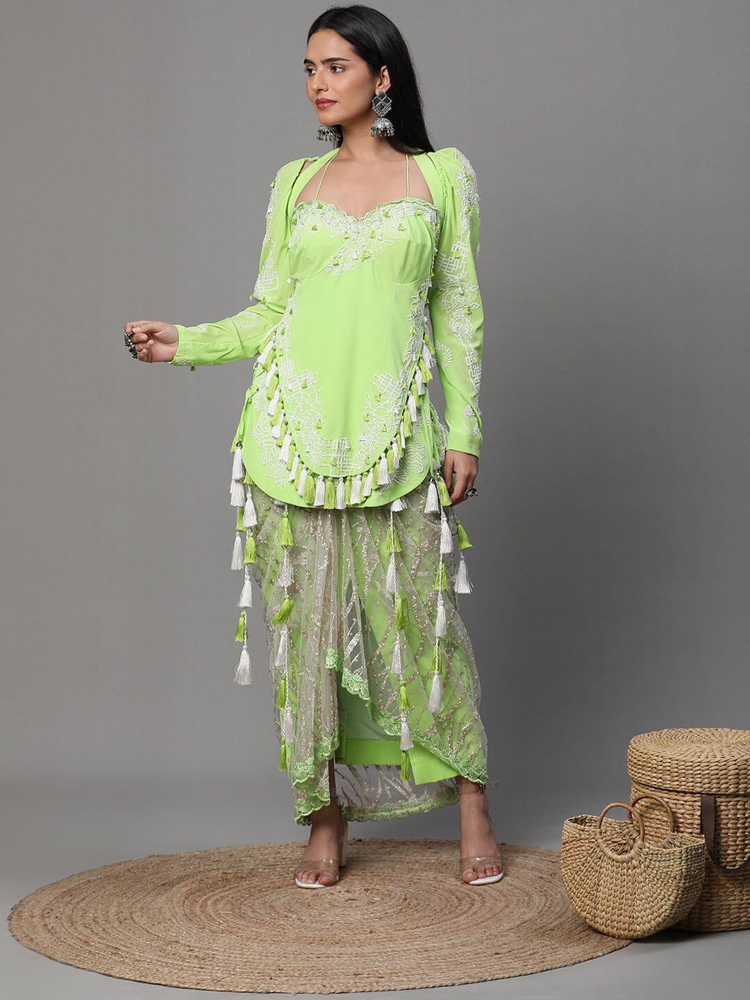 Neon Green Colour Suit, High Low Pattern White Cutwork, Dhoti and Jacket