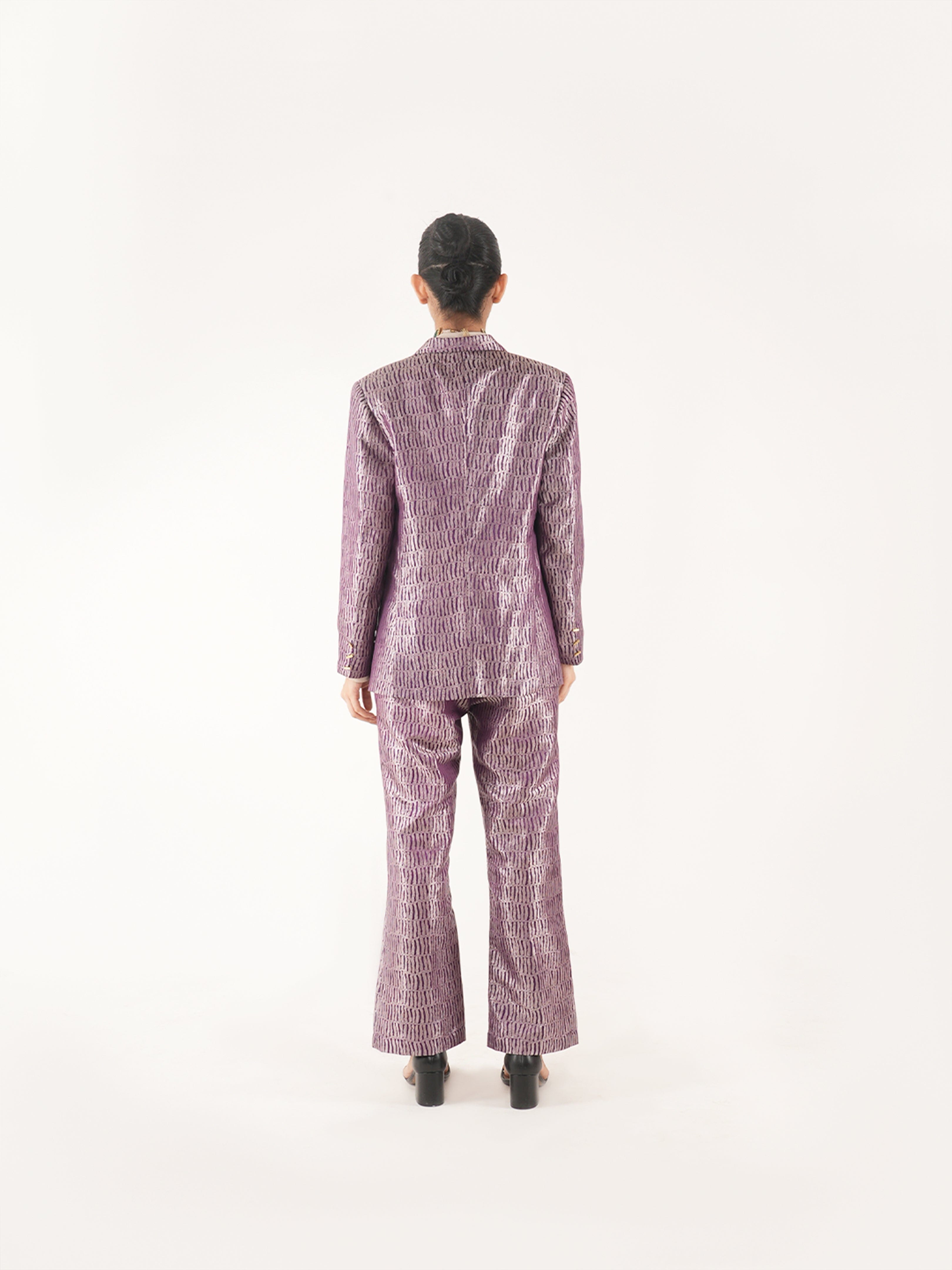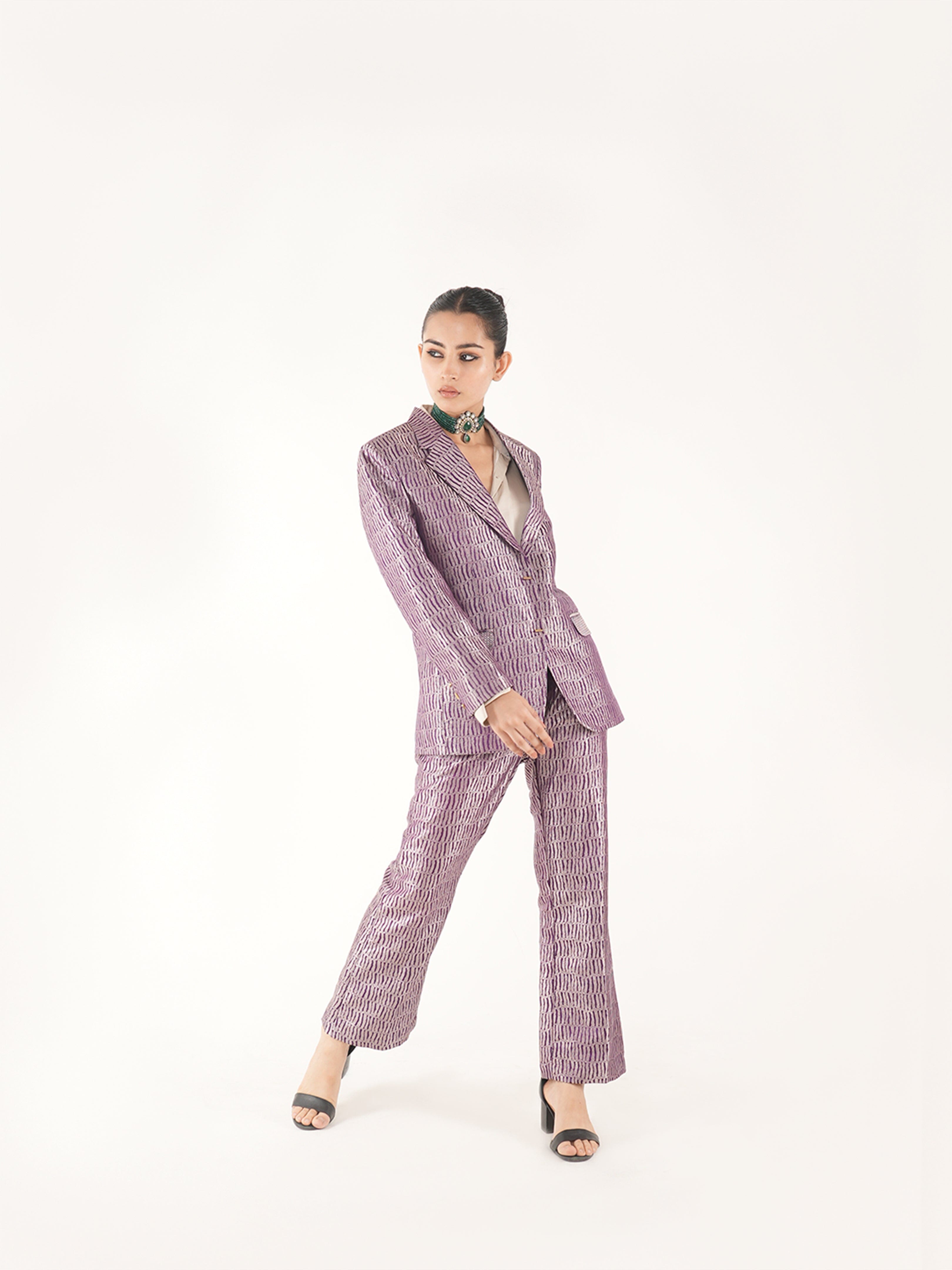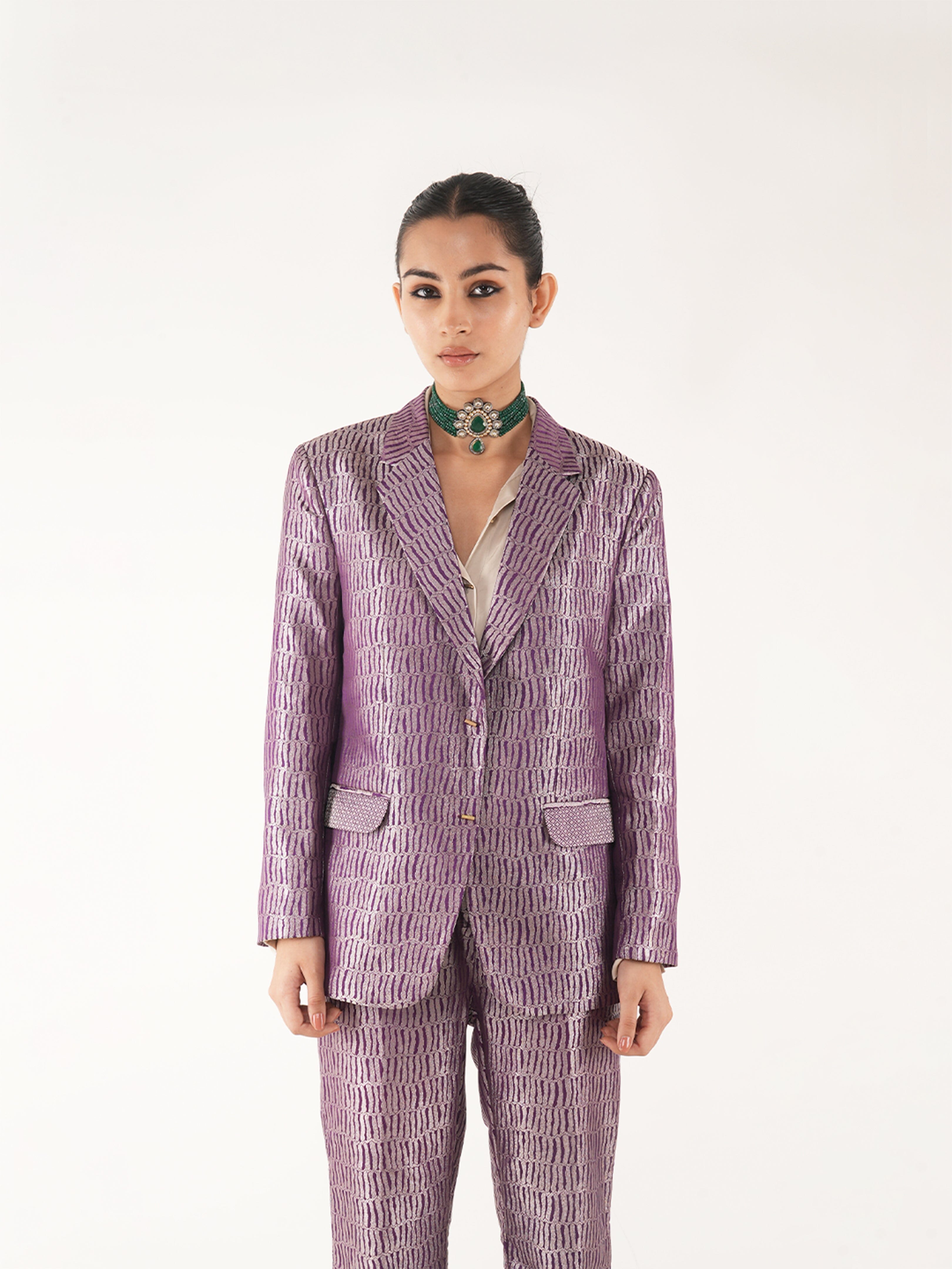Nuah Silk Purple Jaal Pant Suit made with Pure mashru silk woven in intricate jaal motif. The blazer is made in single breasted style paired with high waist straight fit pant. The pant of this set has pockets on each side.
