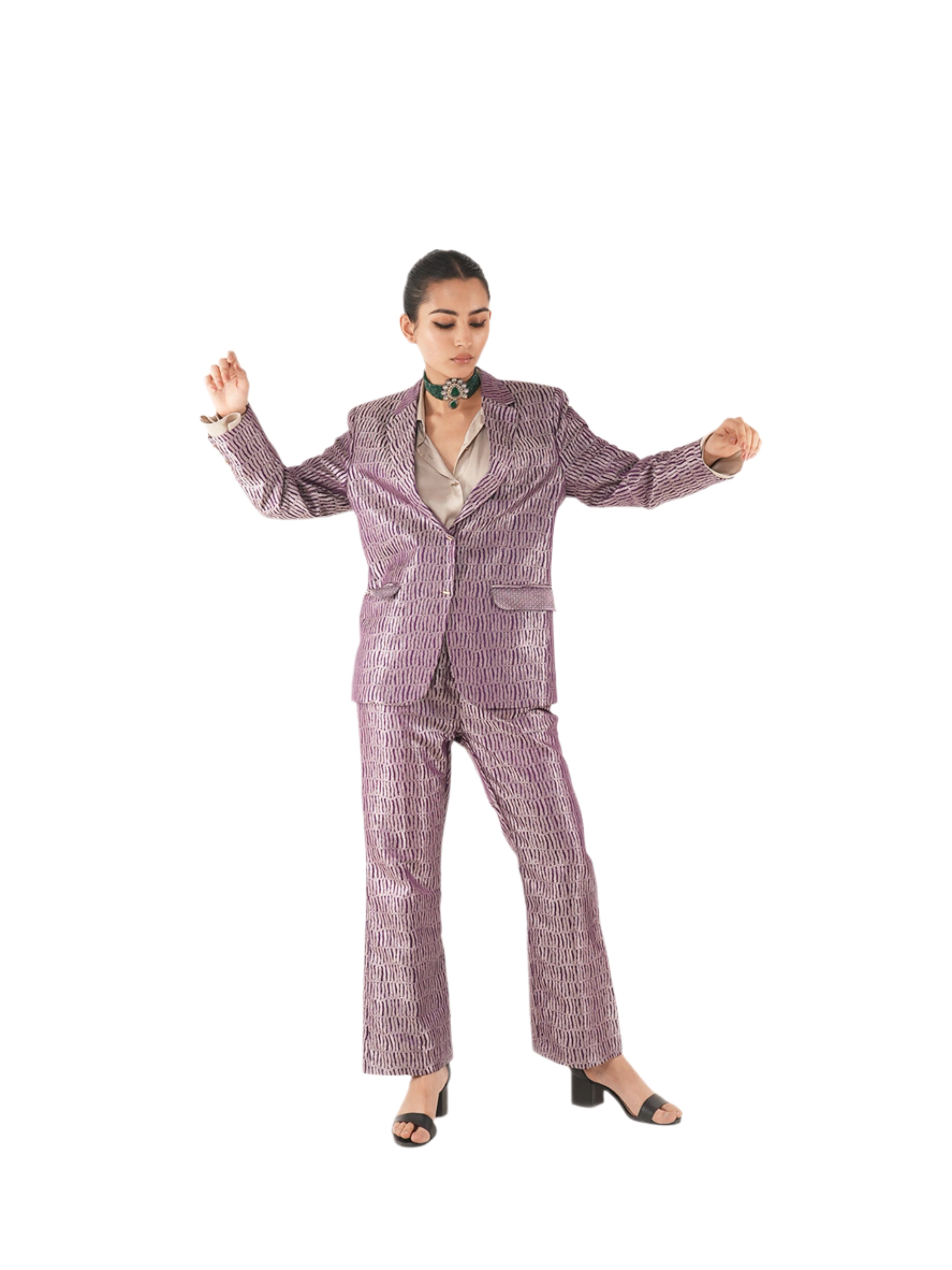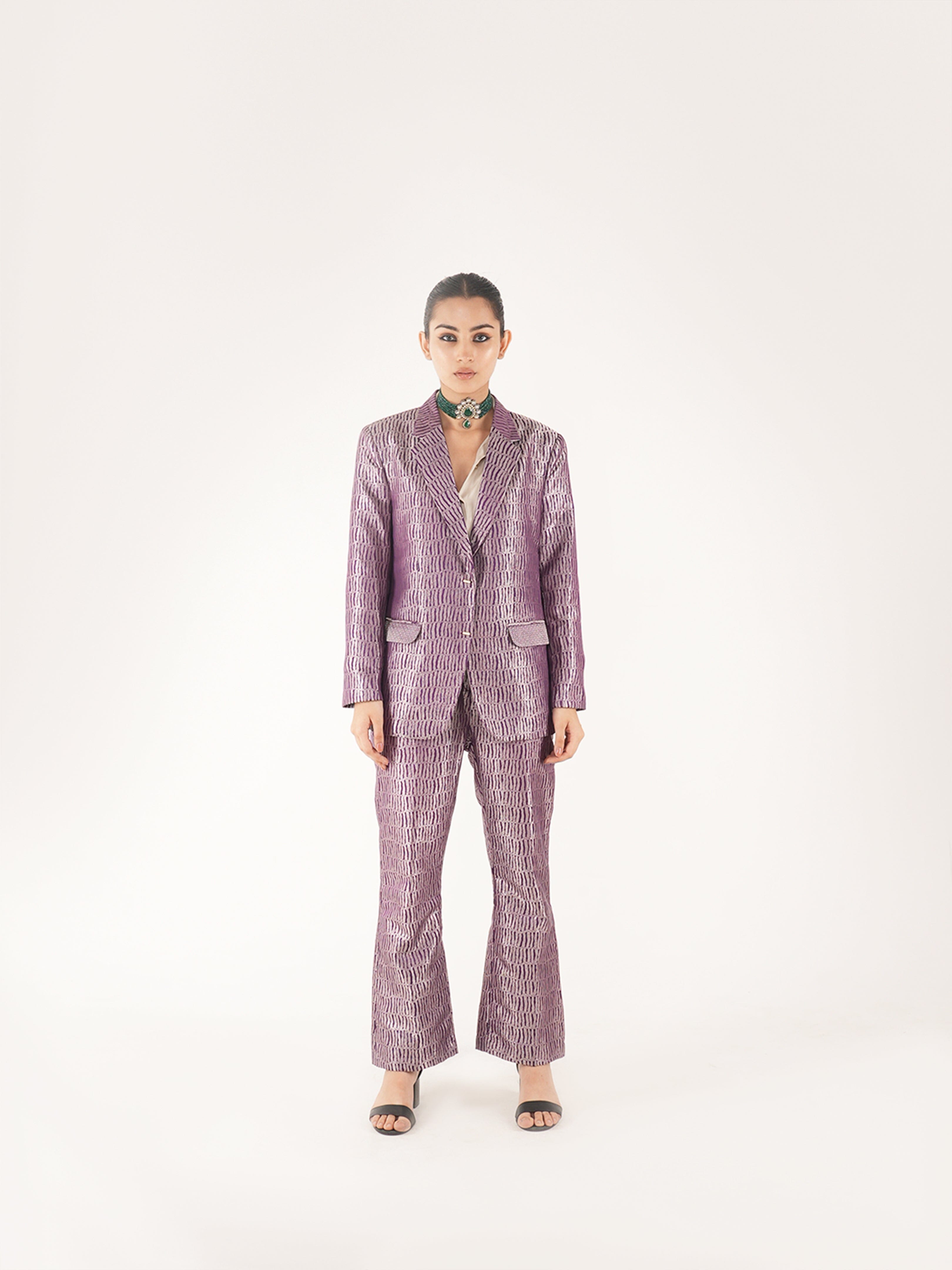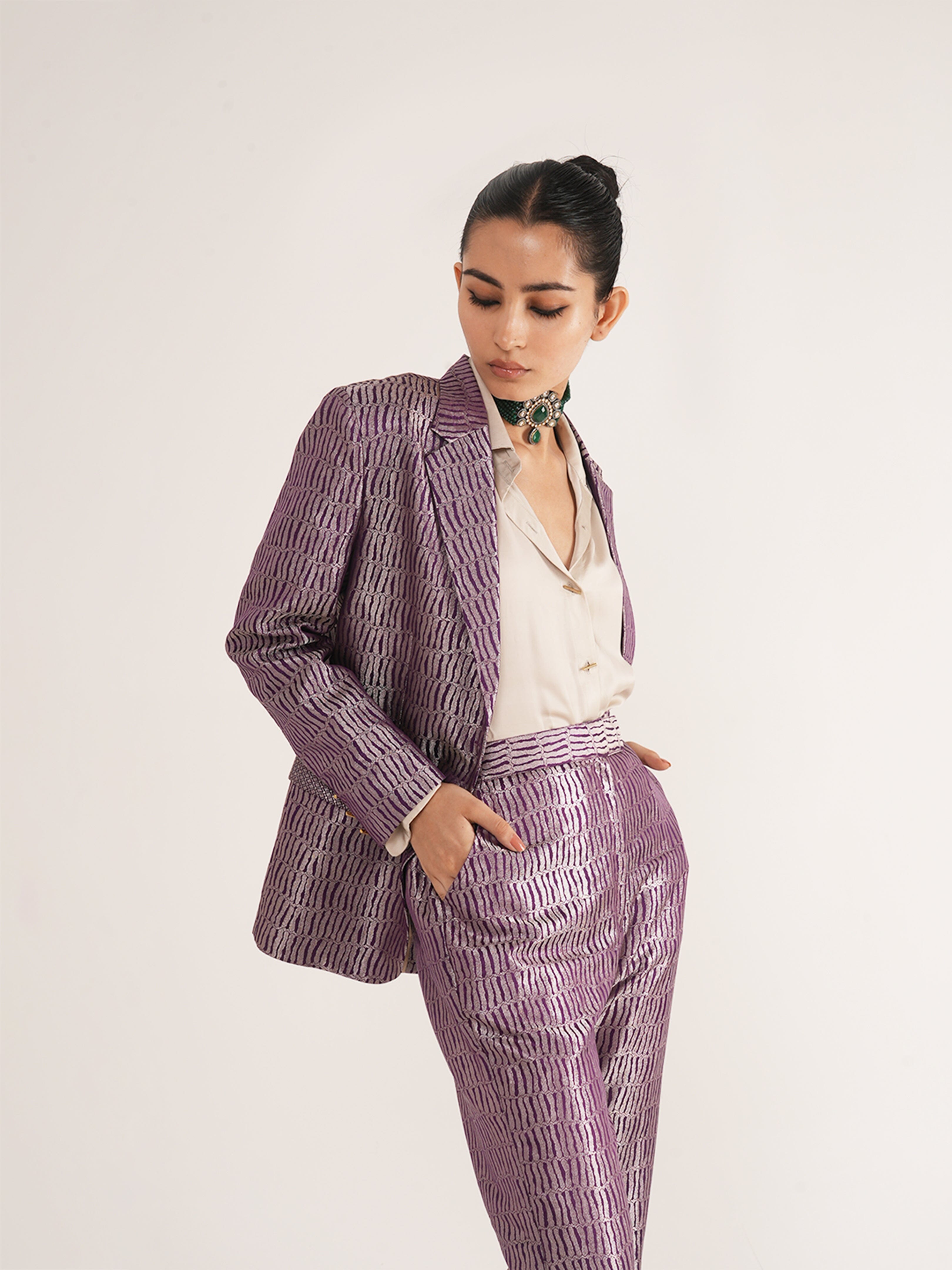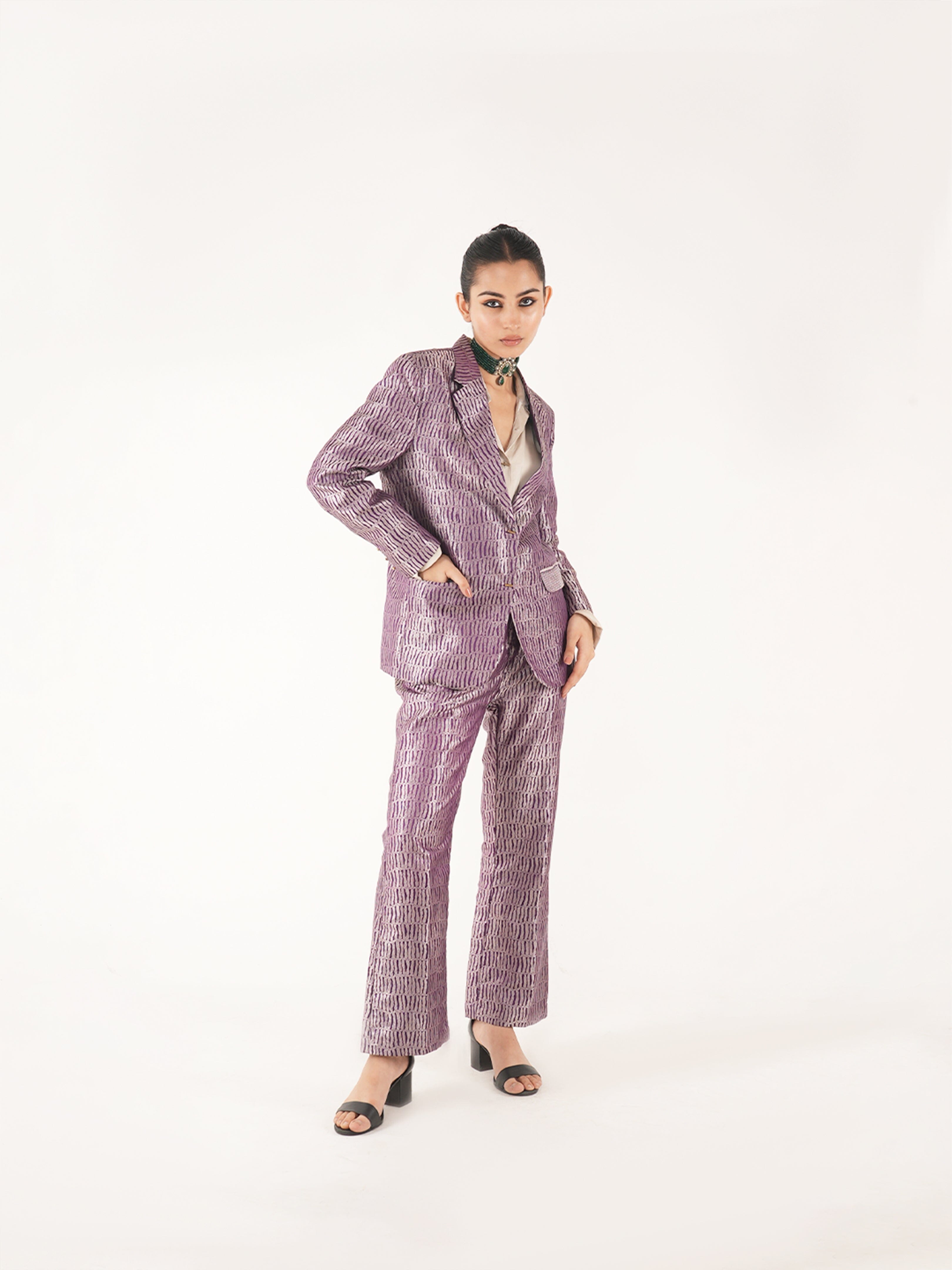 Nuah Silk Purple Jaal Pant Suit made with Pure mashru silk woven in intricate jaal motif. The blazer is made in single breasted style paired with high waist straight fit pant. The pant of this set has pockets on each side.