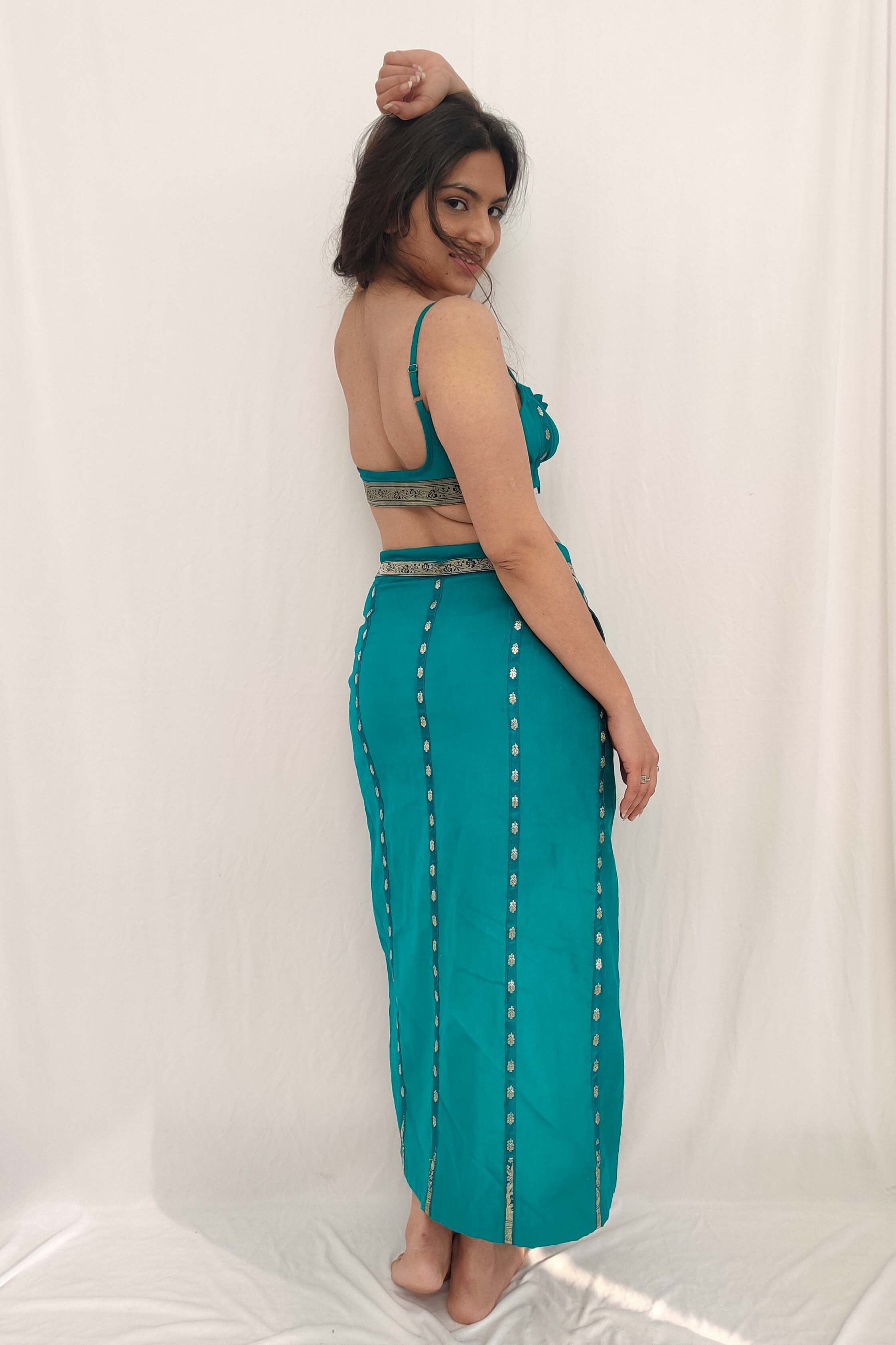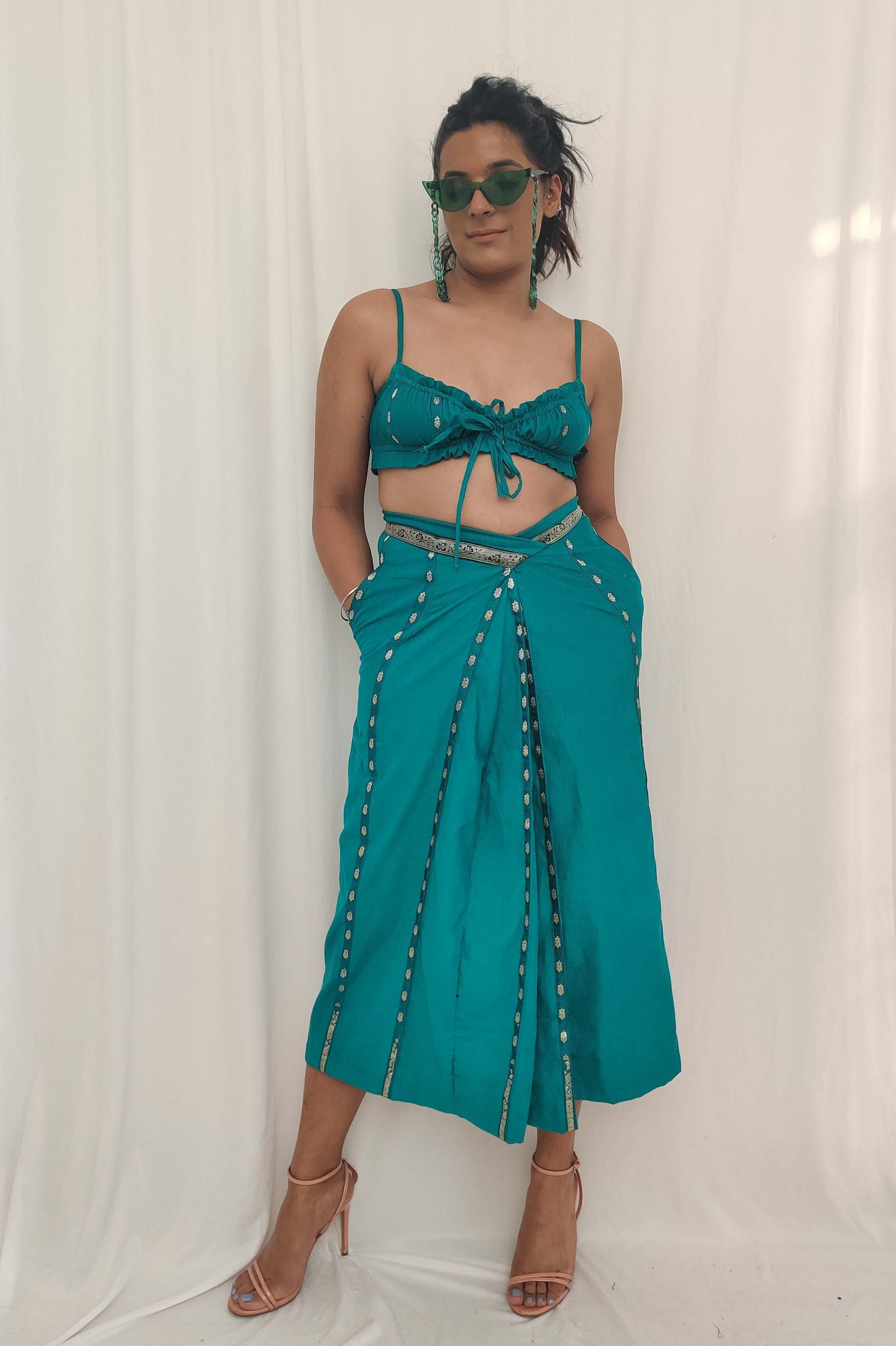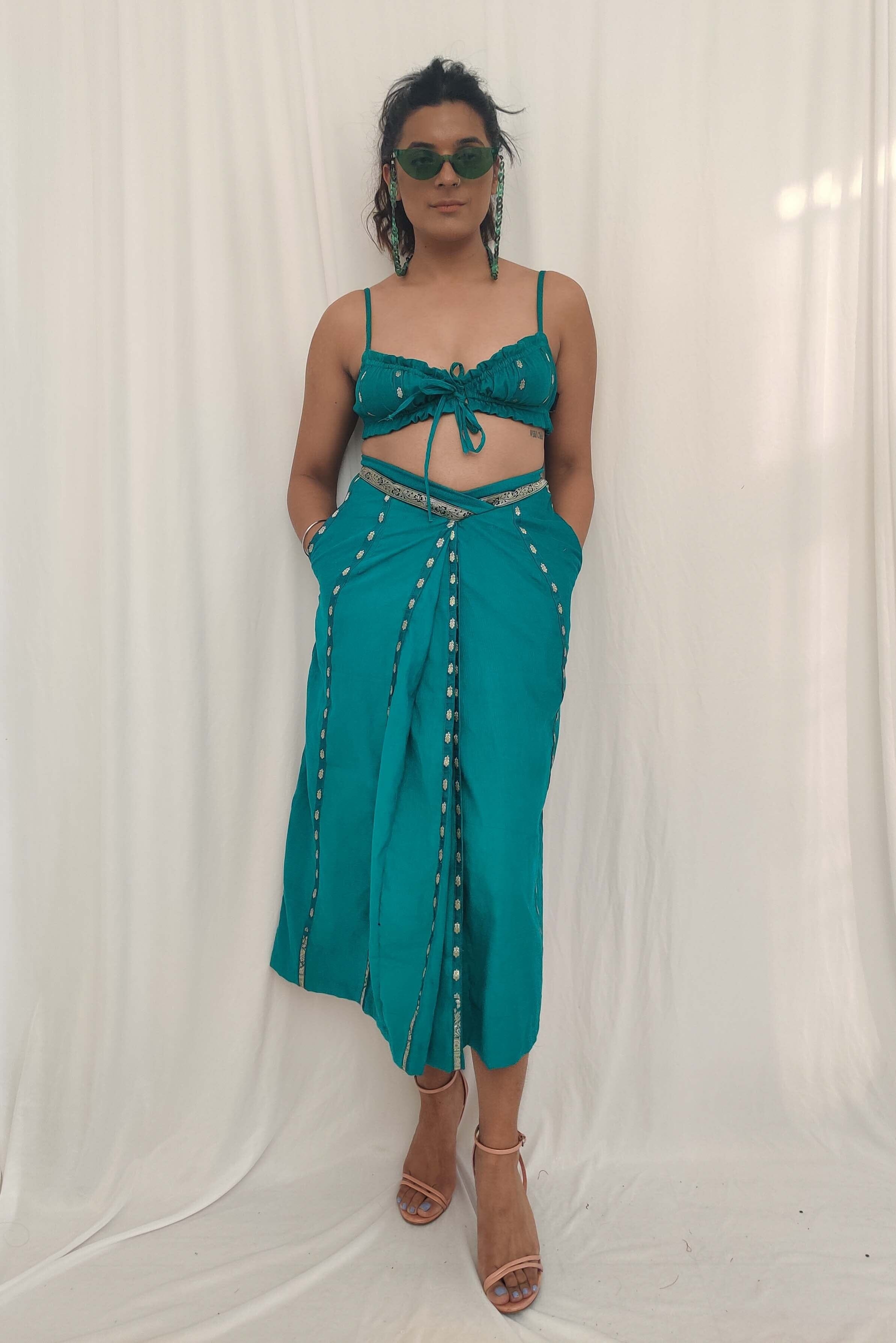 Inspired by the bold, minty taste of this leafy, Indian mouth freshener, this aqua green co-ord is sanskaari with a pinch of sexy. The bralette is all skin and art, with adjustable straps and a knot with Ghungroos in the front.