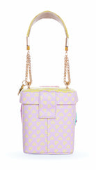 A faux leather camera bag in signature 'Pac Street' print with embroidered patches and custom Papa hardware. Topped with embroidered Papa handle.