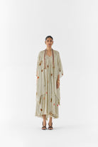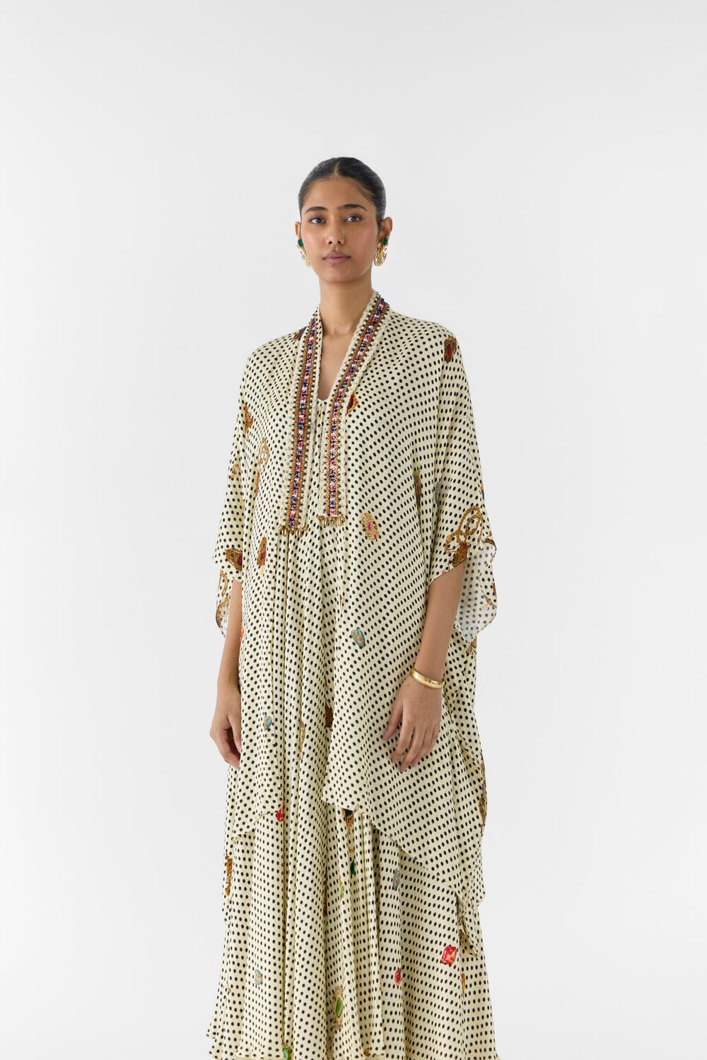 The Pearl Polka Dot Strappy Dress & Cape crafted from our stunning vegan silk fabrication, trans-seasonal, is a statement piece. This set, printed in our jewels polka dot print, is a two piece set. The cape is free size and is hand embroidered with beads and lace. The strappy dress is a-line with adjustable straps. With an asymmetric cut, it looks stylish. Wear it with heels for an elegant look.