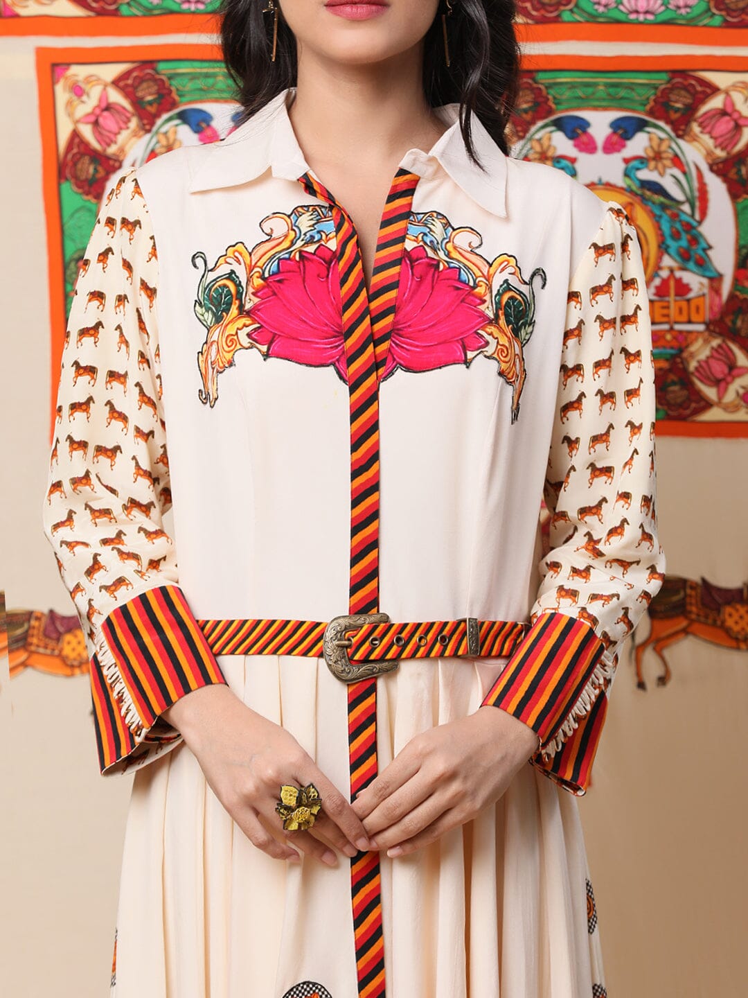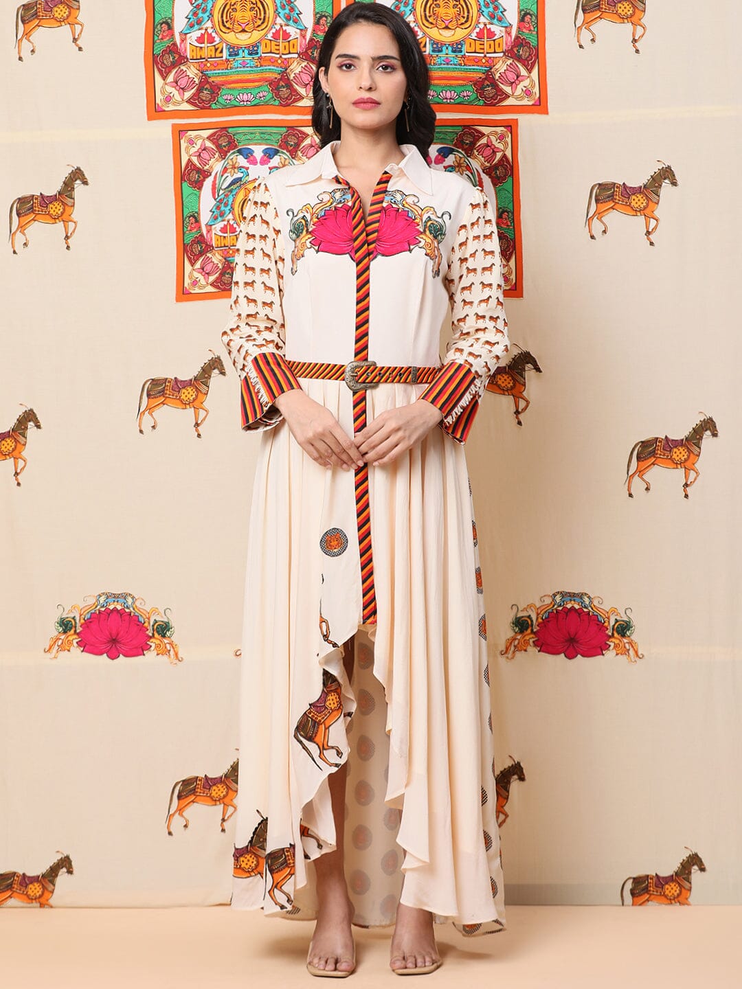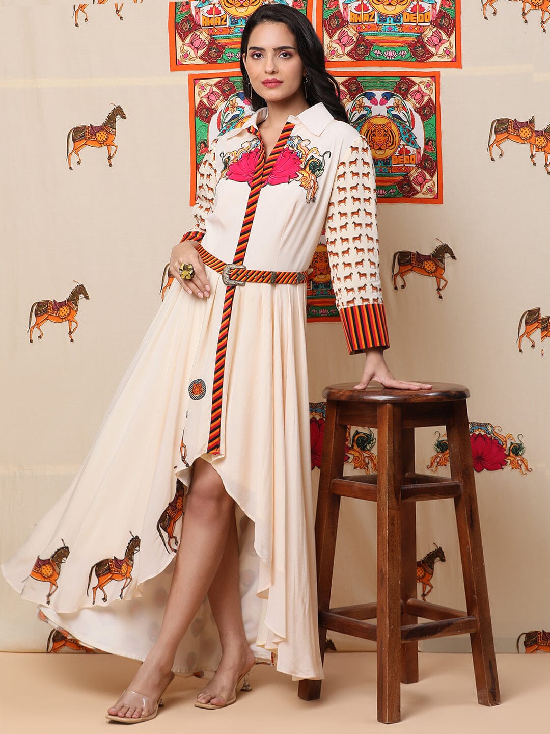 Beige colour printed Dress, lotus and Horse print, High- low pattern