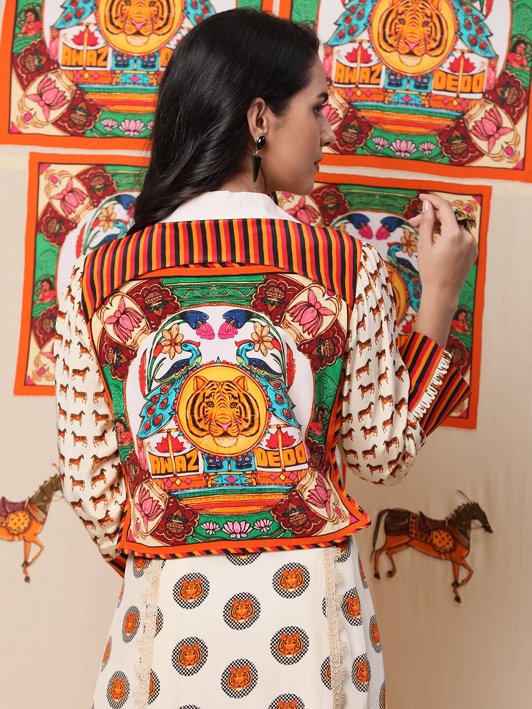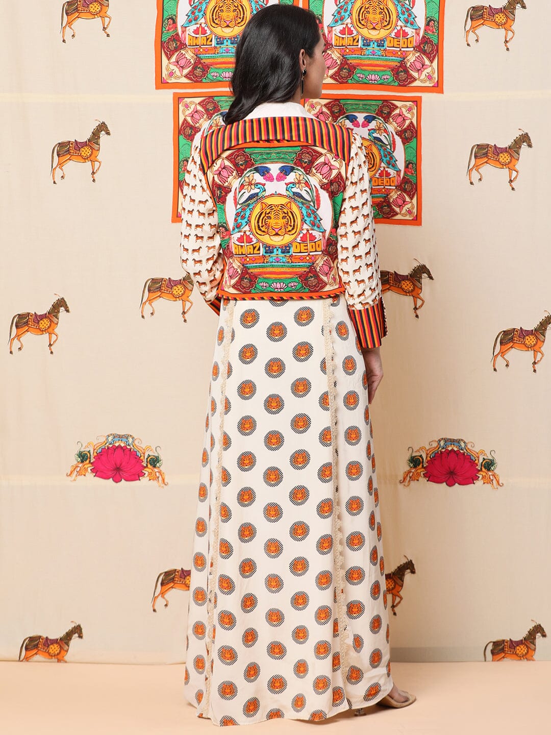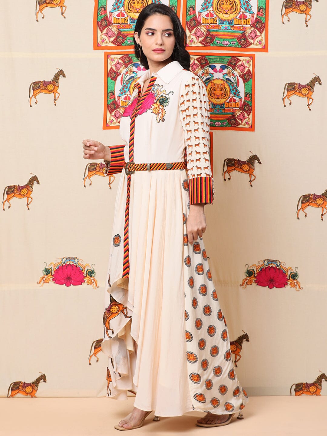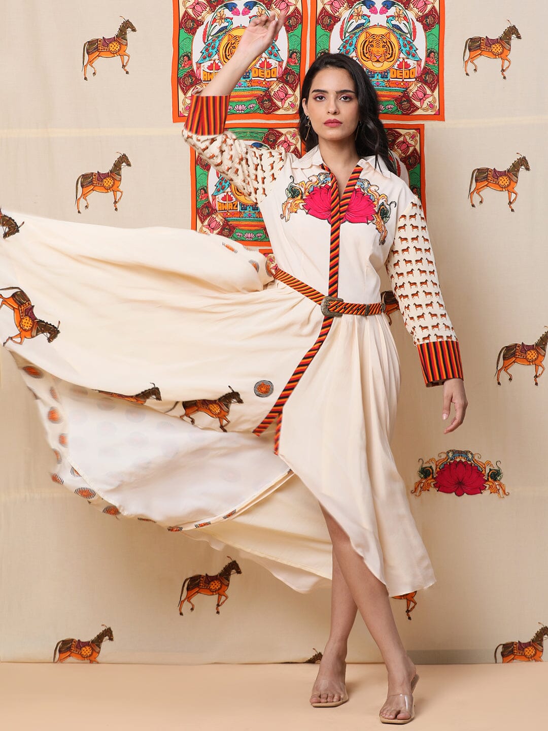 Beige colour printed Dress, lotus and Horse print, High- low pattern