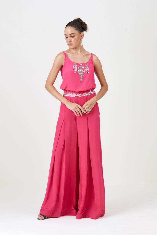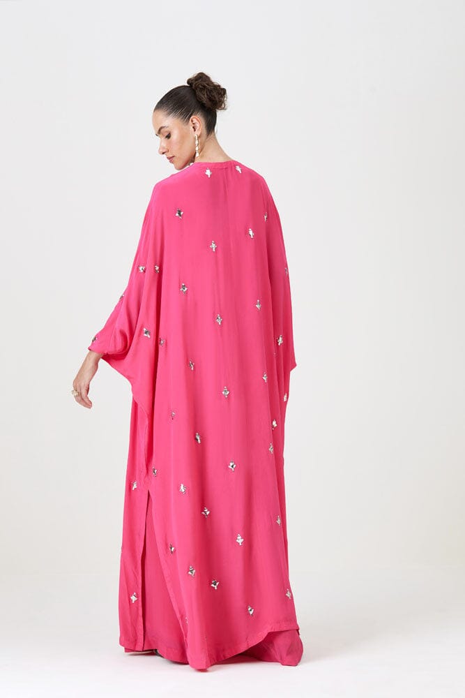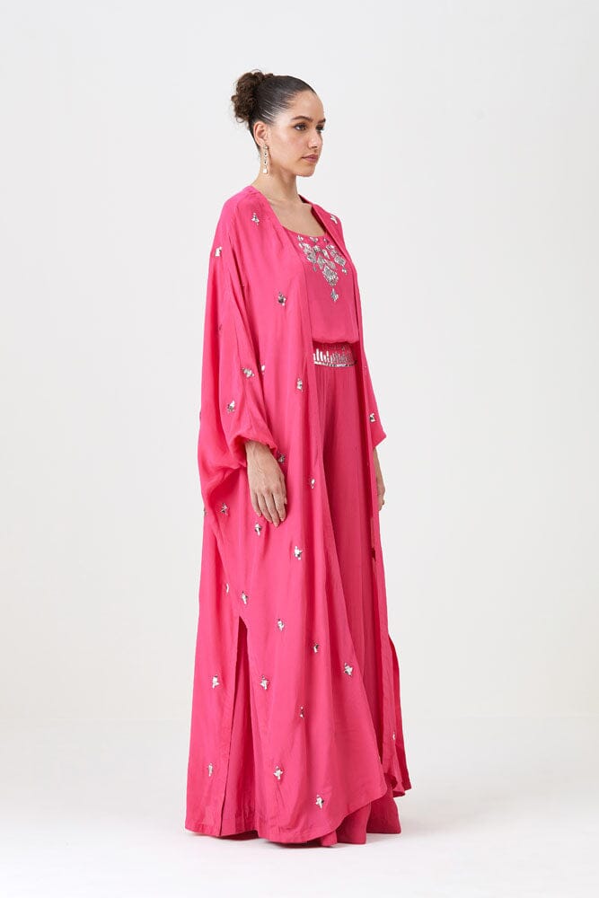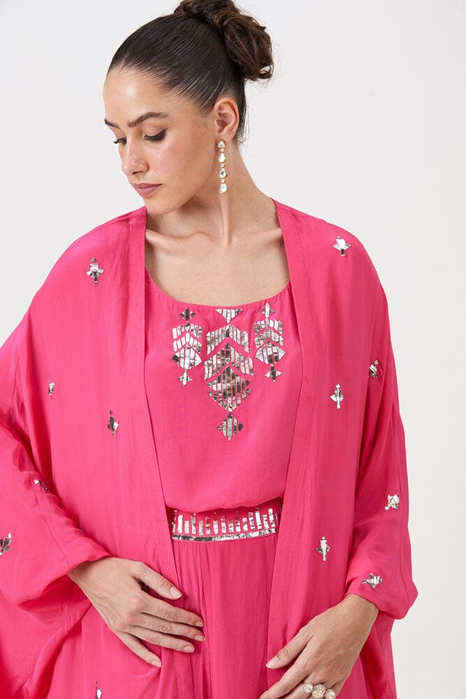 Nail the pre-festive style with the Roohani Set. This comfortable yet gorgeous outfit crafted with natural crepe silk feature beautiful flowy pants, a stunning top and the main character: the cape. Add the statement cape for drama, or wear it separately for versatility. Pro tip: Tuck the top for a flattering silhouette.