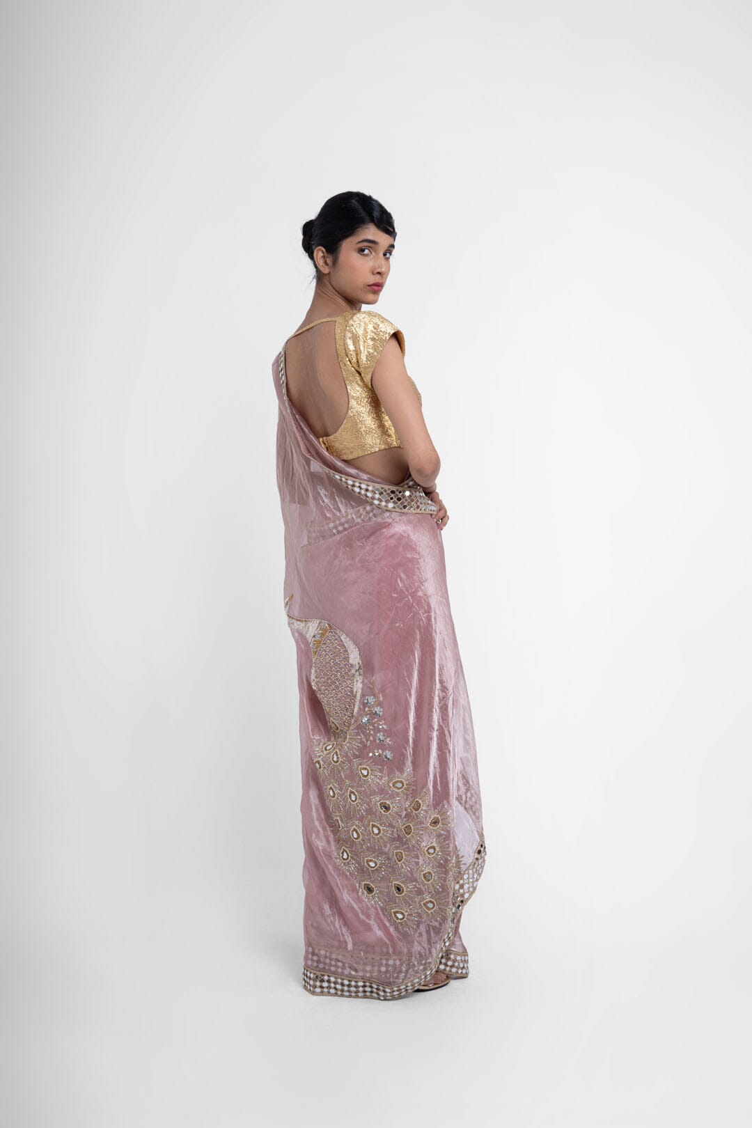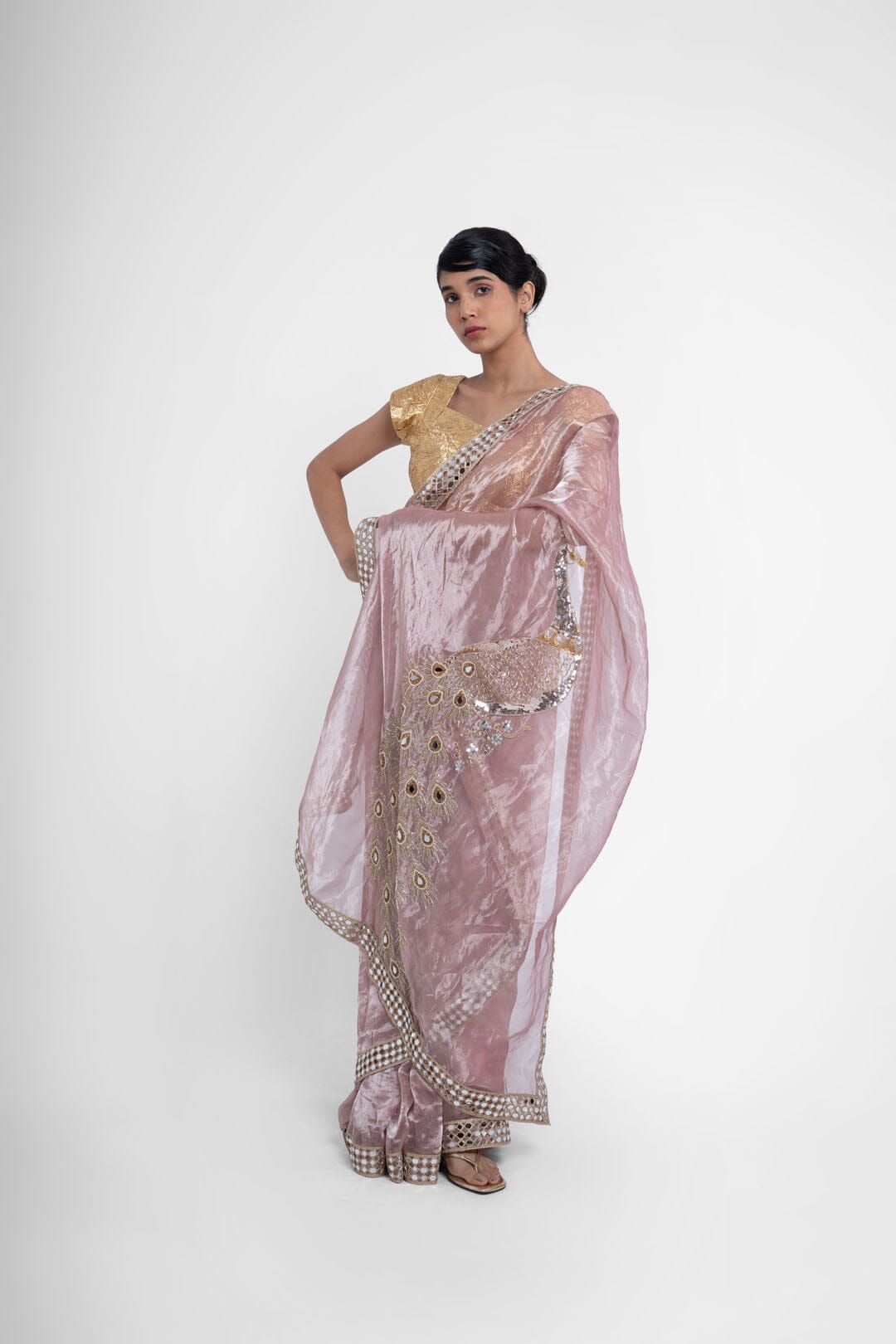 Ruhani pure tissue silk saree in pink has a stunning life-size hand-embroidered peacock on the palla palcement, which takes around 10-15 days to complete.