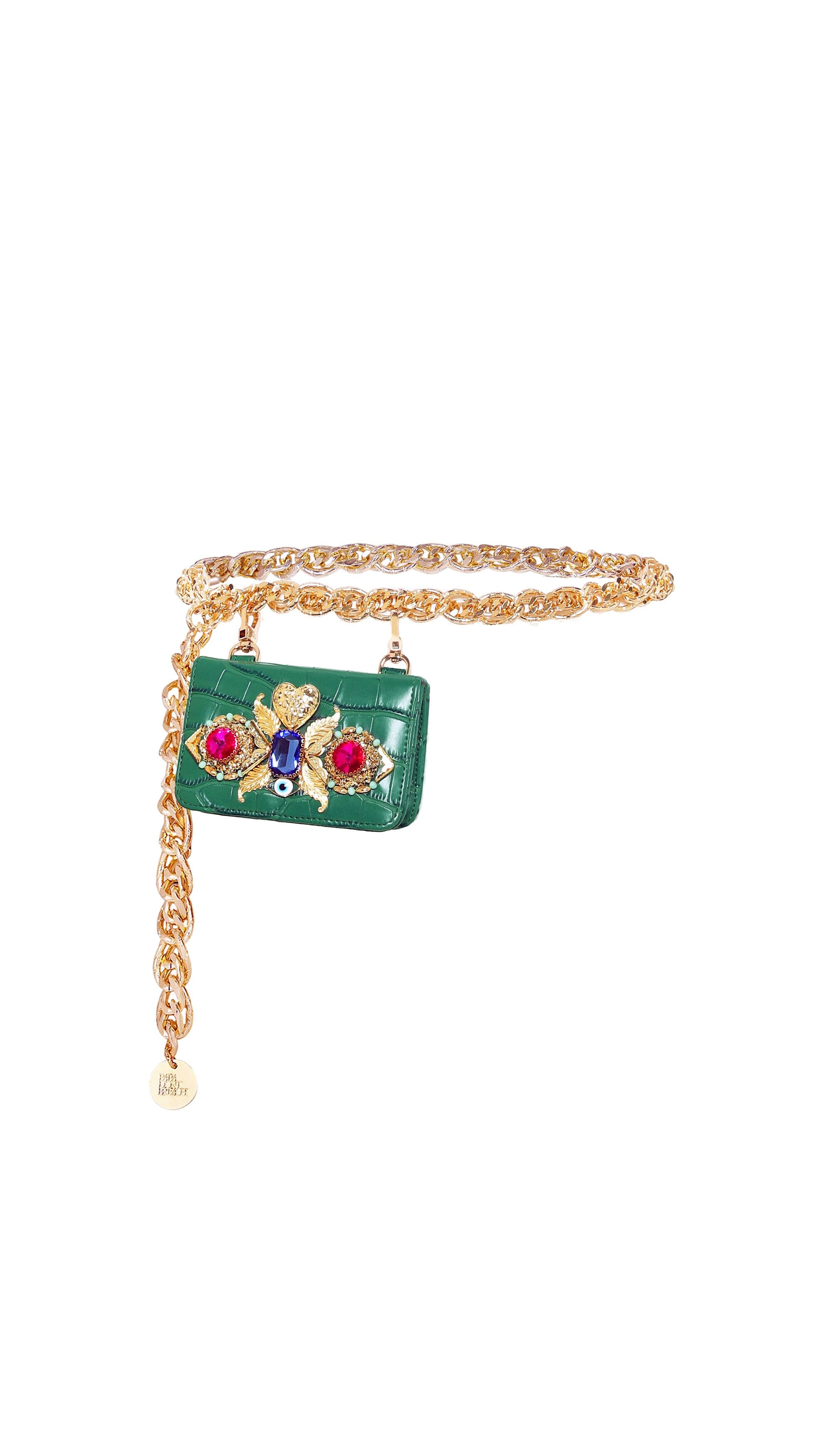 A Sacramento Green Faux Leather Chain-link Belt Bag encrusted with coloured crystal stones & metal ornamental pieces.