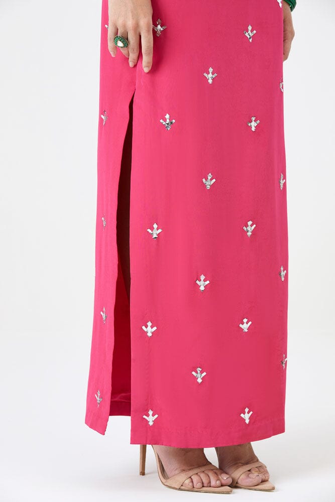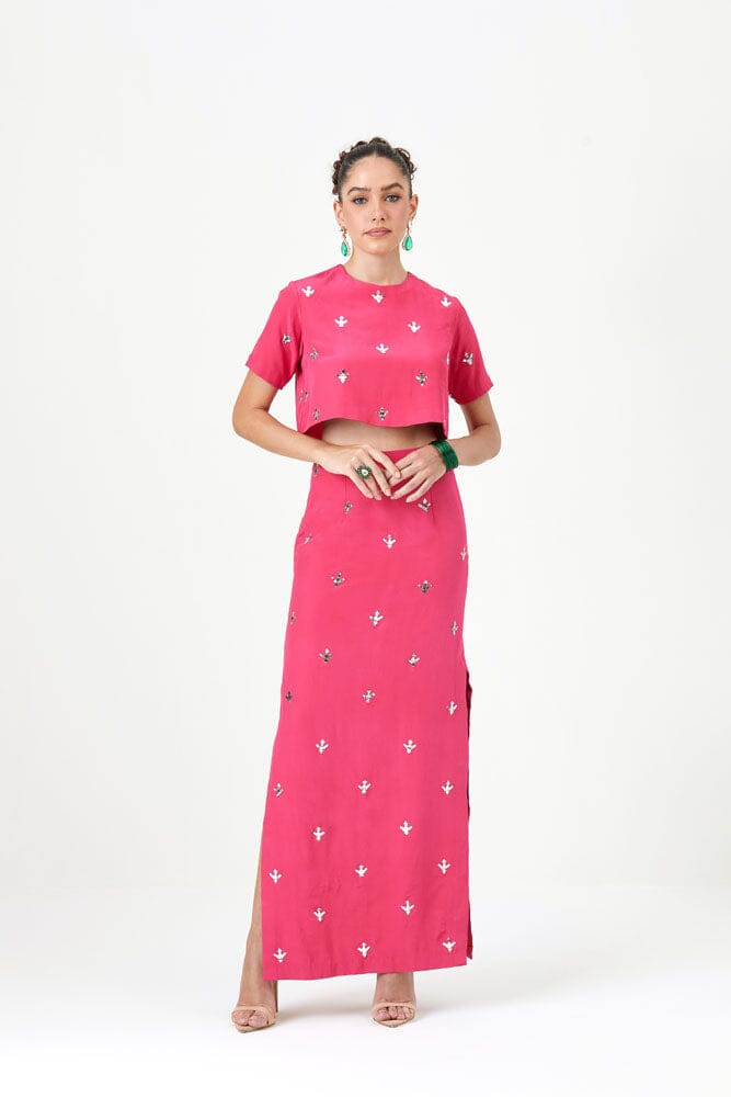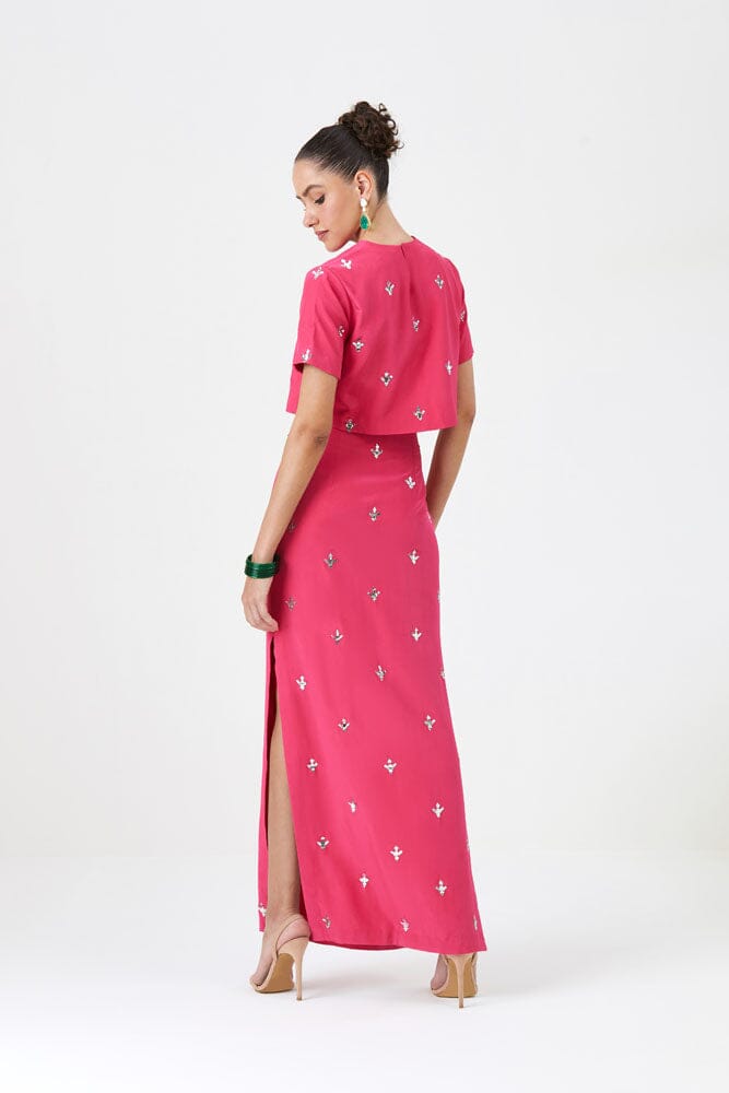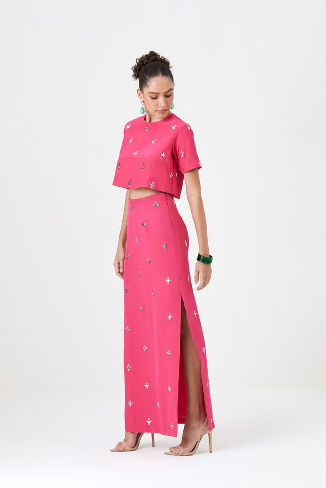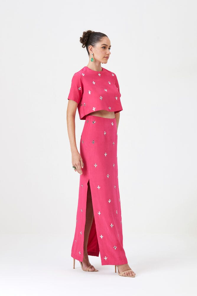 Sakura — where luxury meets the natural flow of crepe silk. This ensemble in a flattering shade of nude, comes with a cropped top and skirt with a modern slit, embellished with Mukaish work, perfect for all your festivities..