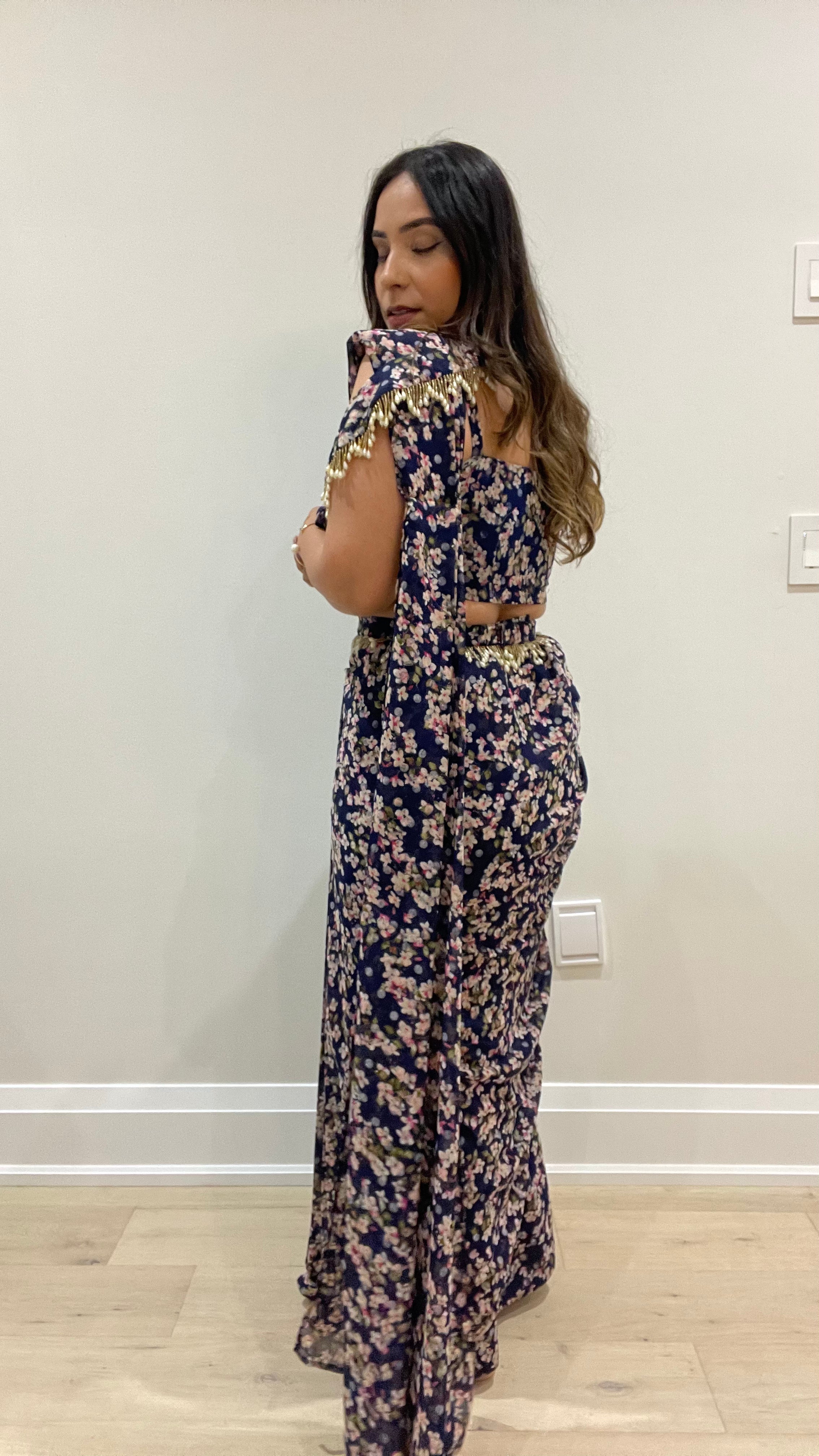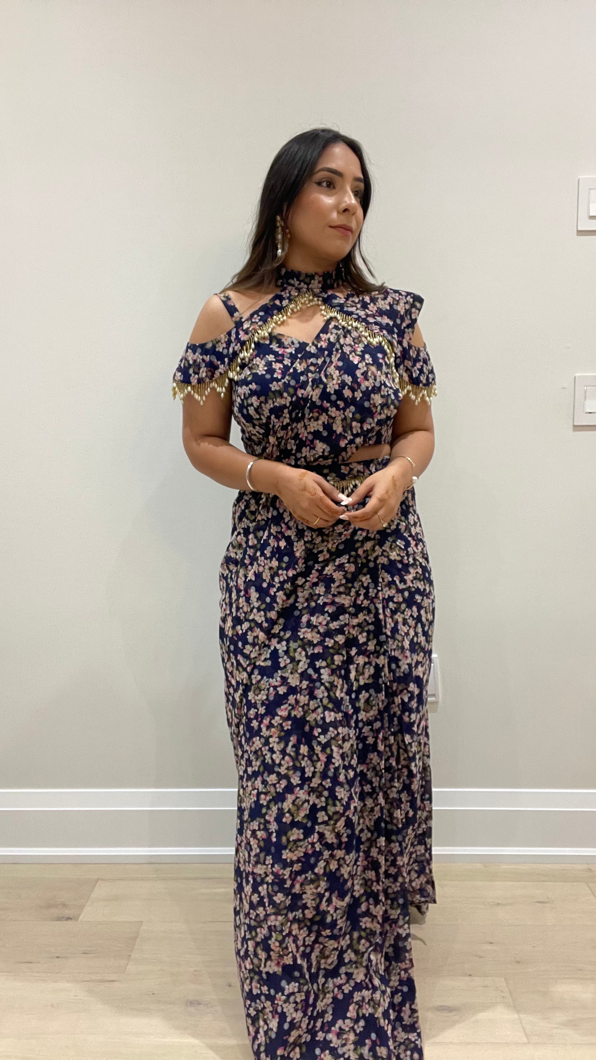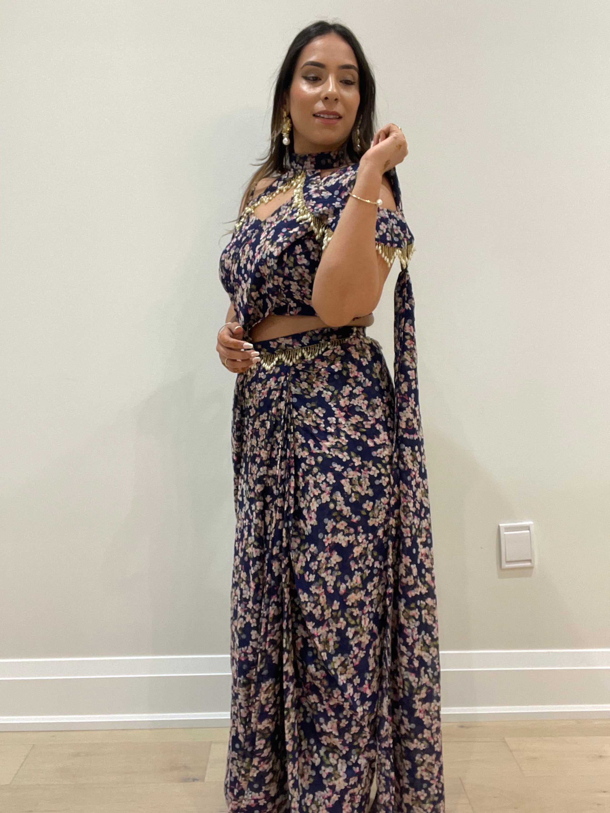 A 4 Piece Pre-Draped Georgette Saree with floral prints. It comes with a detachable belt with pearl hangings and detachable choker cape with pearl hangings.