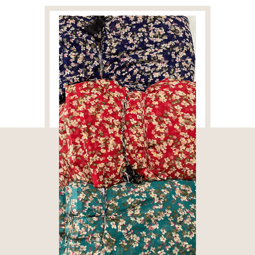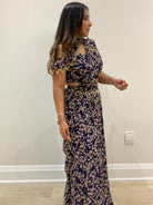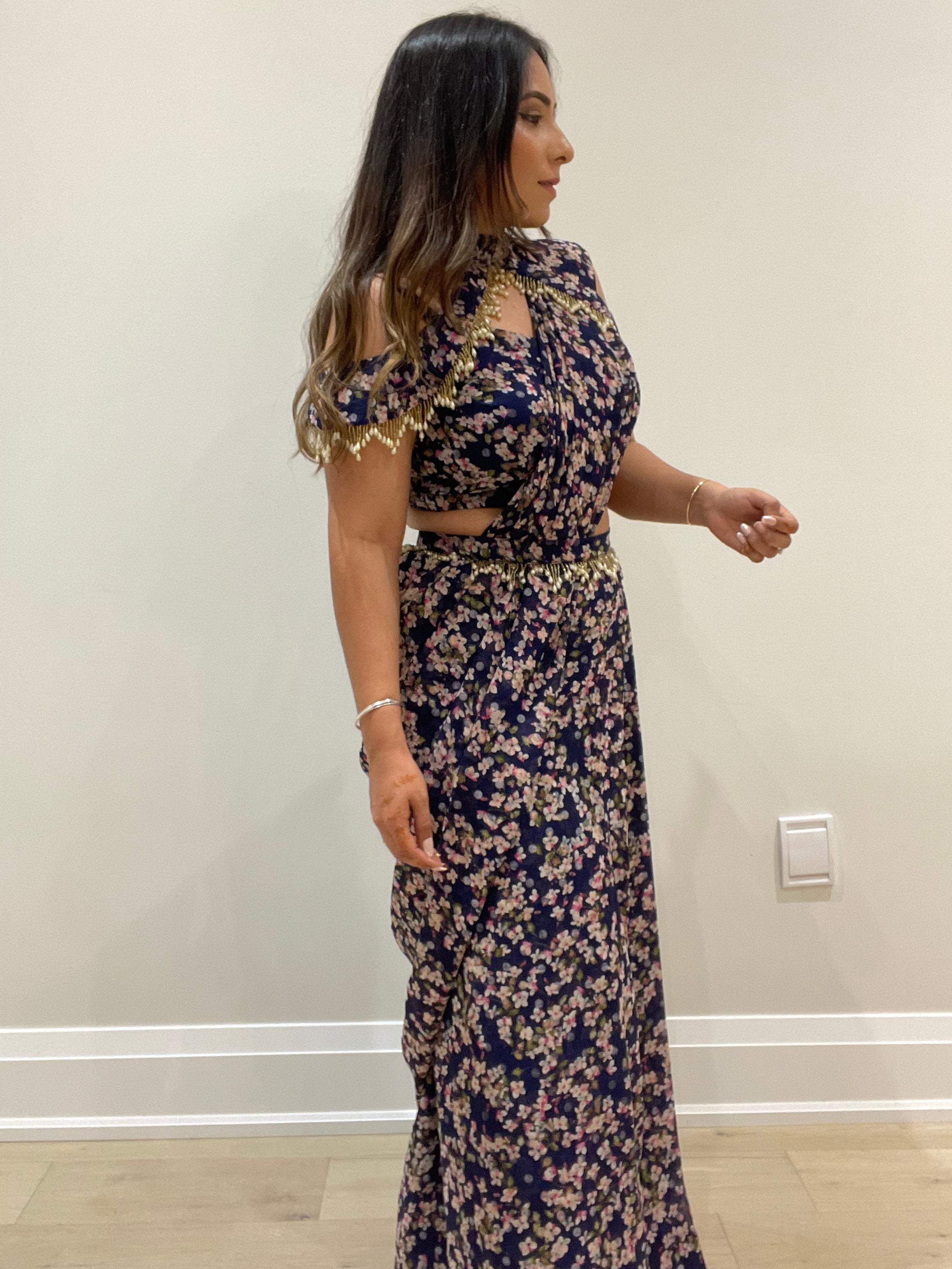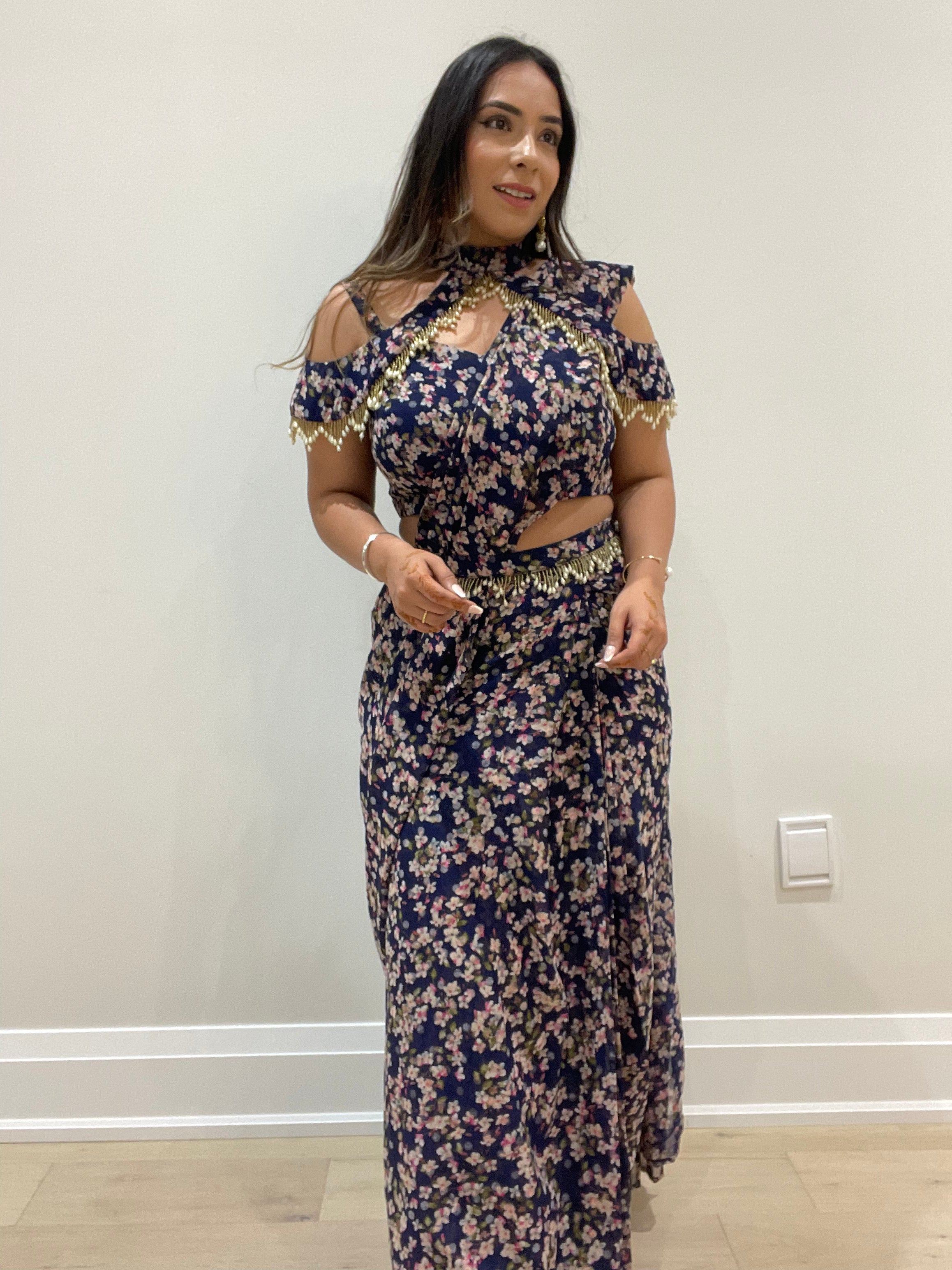 A 4 Piece Pre-Draped Georgette Saree with floral prints. It comes with a detachable belt with pearl hangings and detachable choker cape with pearl hangings.