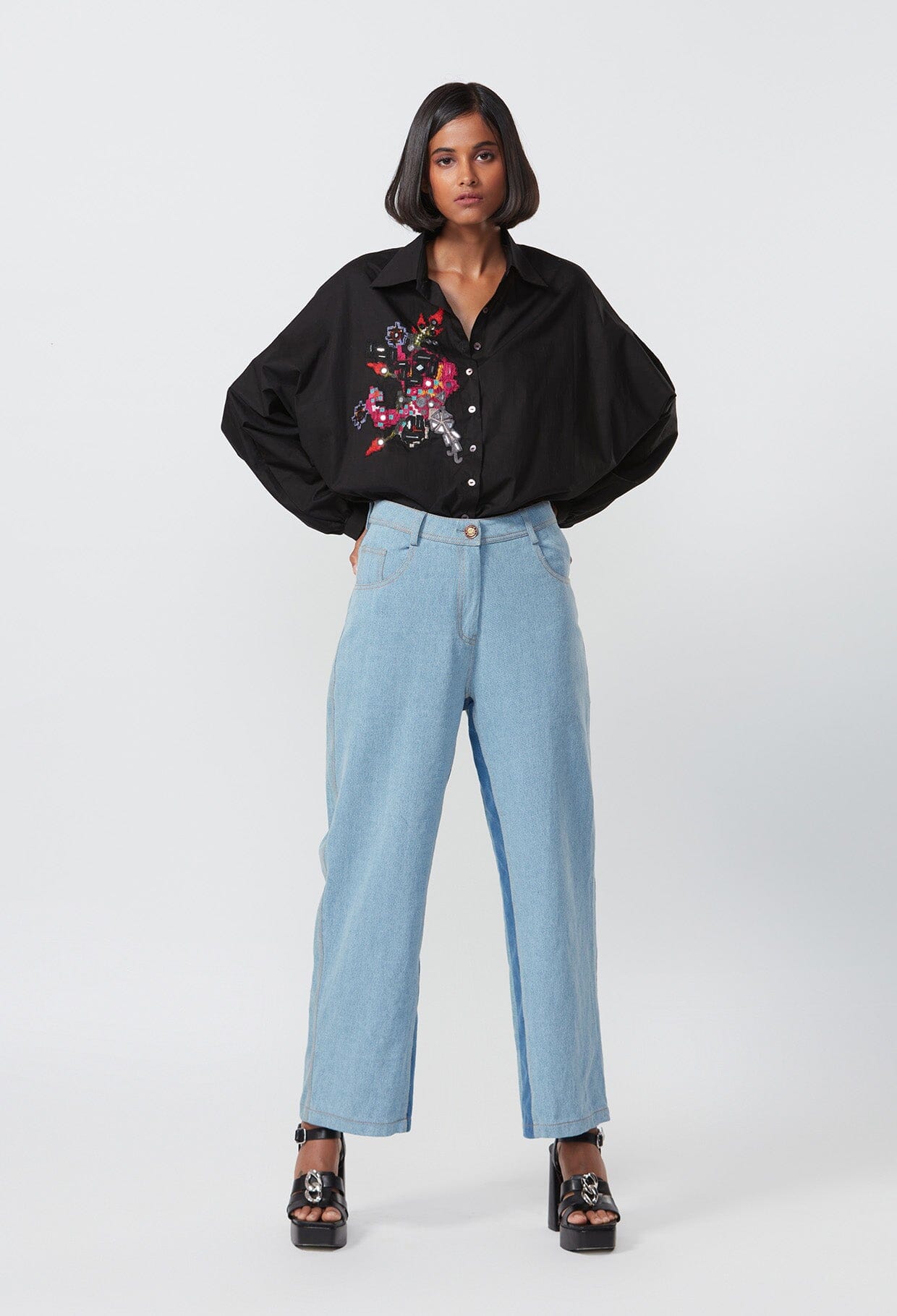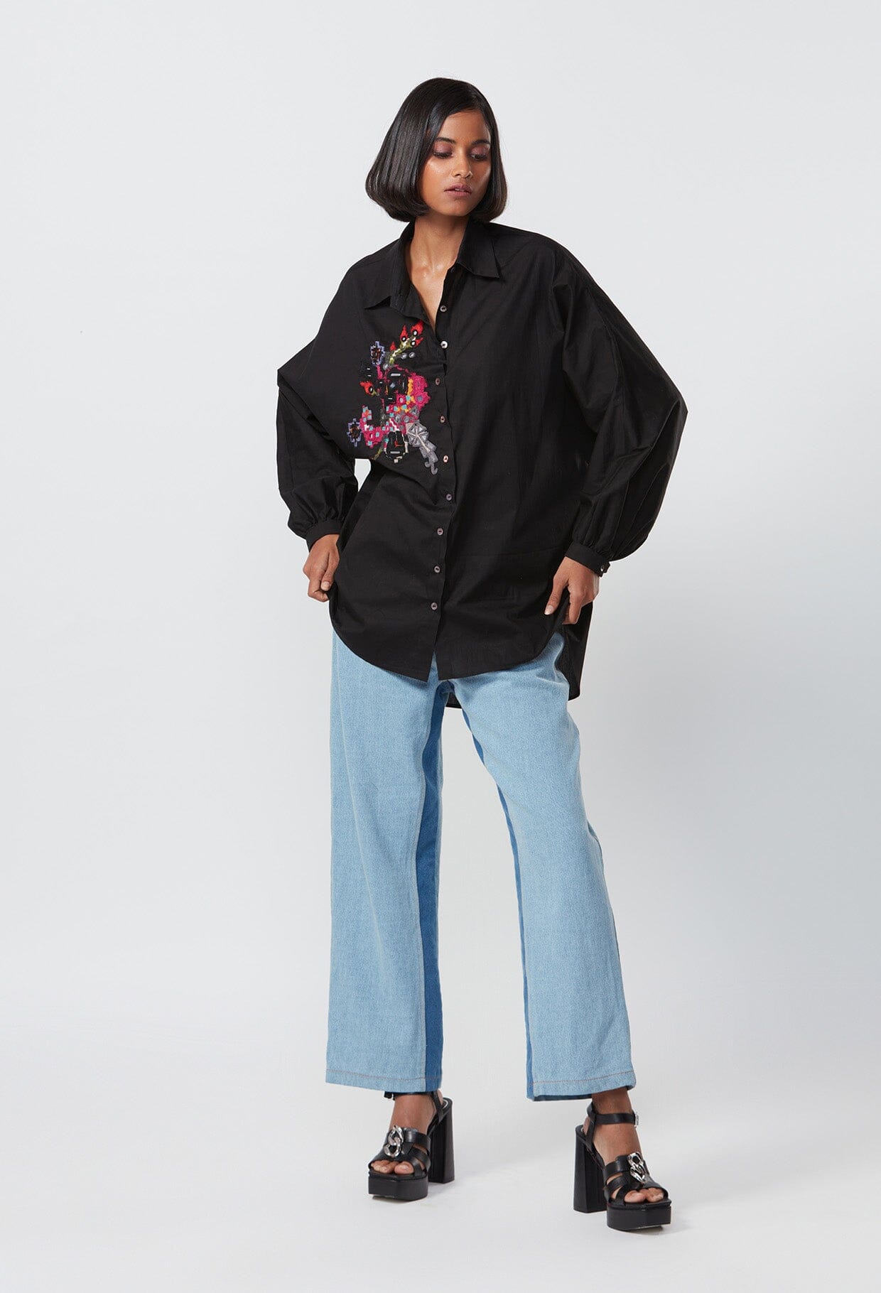 SHIRT : BATWING OVERSIZED SHIRT WITH INTRICATE MIRROR AND THREAD HAND EMBROIDERED MOTIF