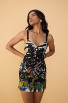 Dress : Abstract Stripe Print Mini Dress With Intricate Hand Embroidered Floral Cutwork Applique Detailing And Side Cut Out Detailing