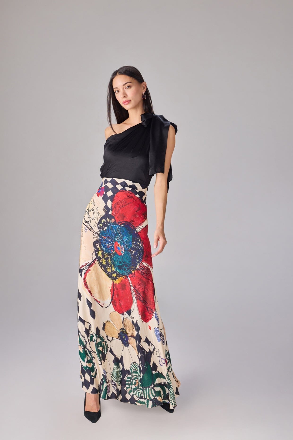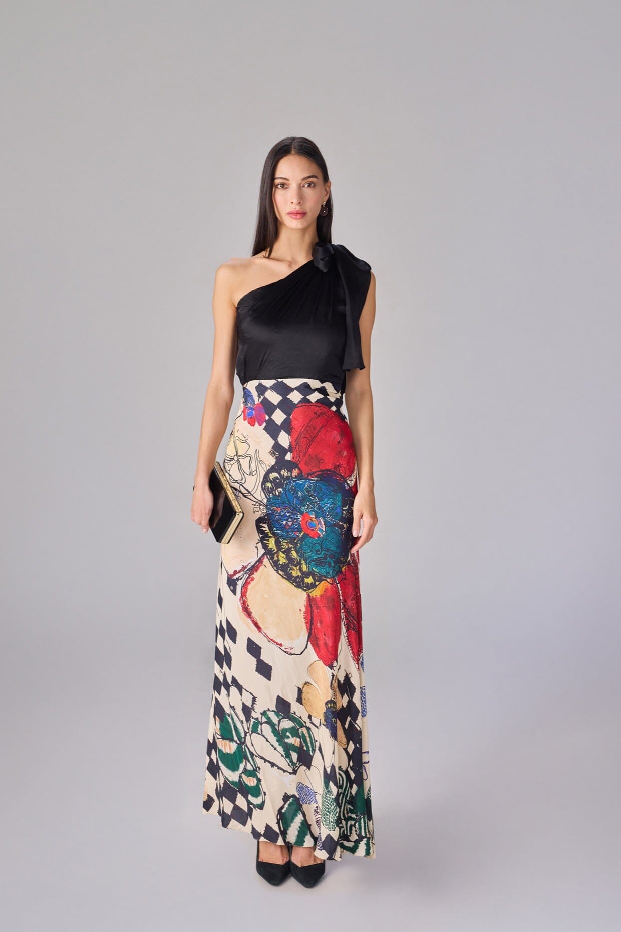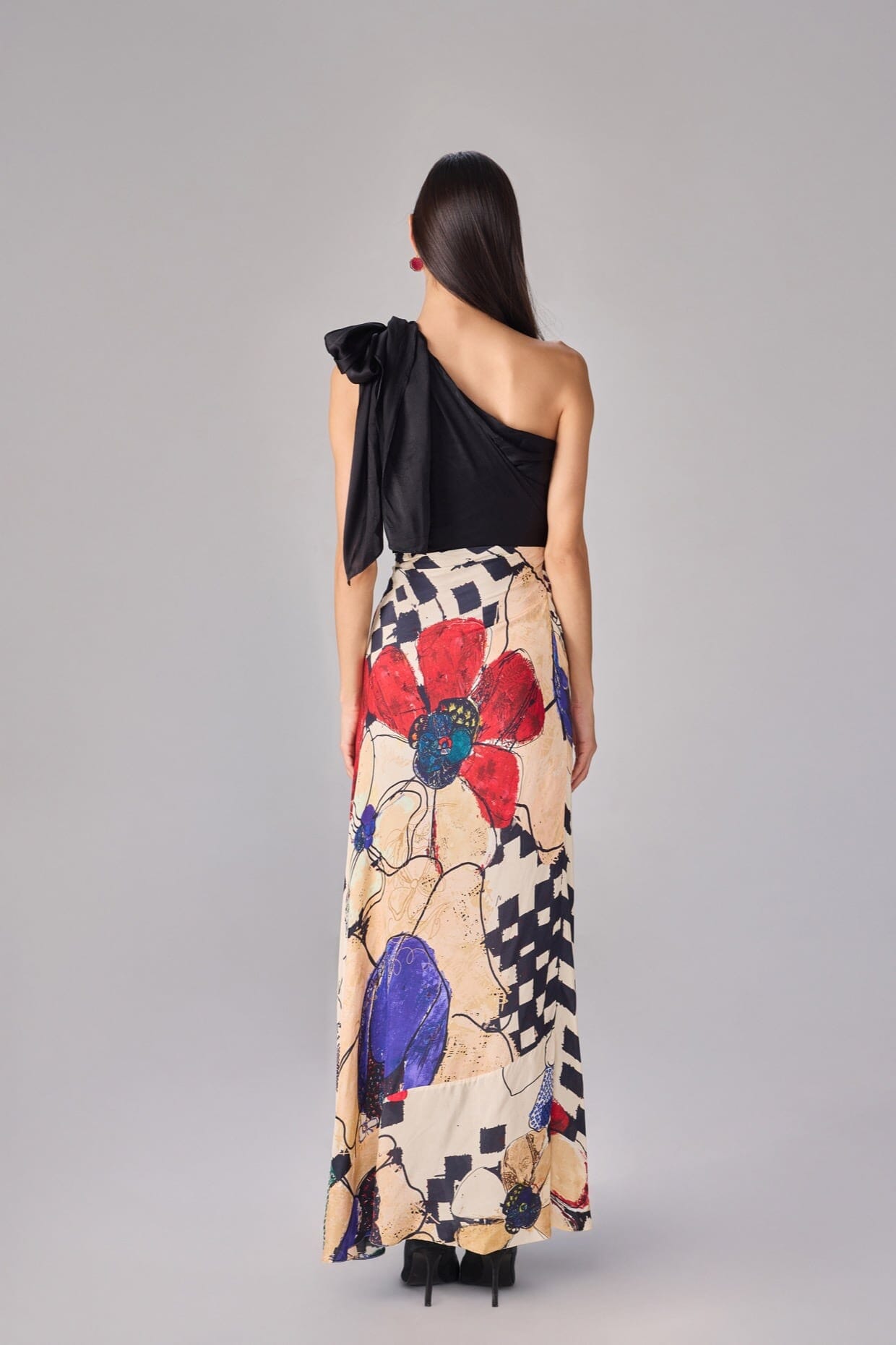 Abstract Floral And Checkered One Shoulder Tie Up Column Dress