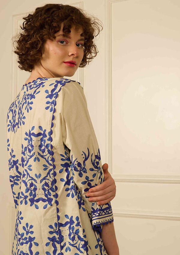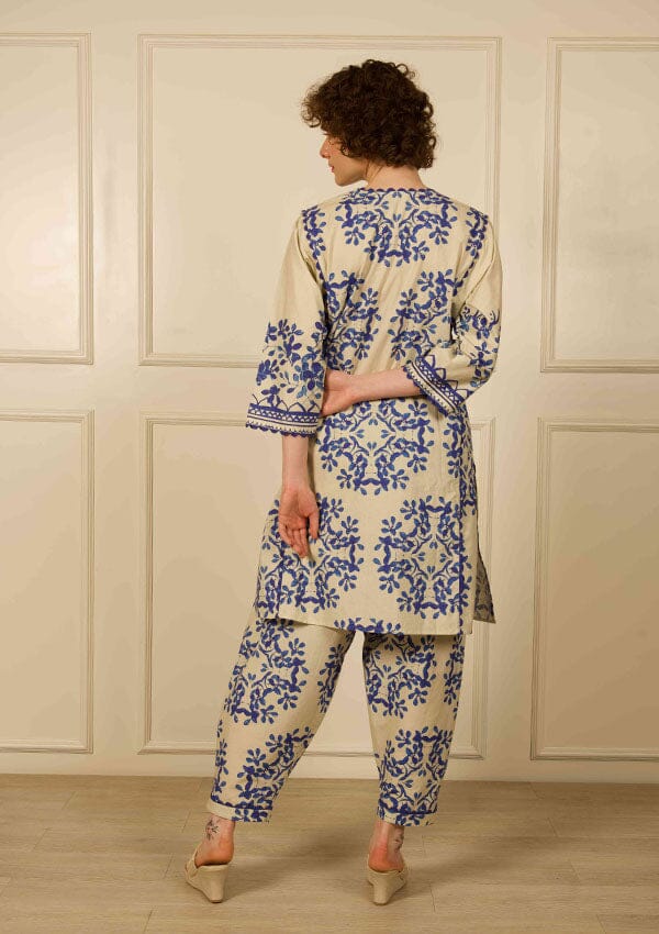 A printed Kalidar style kurta paired with pleated salwar pants. The scallop lace adds to the details. It comes as a co-ordinated set of 2.