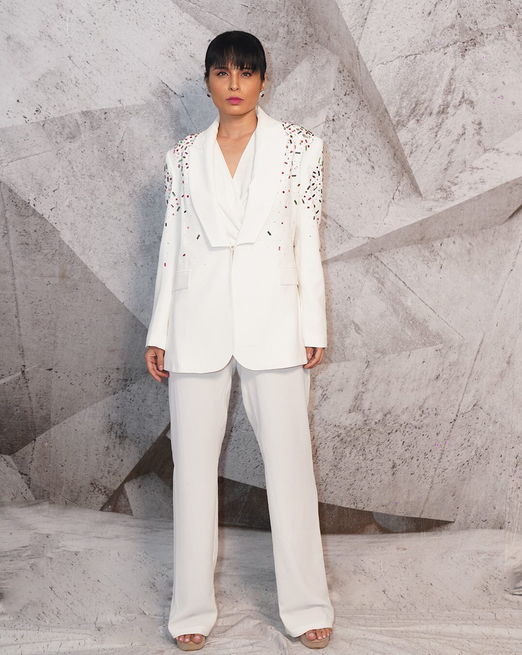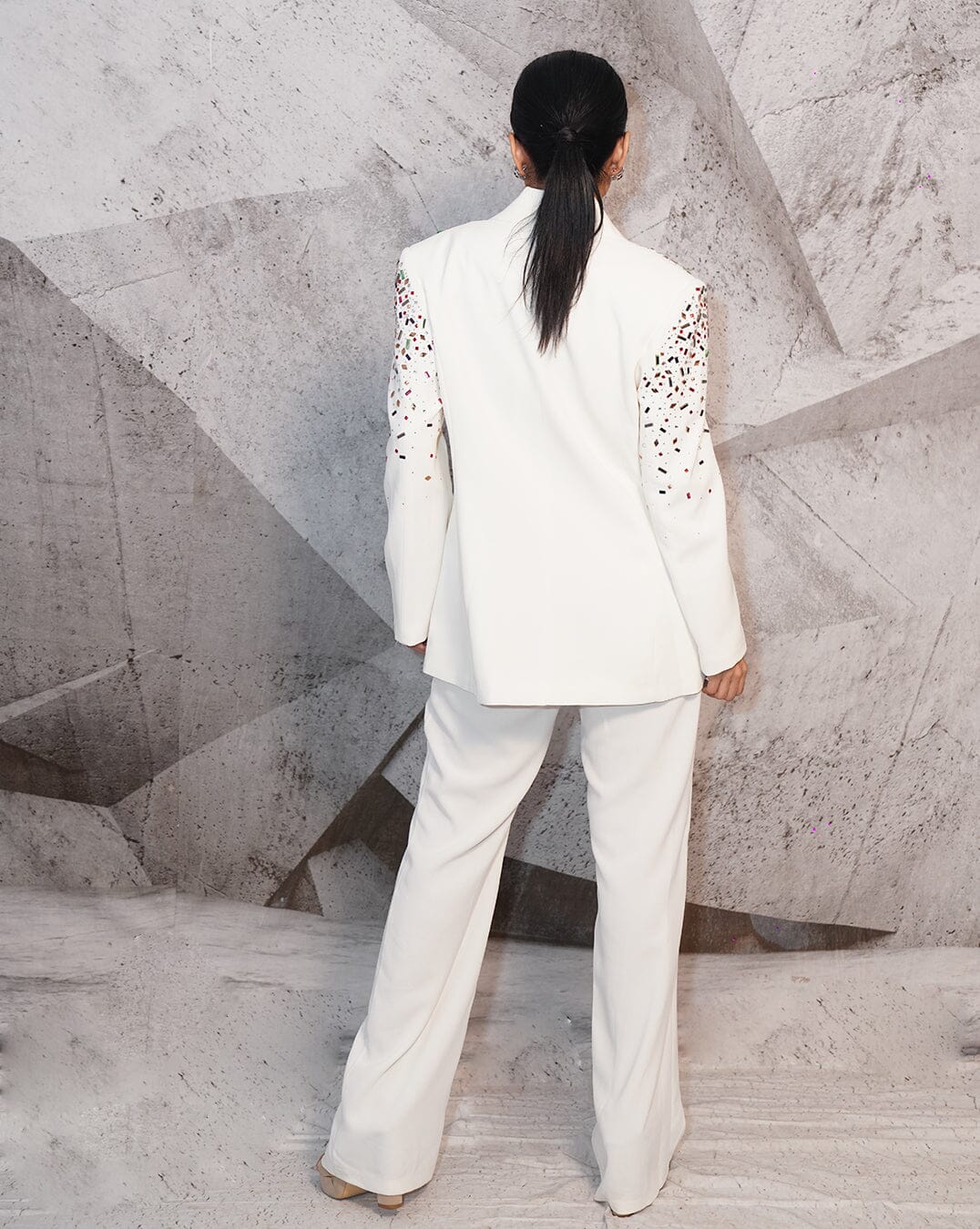 Enveloped between the graceful hues of ivory and the colourful embroidery lies this blazer set. The blazer is adorned with 3D colourful sequin stones embroidery to add a pop of colour and style.