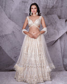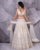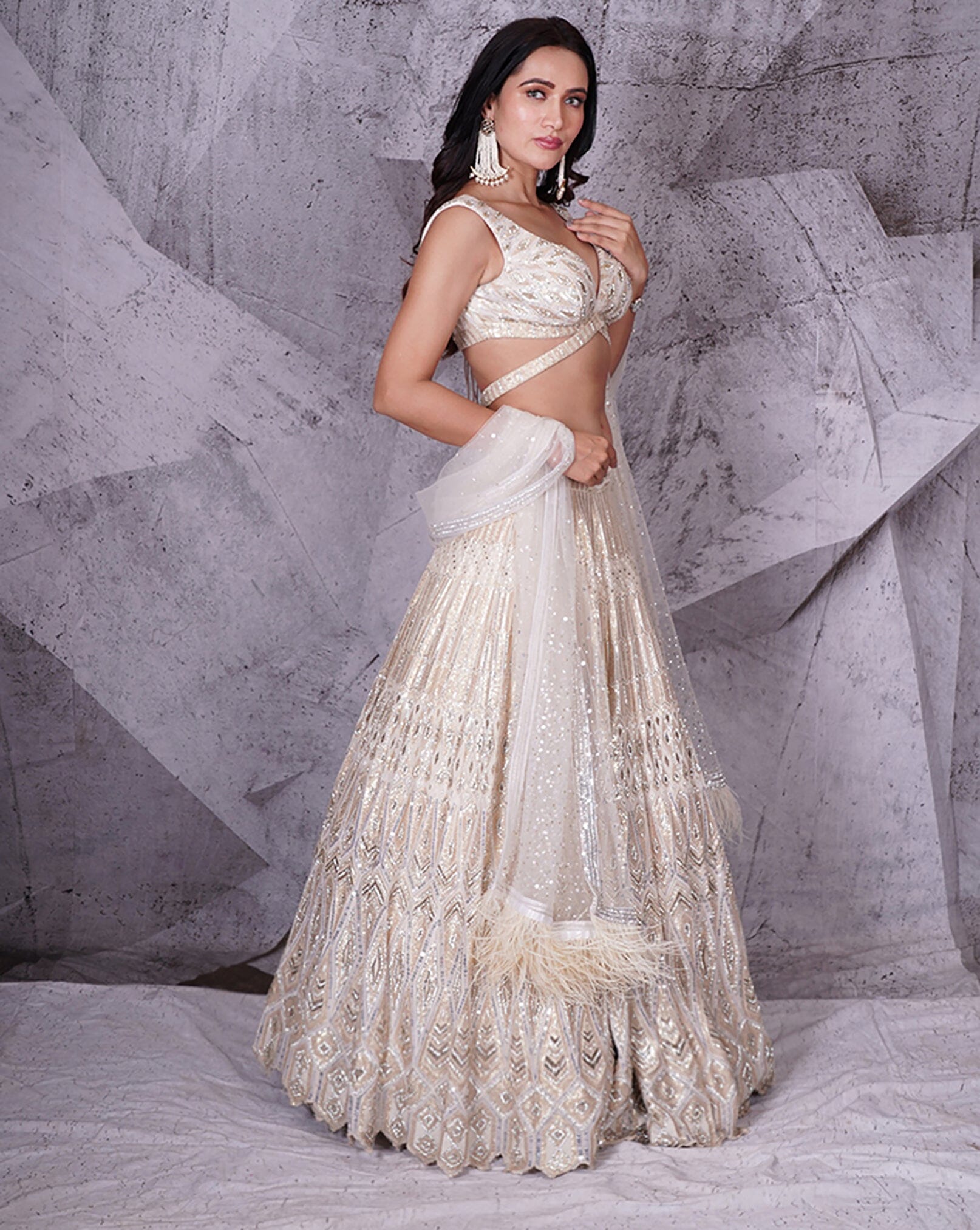 Enveloped between the graceful hues of ivory and shimmering geometric embroidery work lies this beautiful lehenga. The blouse is embroidered with lucknowi thread work which is highlighted with stones and kardanas and is adorned with feathers on the sleeves. The lucknowi embellished lehenga is the perfect mix of shine with a contemporary feel. The outfit is paired with a coordinated dupatta with feathers to complete the look.