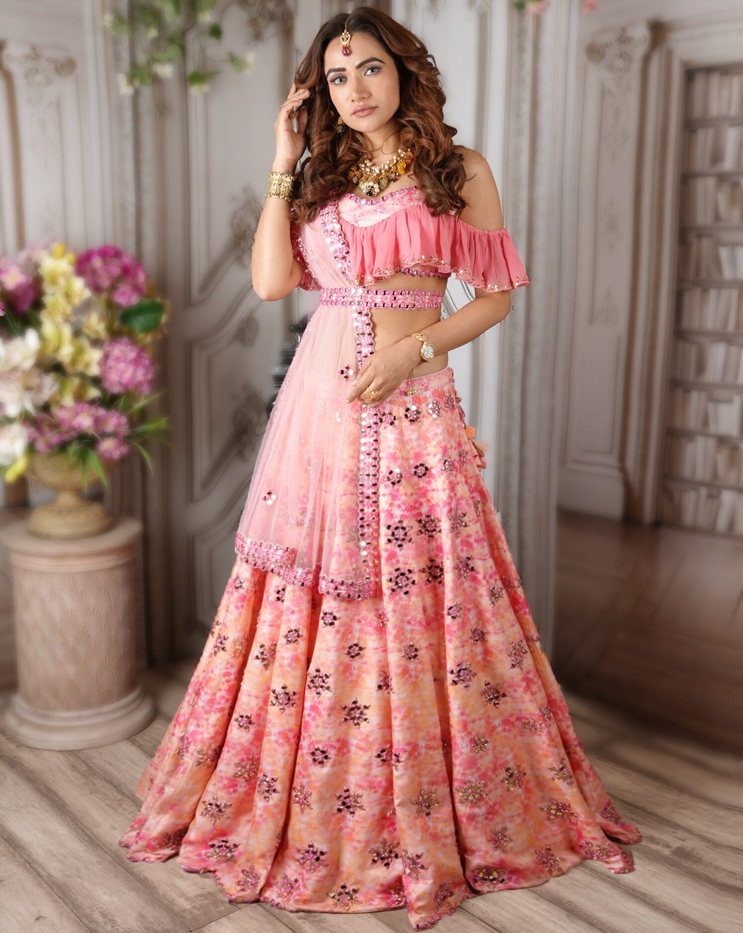 Enveloped between tie dye pink hues and reflective mirror work lies this Tal Dal Lehenga. This digital lehenga is embroidered with mirror and resham work. It’s paired with ruffle contemporary blouse, a net dupatta and an embellished belt. We can customize the blouse style and the outfit colour for you.