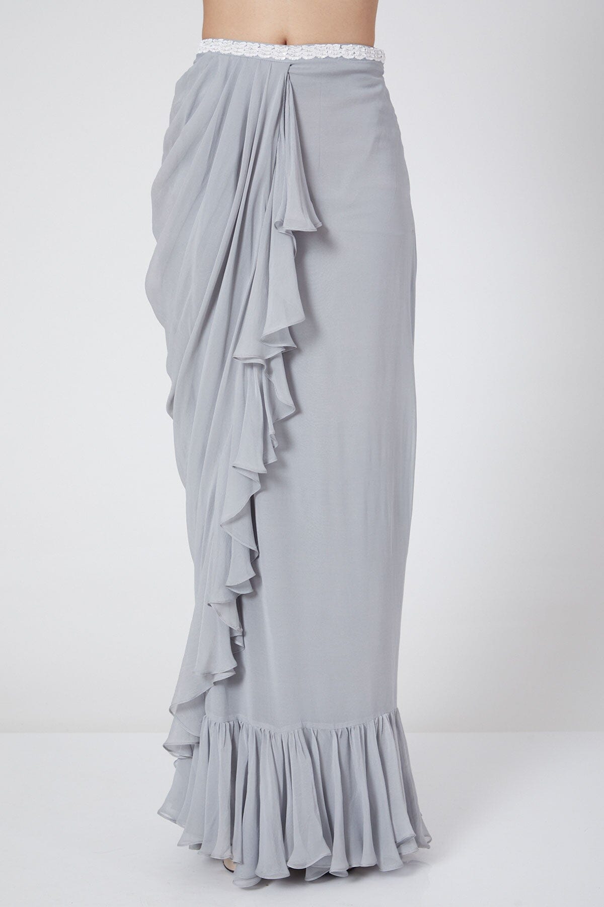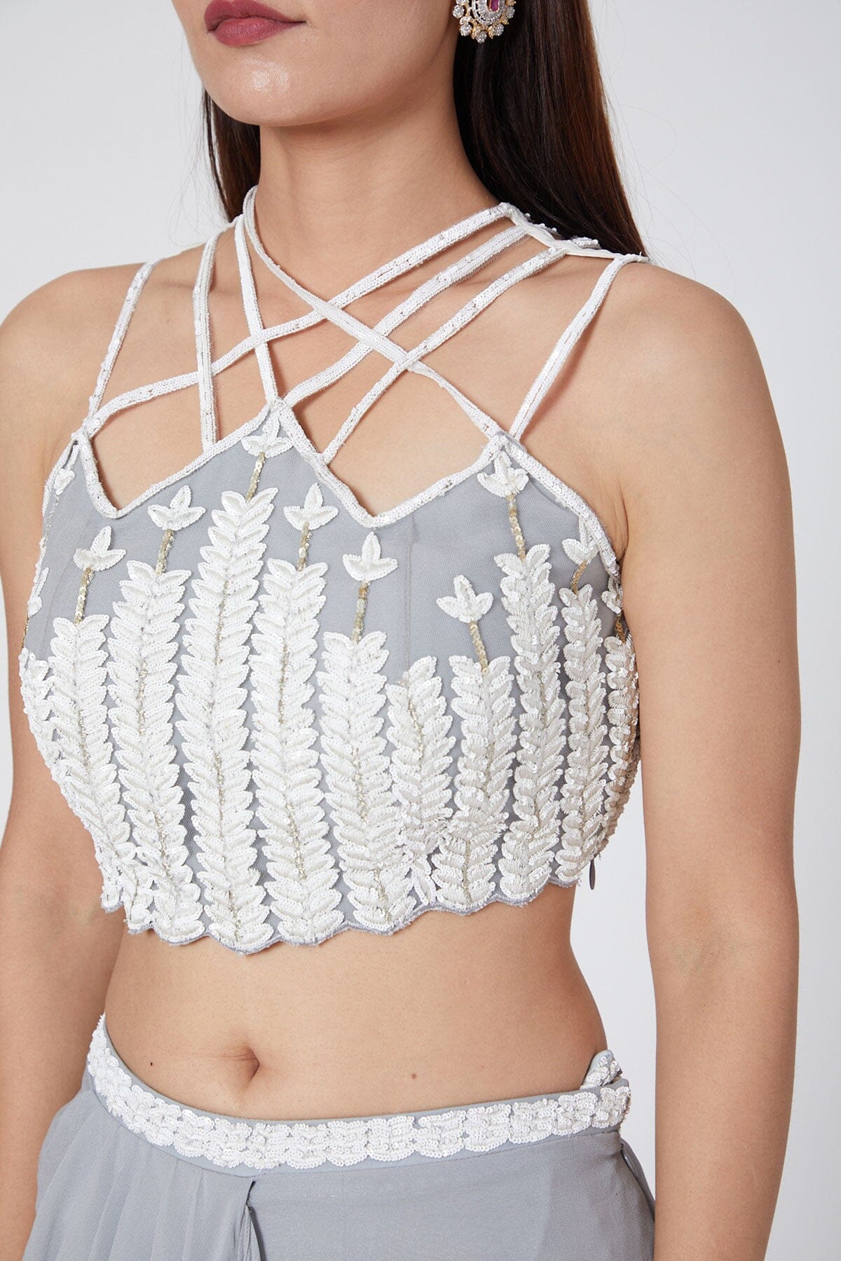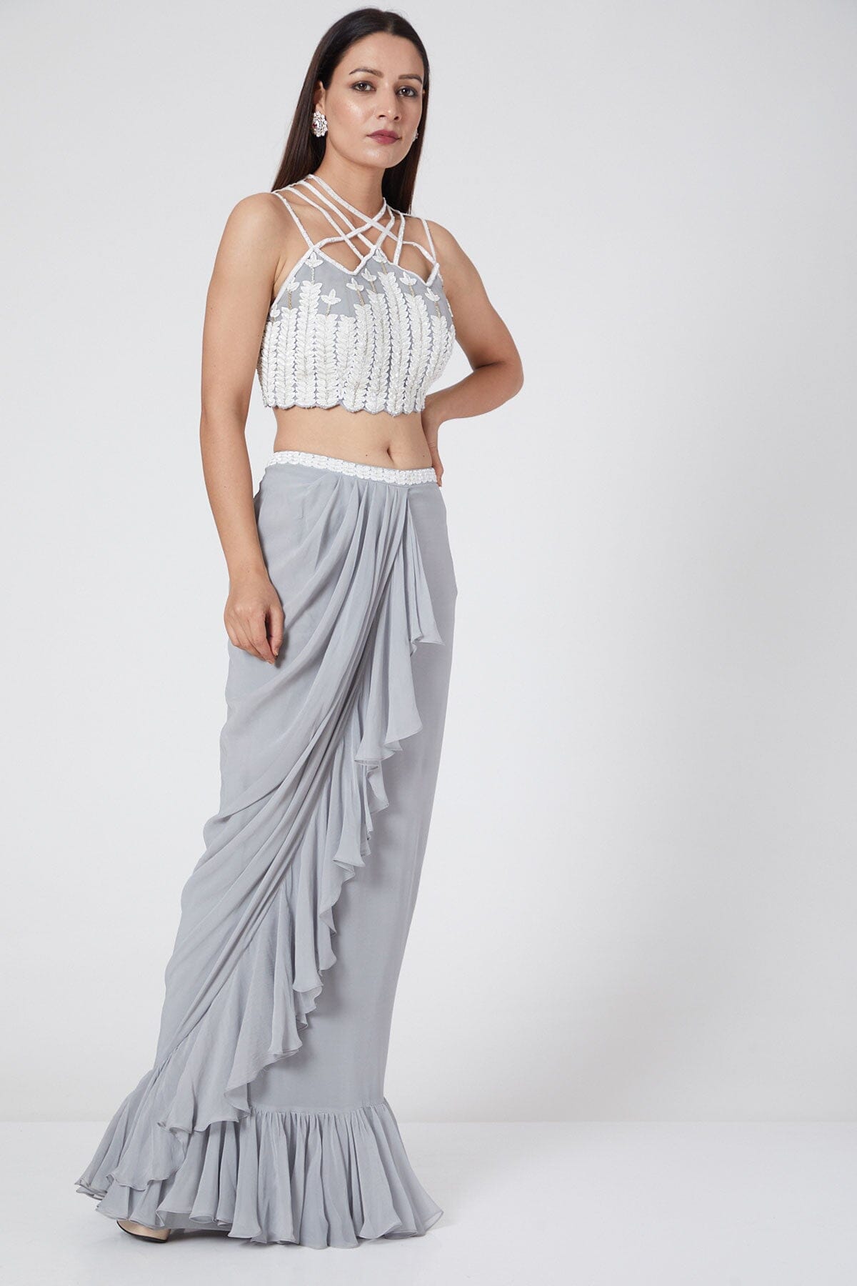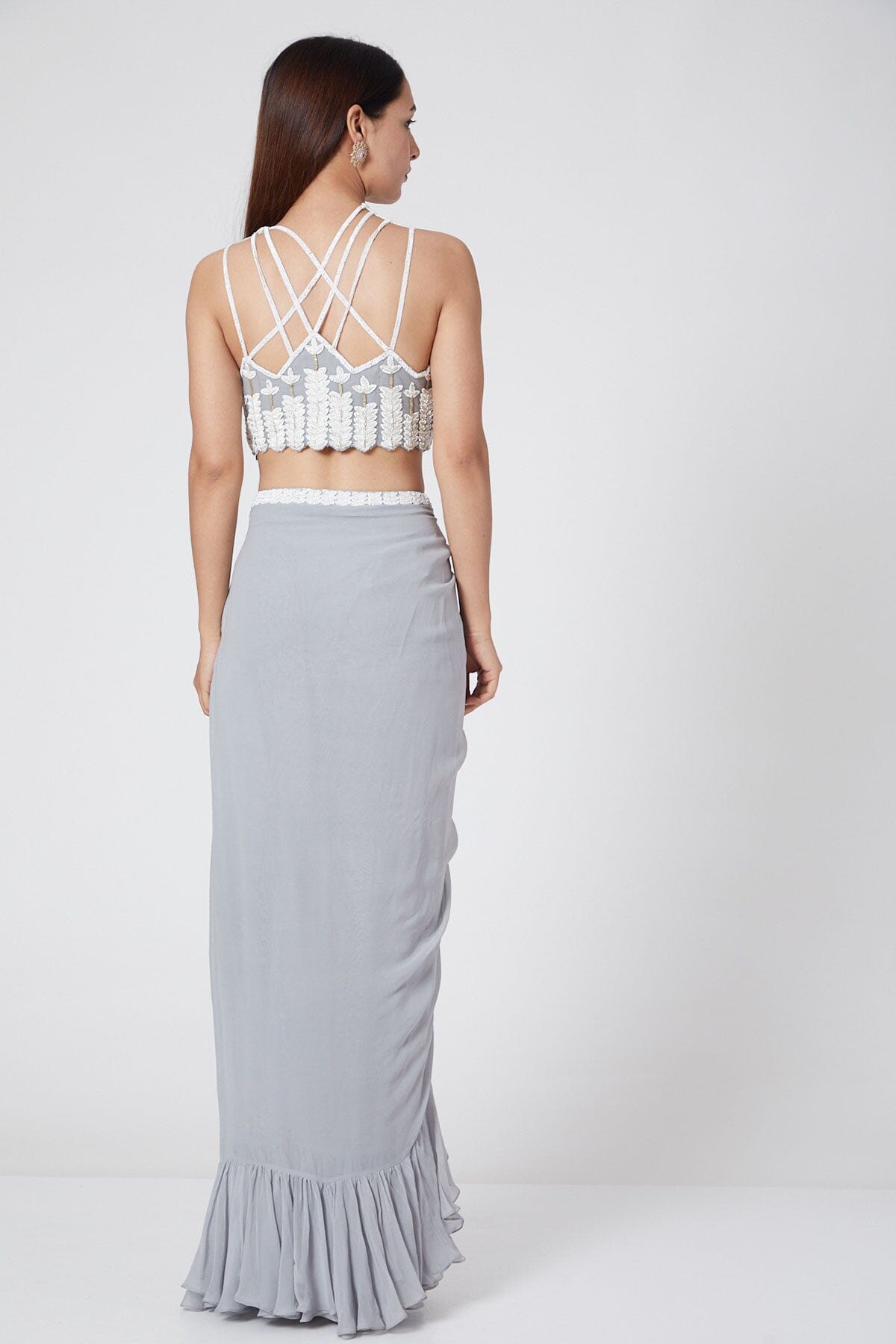 Crisscross Crop Top Blends Well With Ruffled Skirt To Redefine Glamour And Charm. Embellishments Over The Top Are Intricate And Make It Fascinating. The Elegant Ensemble Is Crafted Using Silk And Georgette.