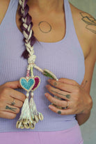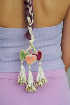 Hand embroidered badla threadwork hearts complimented with gota lace and cowries stringed together into a cute parandi.