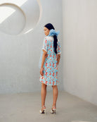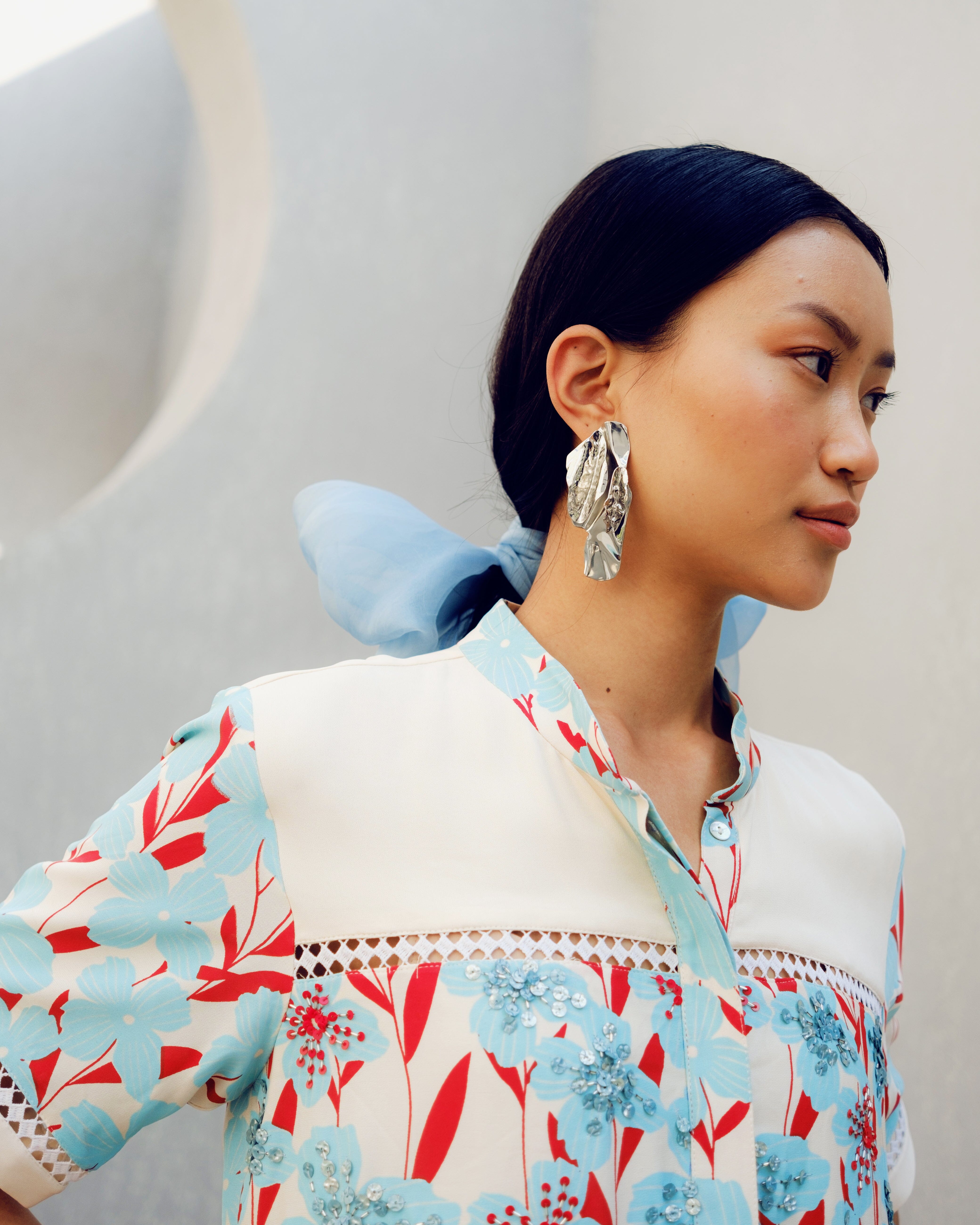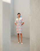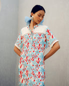 The White Print Play is made of double georgette. It features a mandarin collar, floral prints and a contrasting white patch on the bodice.